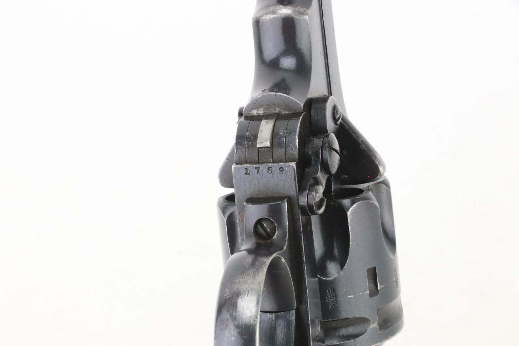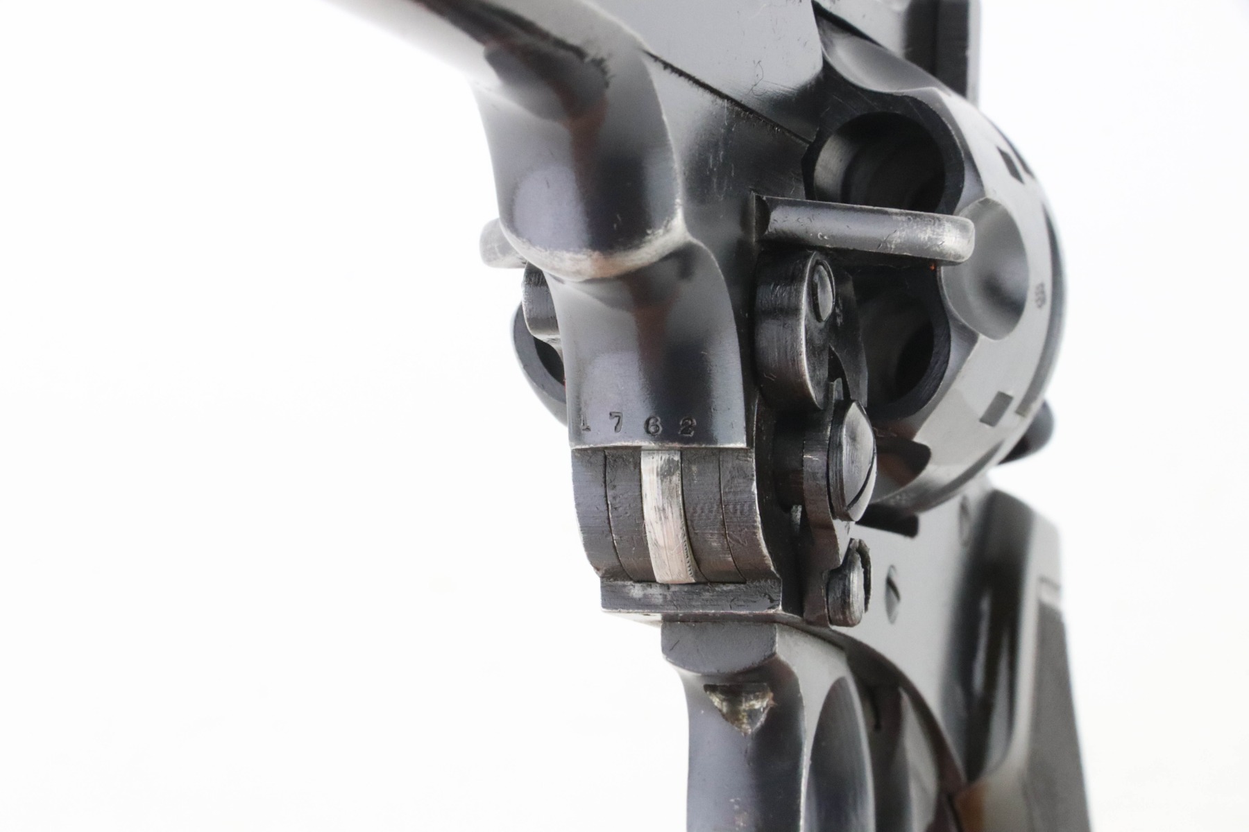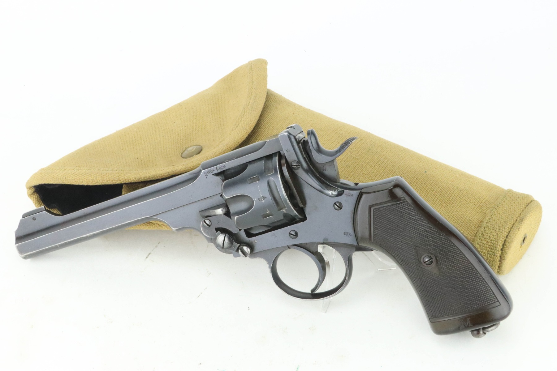 9/5/24 – This is a very nice example of an all original and matching Webley Mark VI revolver, manufactured in 1922 for the British Army. All matching with the proper British proofs. There were approximately 27,600 of these revolvers produced, from 1921-1926. This one comes as a rig with a canvas holster. The holster has a leather belt loop, and black felt has been added to the interior. This one has retained about 94% of its original finish with general high edge wear, thinning on the front strap, and a spot of wear on the underside of the trigger guard. Fitted with bakelite grips – marked “M”. Minty bore.