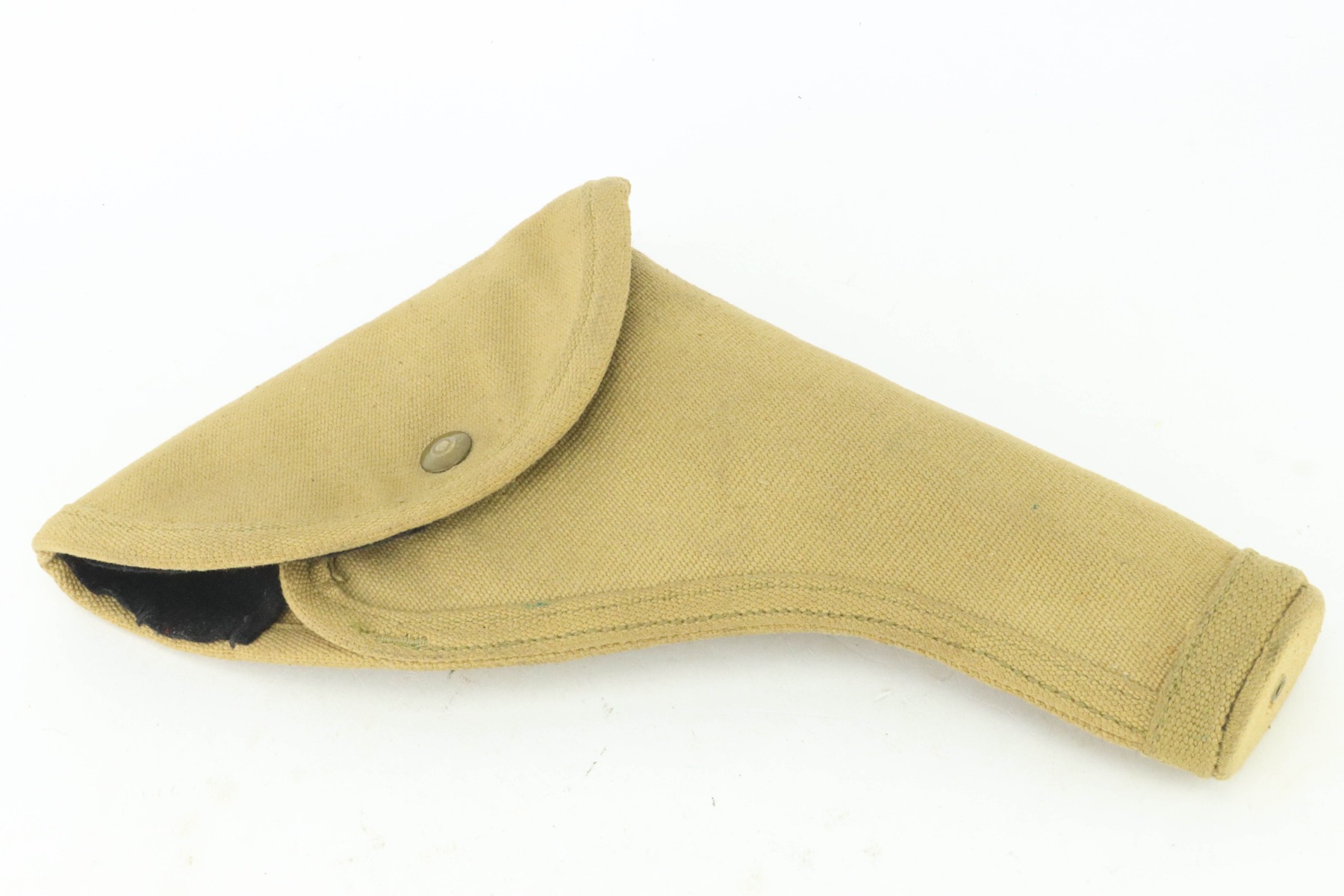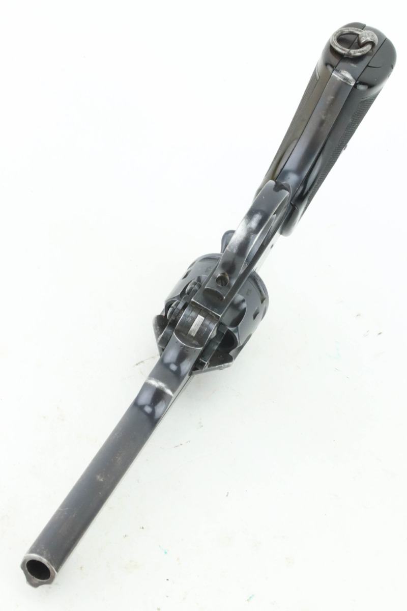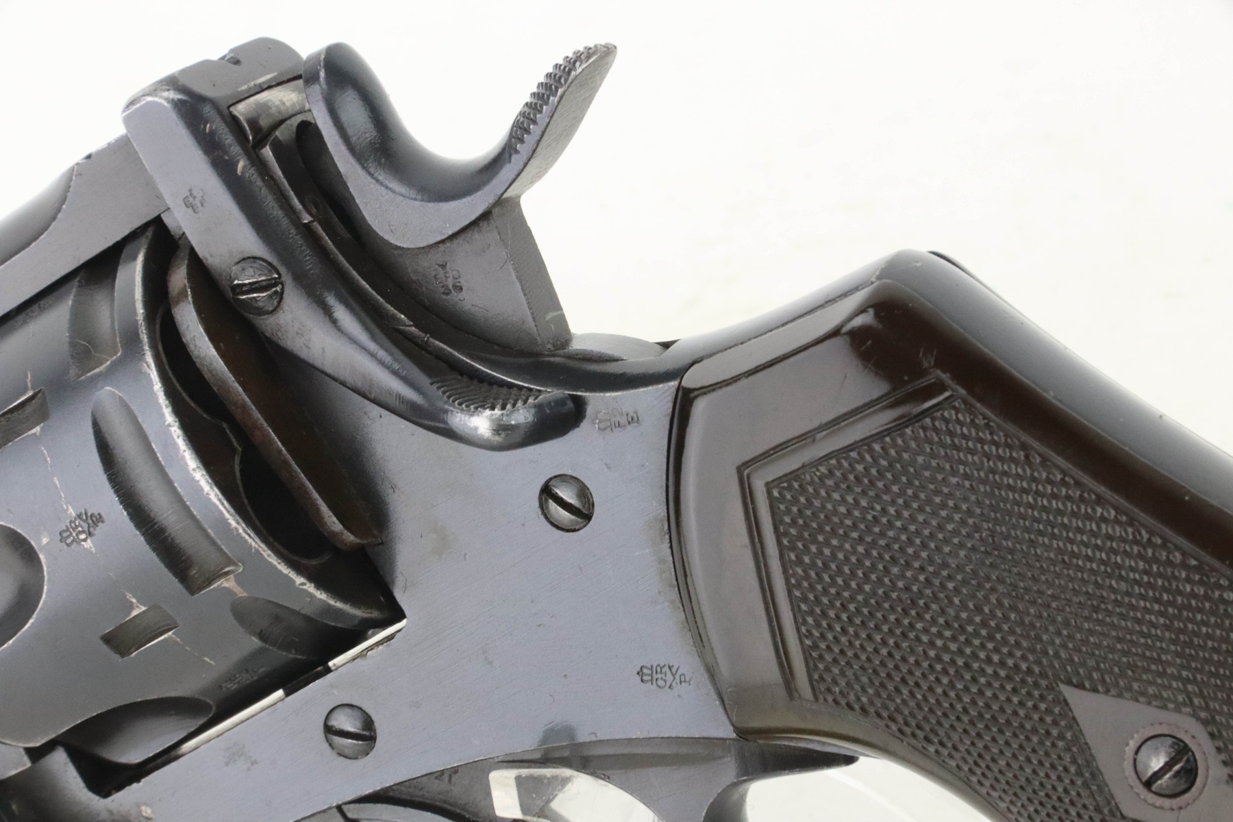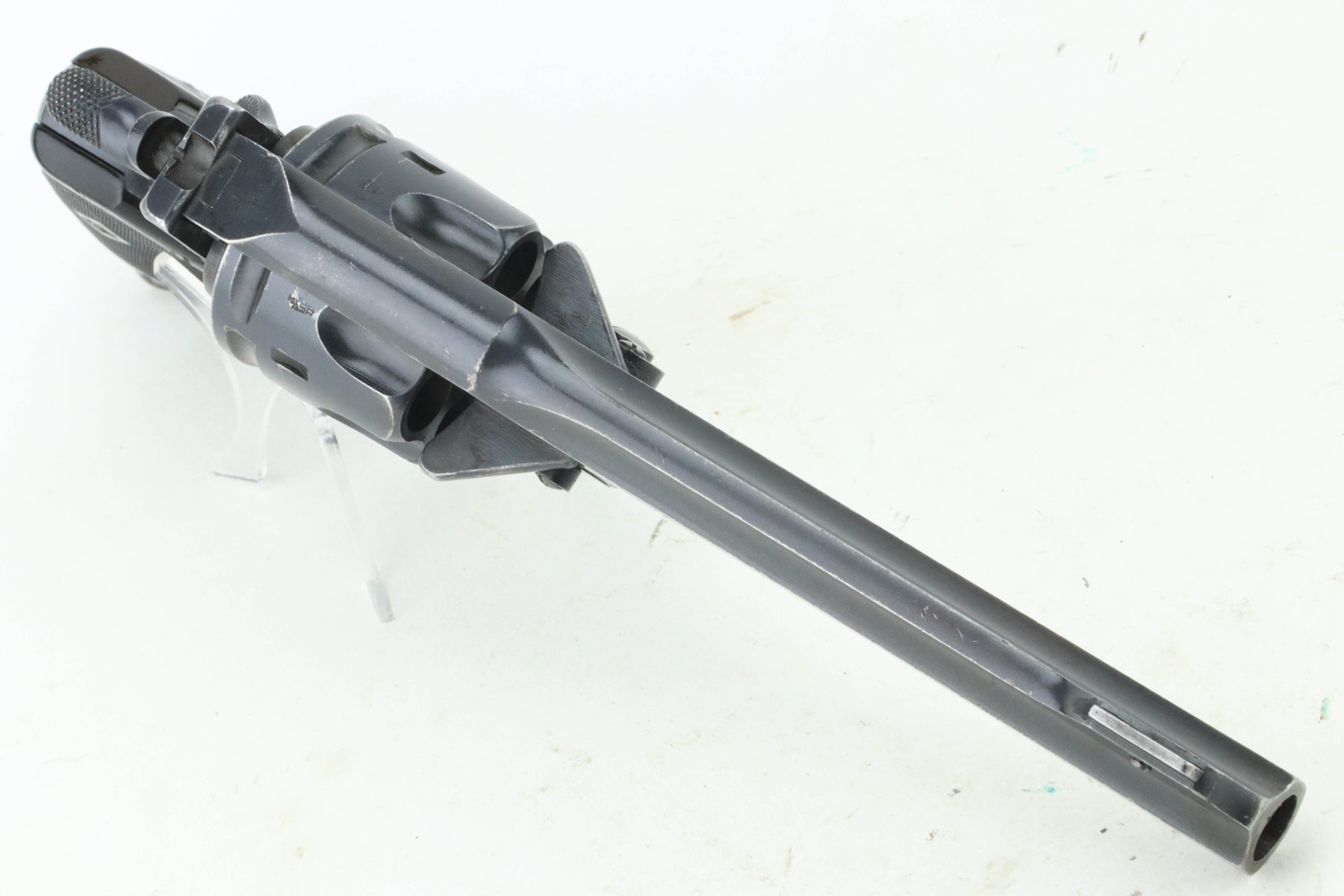 9/5/24 – This is a very nice example of an all original and matching Webley Mark VI revolver, manufactured in 1922 for the British Army. All matching with the proper British proofs. There were approximately 27,600 of these revolvers produced, from 1921-1926. This one comes as a rig with a canvas holster. The holster has a leather belt loop, and black felt has been added to the interior. This one has retained about 94% of its original finish with general high edge wear, thinning on the front strap, and a spot of wear on the underside of the trigger guard. Fitted with bakelite grips – marked “M”. Minty bore.