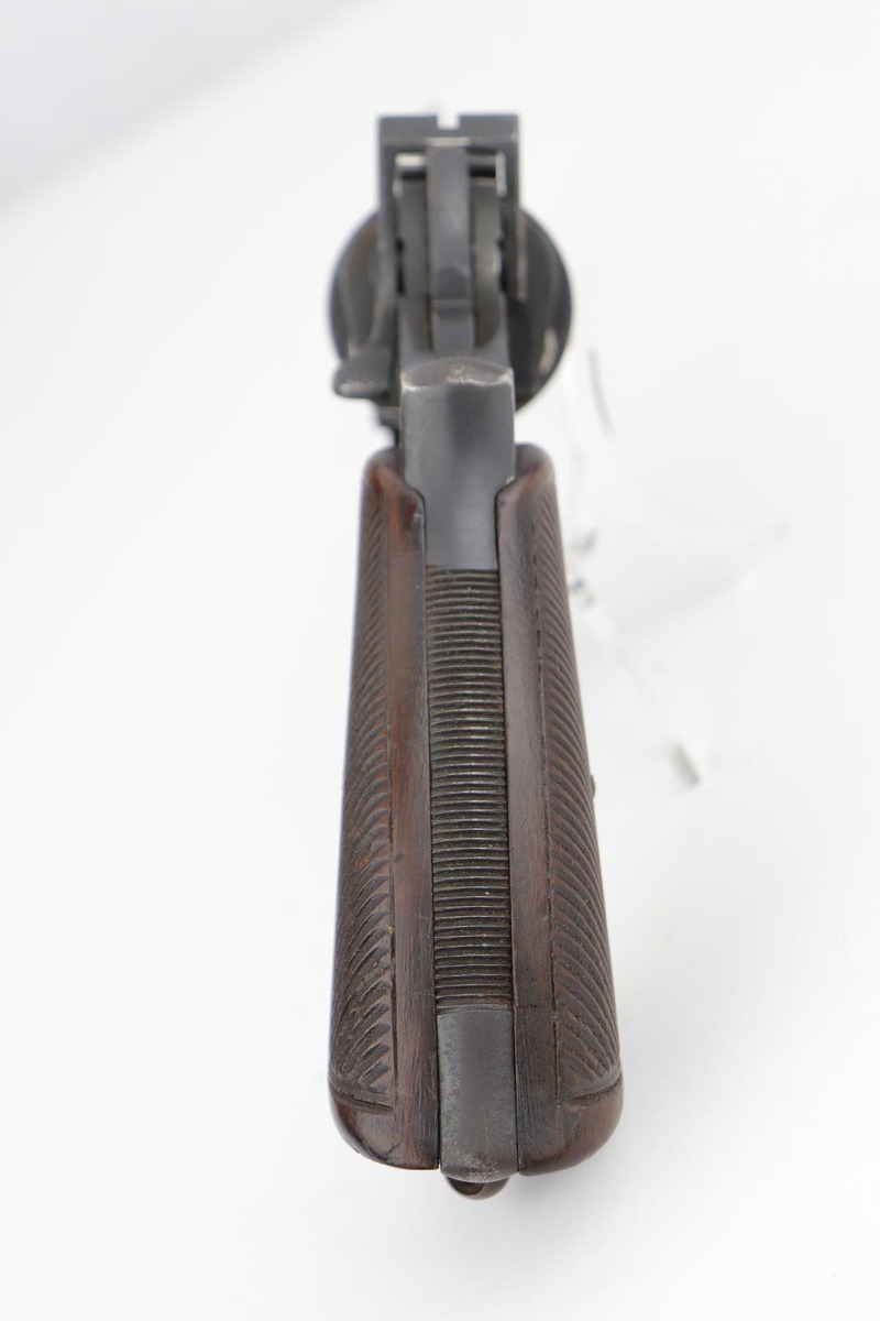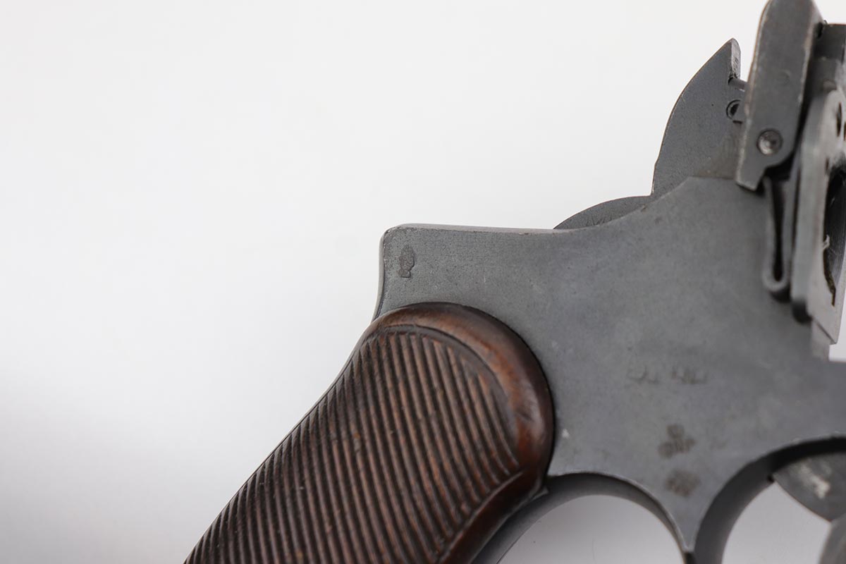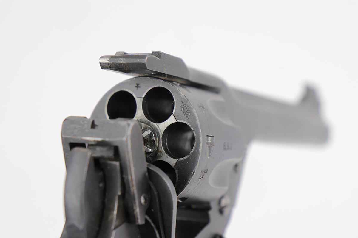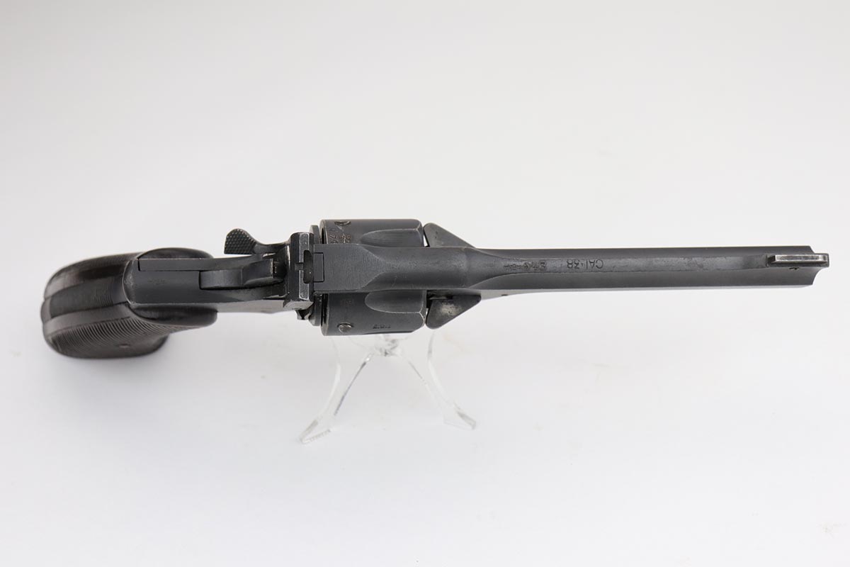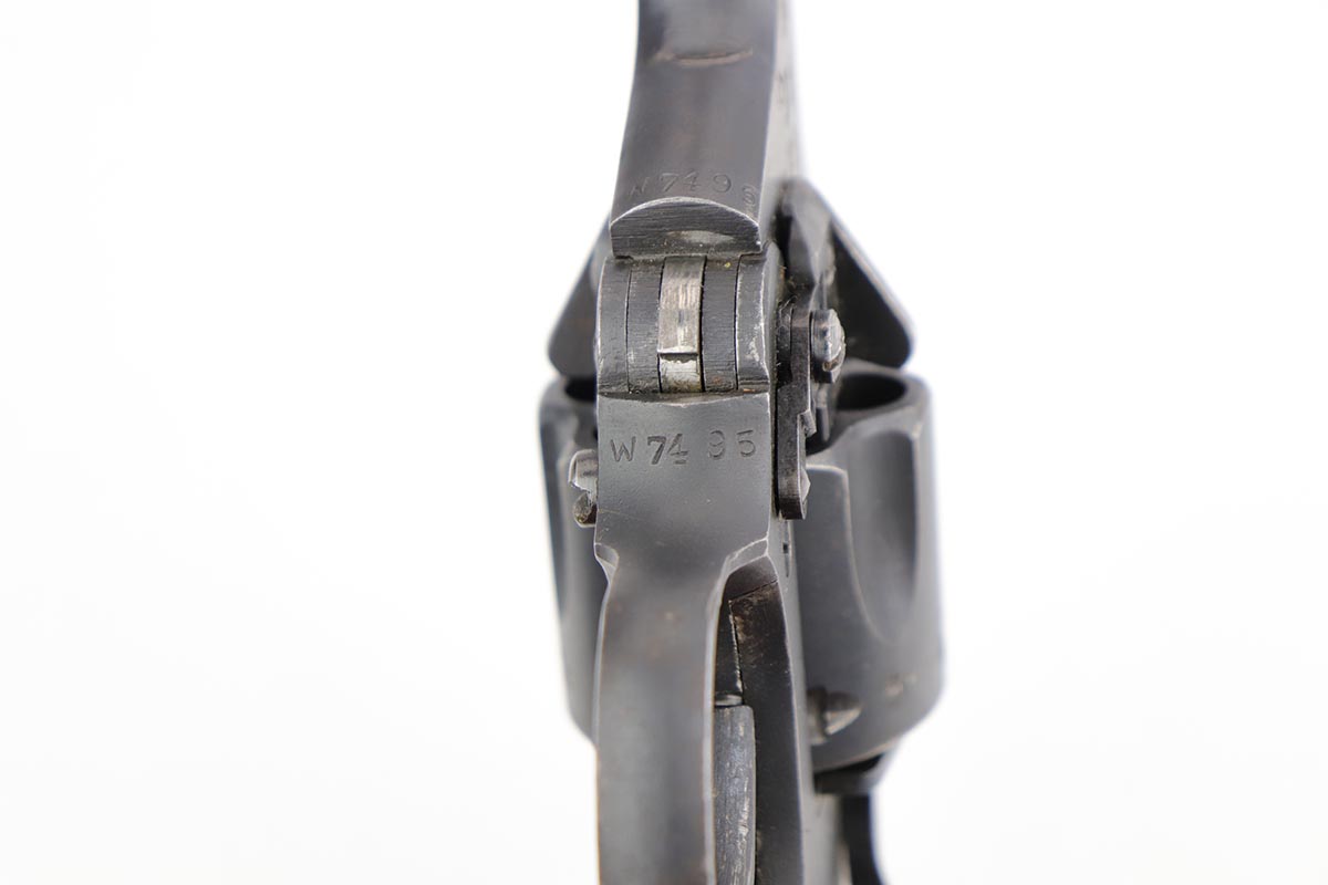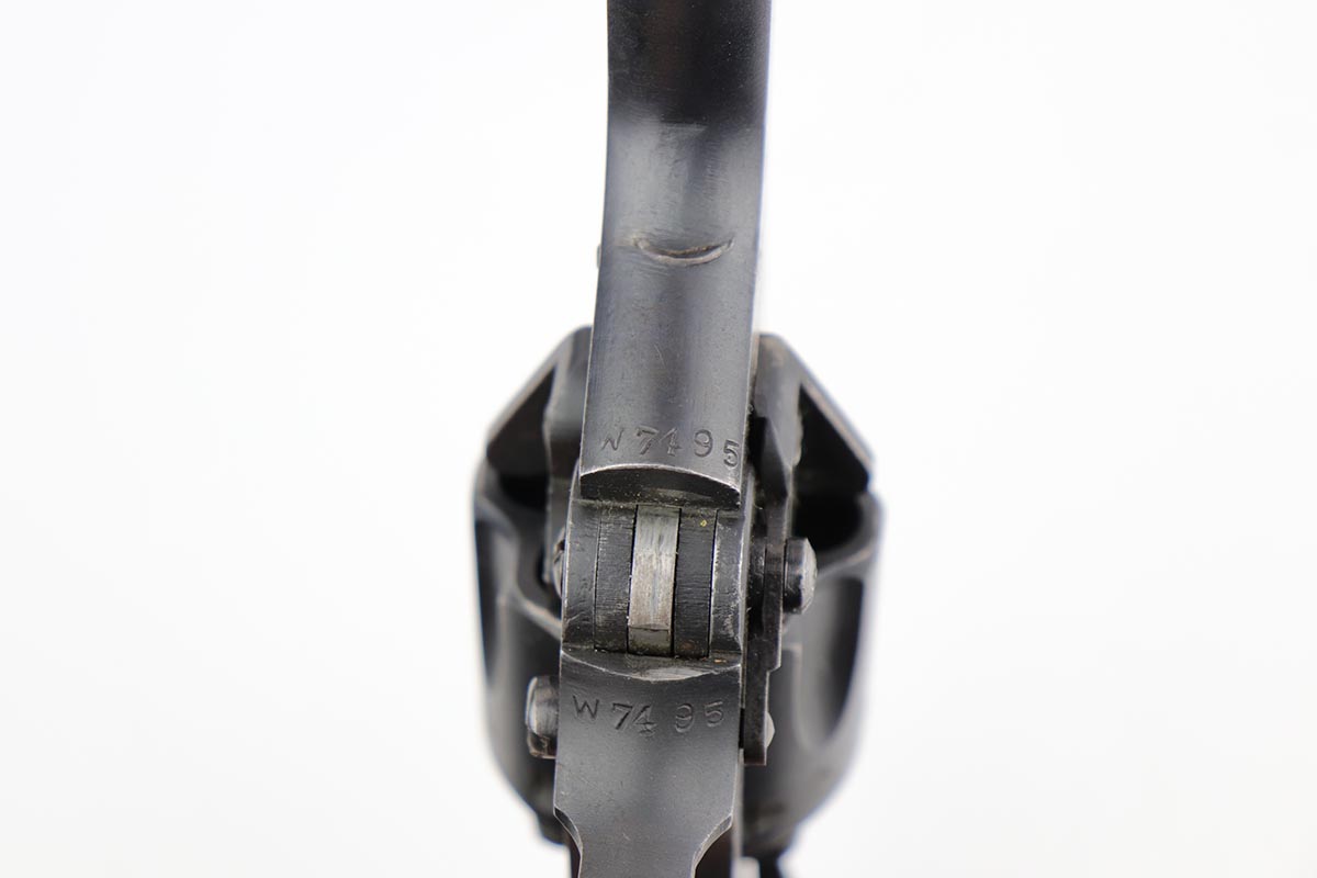 8/27/19 – This is a near-mint Enfield No 2 Mk 1* revolver rig, made in 1943. It has about 98% of the original military blue, with only minor high edge and cylinder wear. Minty bore and excellent mechanics. Original grips are in good shape, with only minor nicks and dings. All numbered parts are matching. Comes with an original canvas holster, which has a faint internal inkstamp and 1943 date.