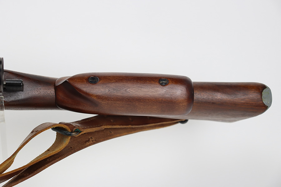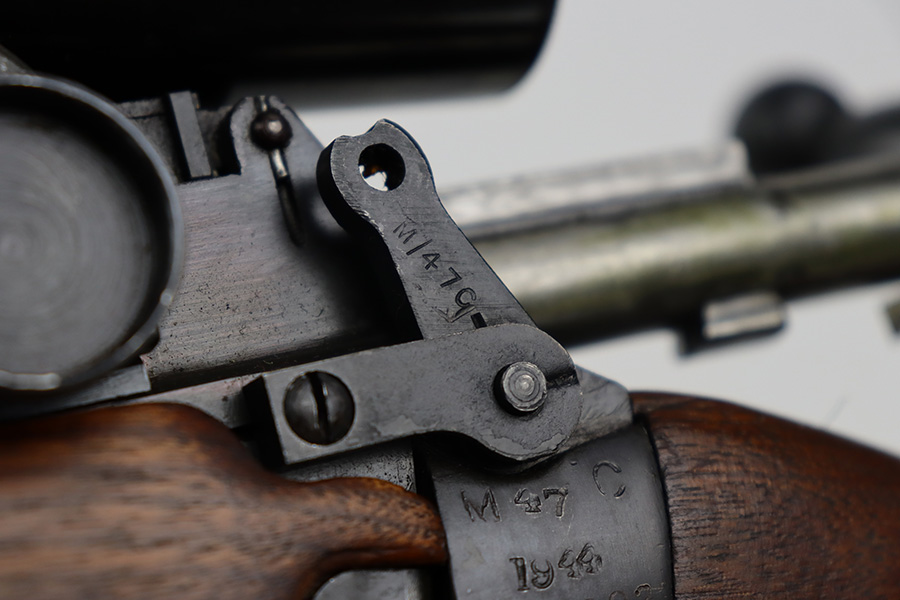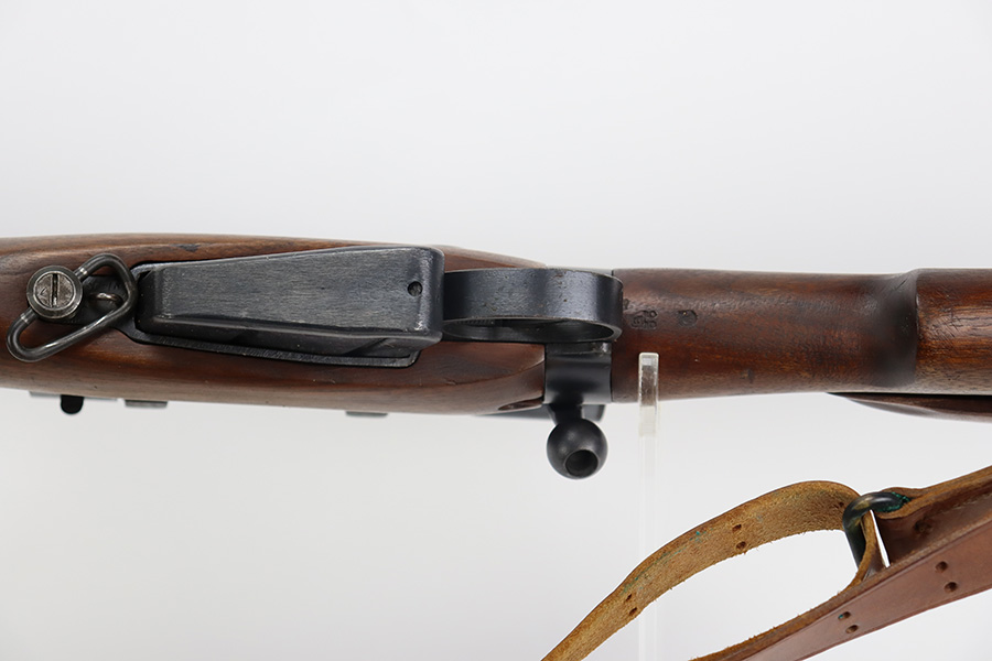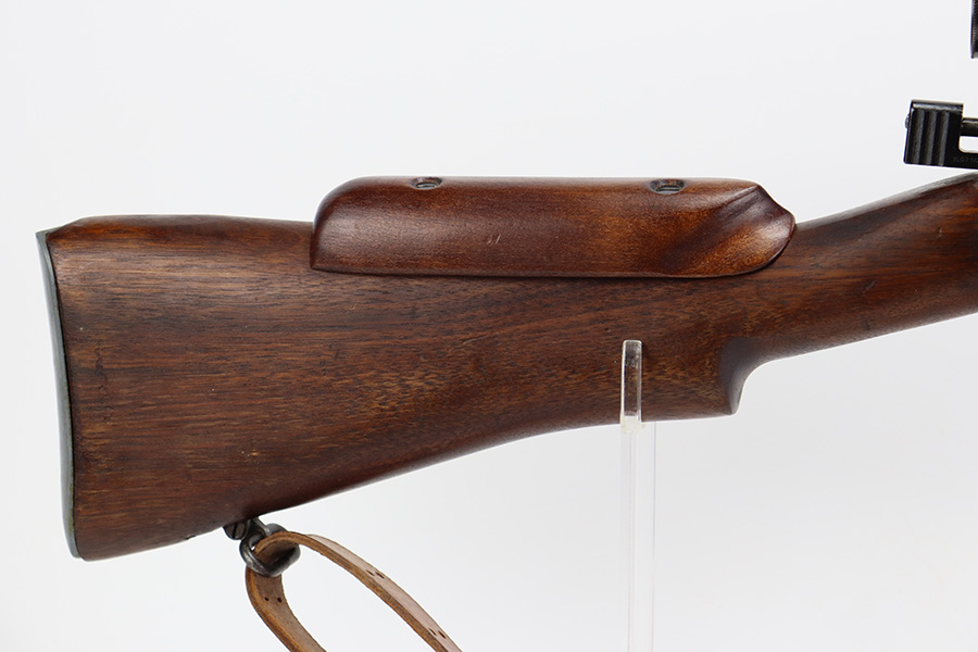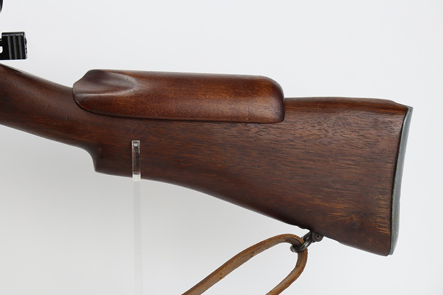 8/31/23 – This is an excellent example of an Enfield No 4 Mk 1 that was originally issued to the British military in 1944. It was later converted to an No4(T)-type sniper configuration. A rail and sniper scope were added – reproduction scope with very clear optics. The stock was also modified, and a cheek pad was added. The metal parts have retained nearly all of their finish, and the wood furniture is minty. Mint bore. Comes with a very nice leather sling.