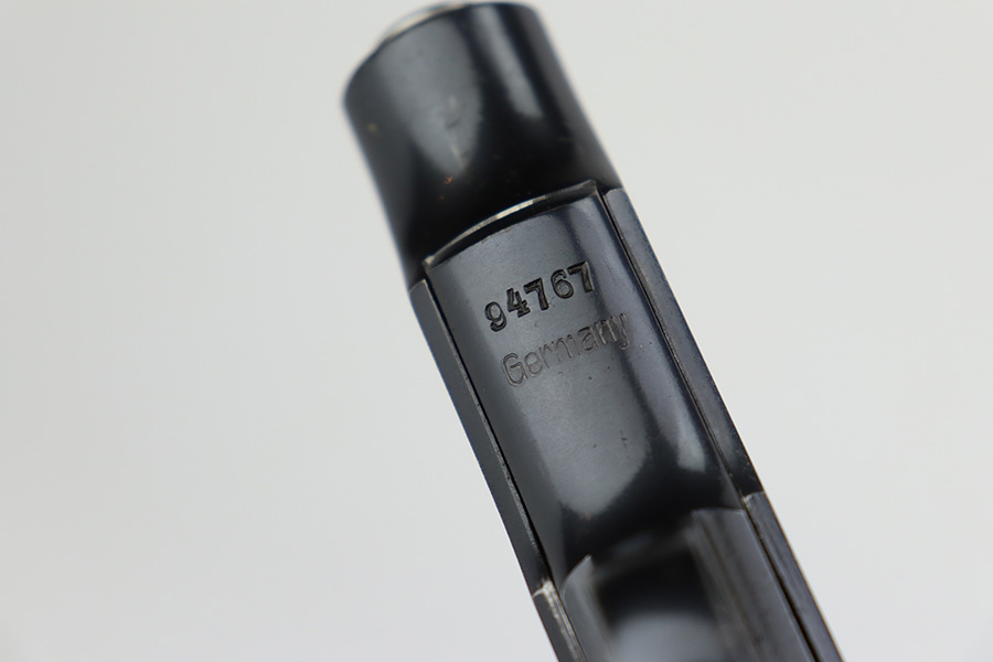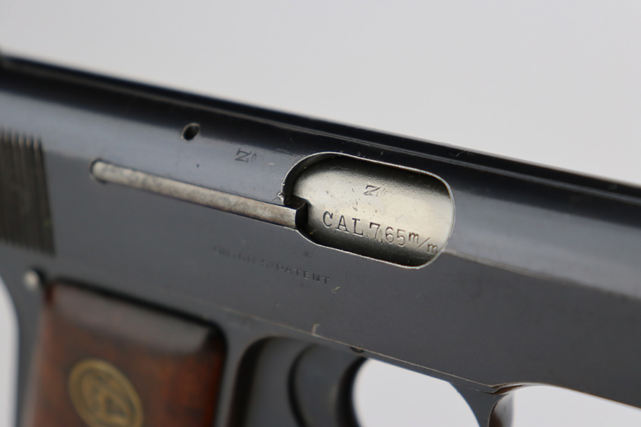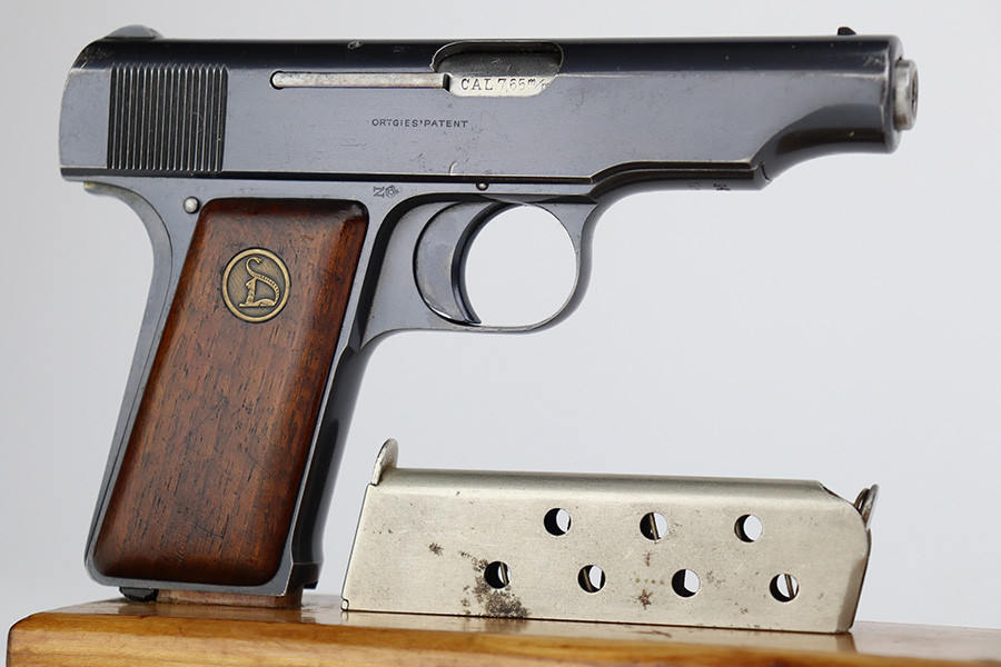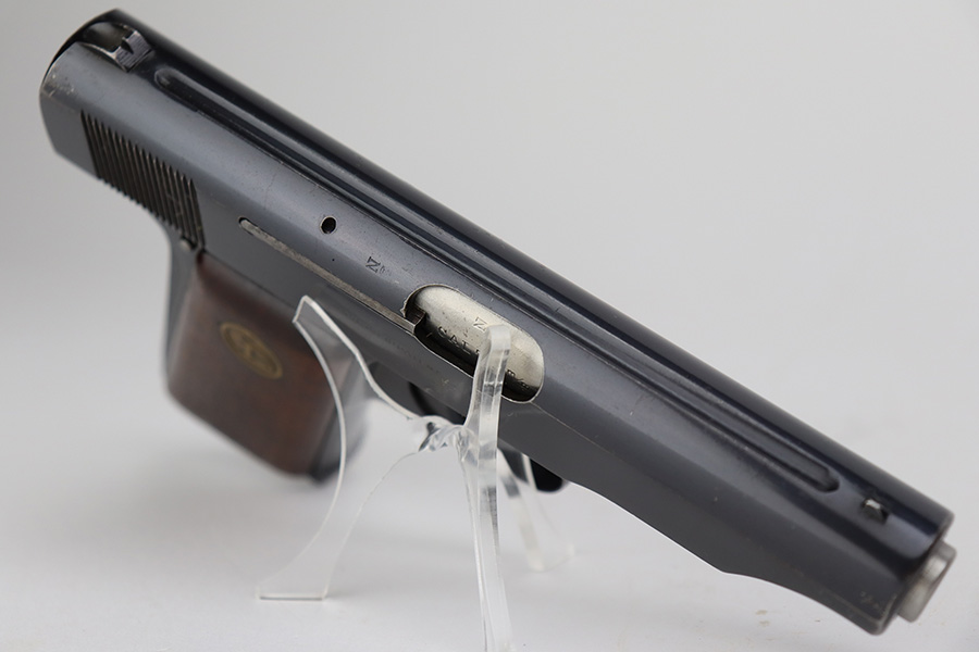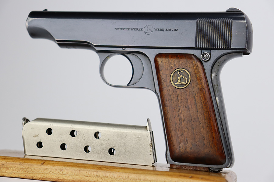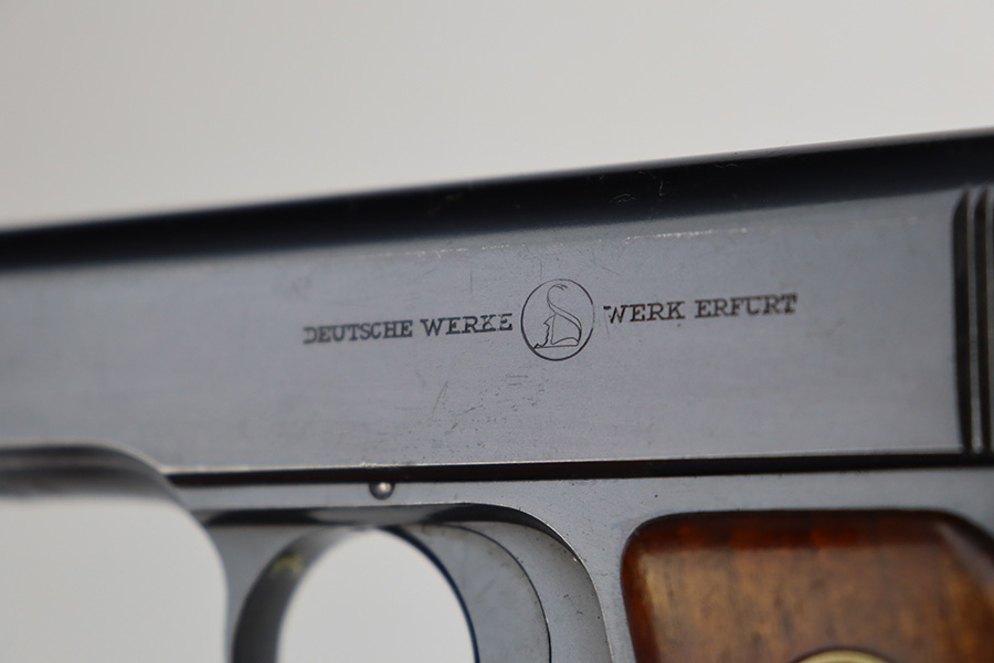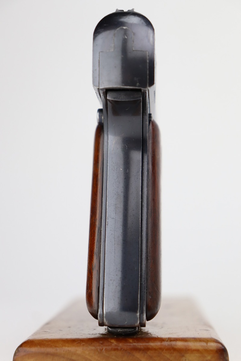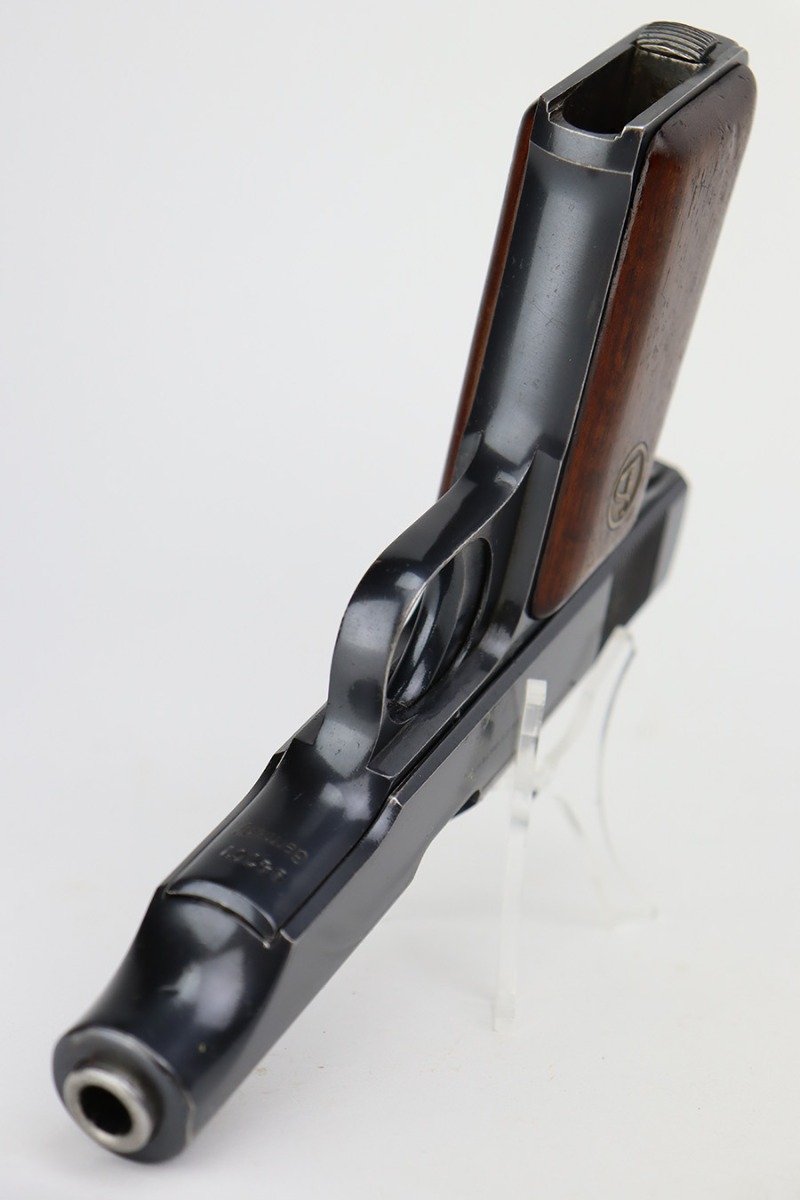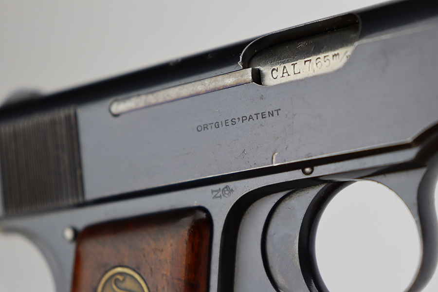 7/12/23 – This is an excellent example of an Erfurt Ortgies Pistol manufactured in the 1920’s and chambered in 7.65mm. This one is all matching, has the proper “Crown N” proofs, and has a “Germany” export marking on the underside of the frame, indicating it was intended for sale in the international commercial market. It has retained about 96% of its original finish. Very minor wear around the muzzle and hints of wear on the high edges of the slide. A few tiny scratches/handling marks here and there. Fitted with excellent period-correct wood grips. Comes with a factory-nickeled magazine. Mint bore.