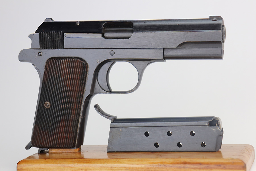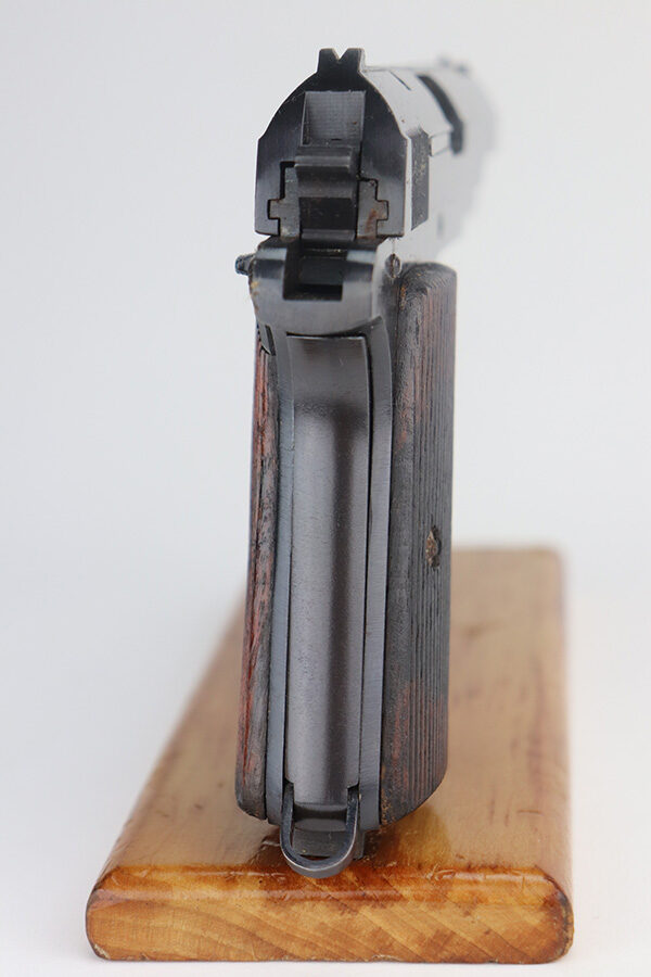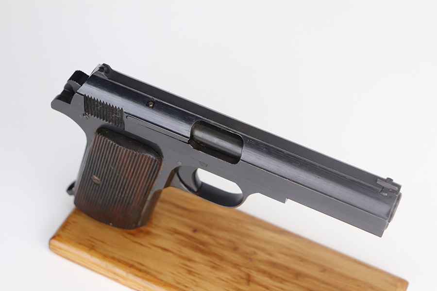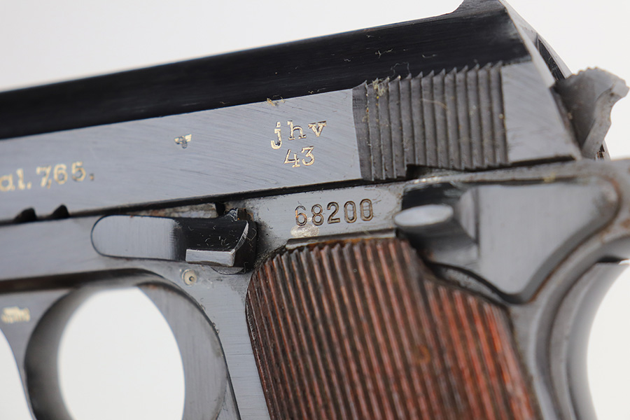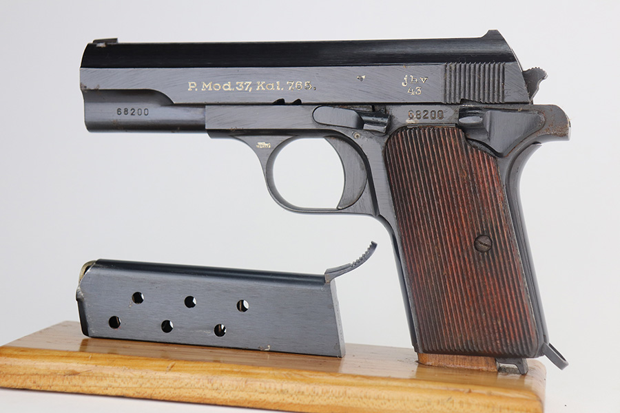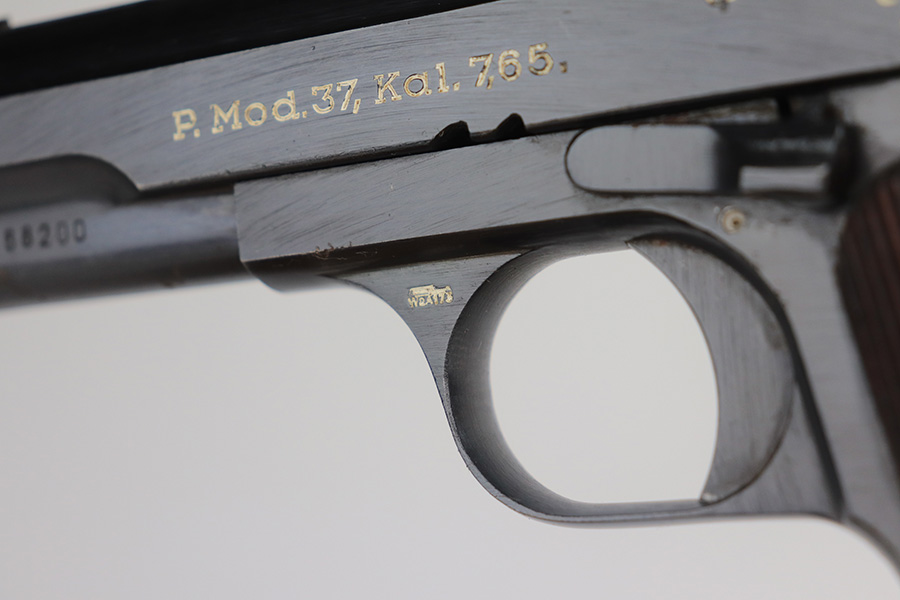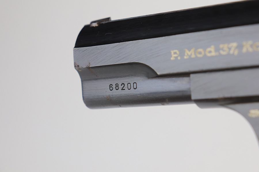 6/8/21 – This is an excellent example of a Femaru Model 37 issued to the Luftwaffe in 1943. This one is all matching and has the proper military proofs. It comes with one original matching magazine. It has retained 99% of its original bluing. The gun would be mint if it weren’t for small areas of minor pitting around the muzzle, tang, and front strap. Comes with excellent grips. Excellent bore – shiny with strong rifling.