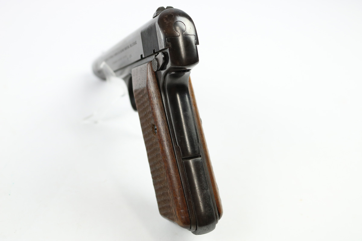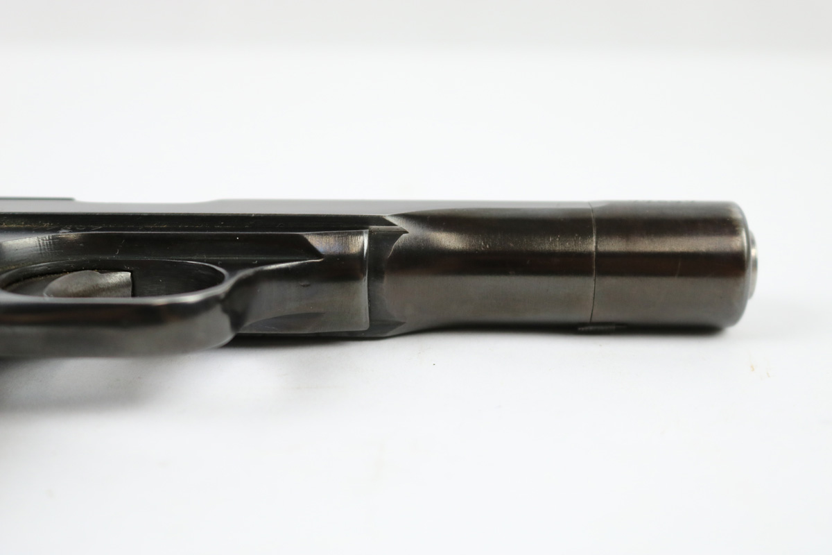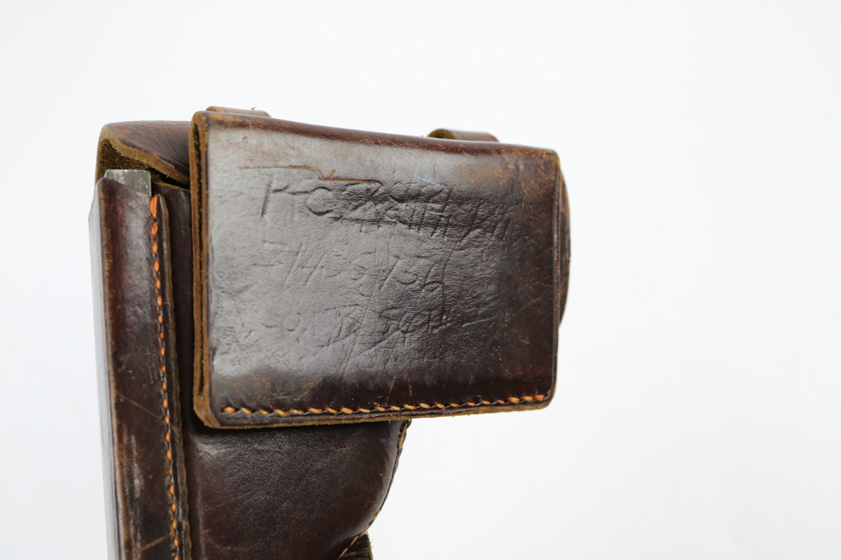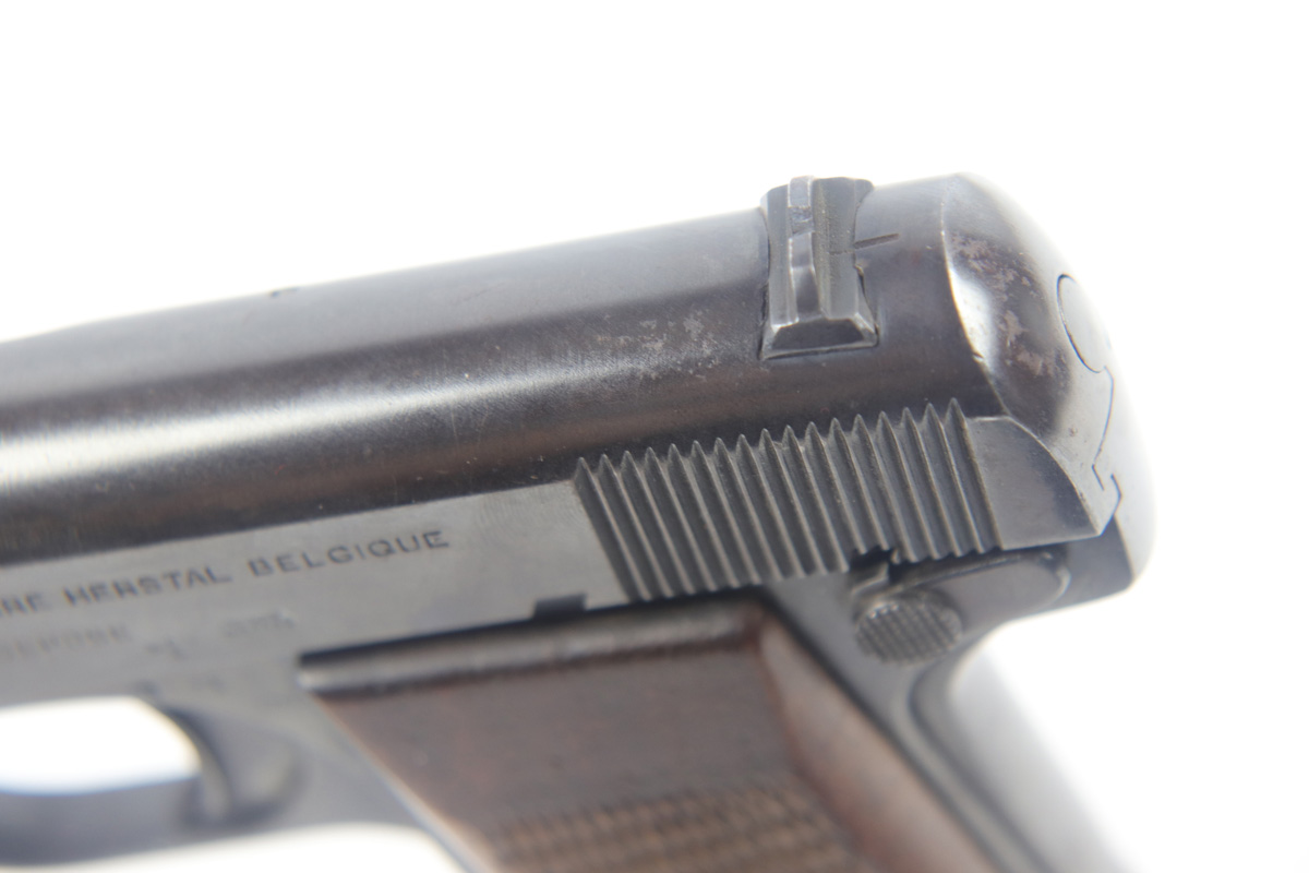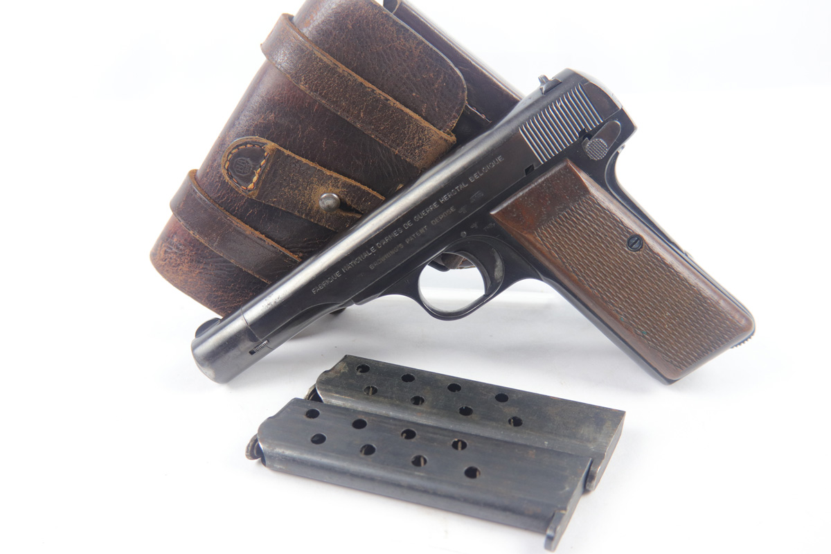 9/27/18 – This is a FN model 1922 WW2 wartime production pistol complete with original holster and two WaA140 proofed magazines. The pistol is in about 92% condition, but is hard to grade as there’s not that much bluing loss, yet there is some browning / patina under the blued finish throughout the pistol. The gun doesn’t look worn though which is nice – the grading of 92% is our best estimate, but other’s might call this a minty pistol. The pistol is matching and original – most likely 1942 or 43 production. No letter suffix on the serial number. The bore is minty with minimal wear. The holster shows normal wear and a light impression of the G.I.’s name and serial number on the back. Guaranteed original and fully functional.