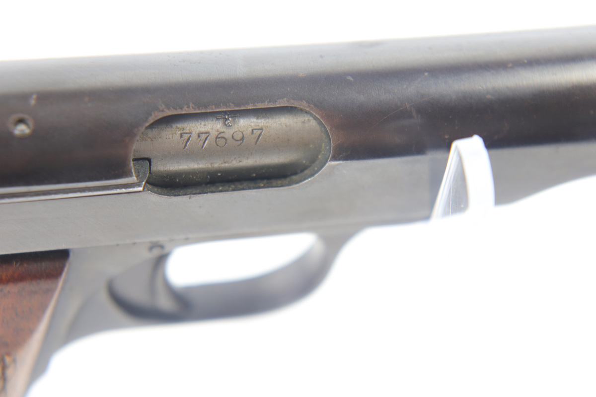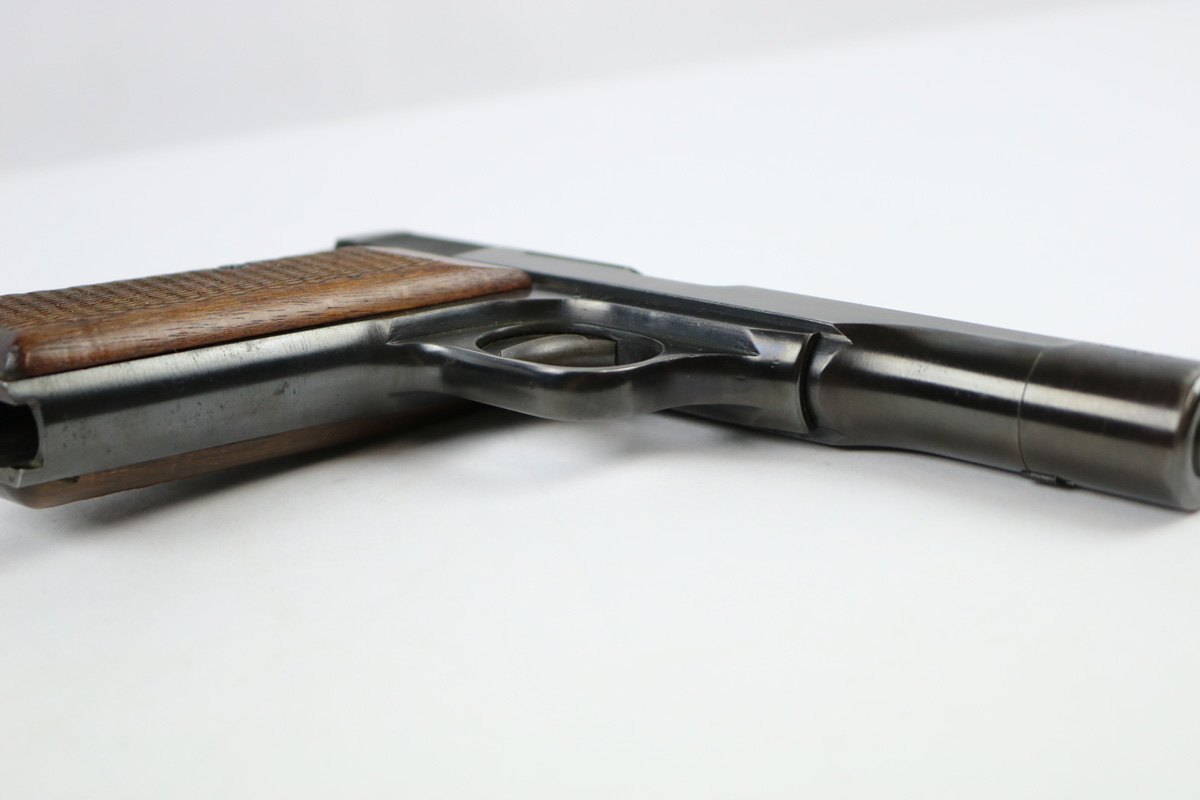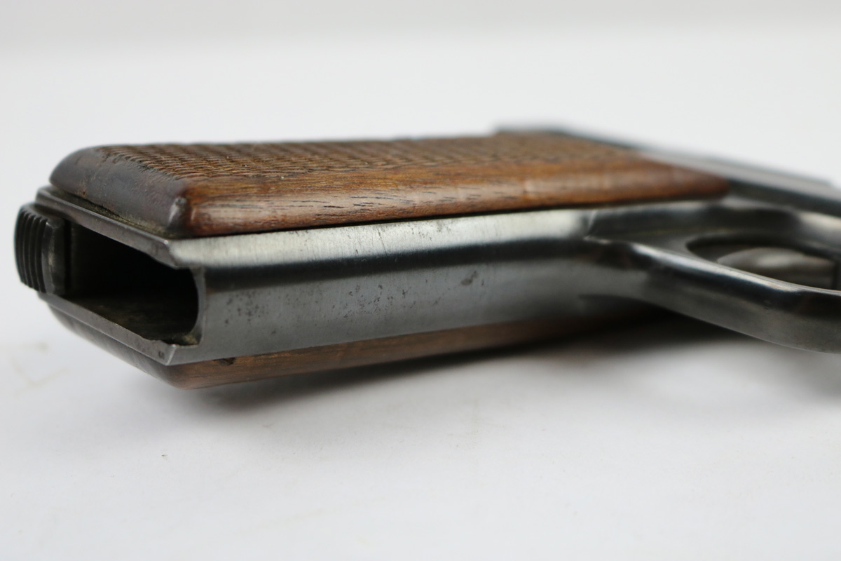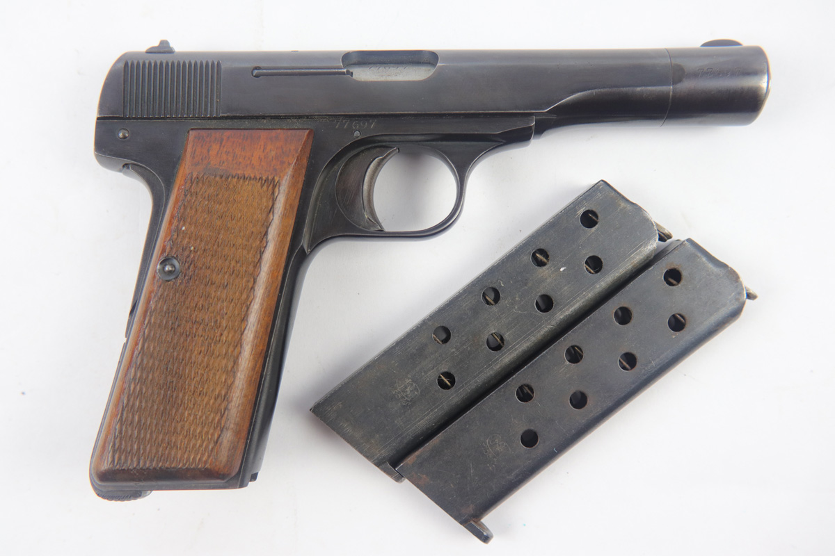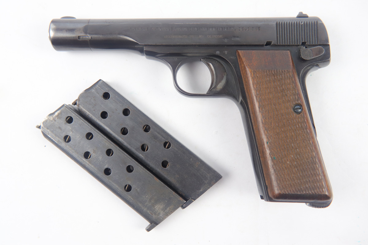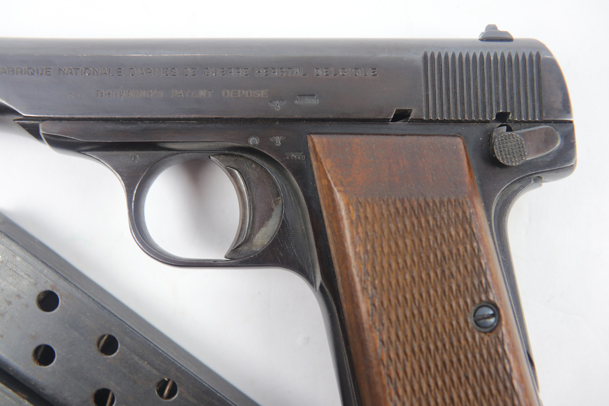 9/27/18 – This is a FN model 1922 WW2 wartime production pistol complete with original holster and two WaA140 proofed magazines. The pistol is in about 92% condition, but is hard to grade as there’s not that much bluing loss, yet there is some browning / patina under the blued finish throughout the pistol. The gun doesn’t look worn though which is nice – the grading of 92% is our best estimate, but other’s might call this a minty pistol. The pistol is matching and original – most likely 1942 or 43 production. No letter suffix on the serial number. The bore is minty with minimal wear. The holster shows normal wear and a light impression of the G.I.’s name and serial number on the back. Guaranteed original and fully functional.