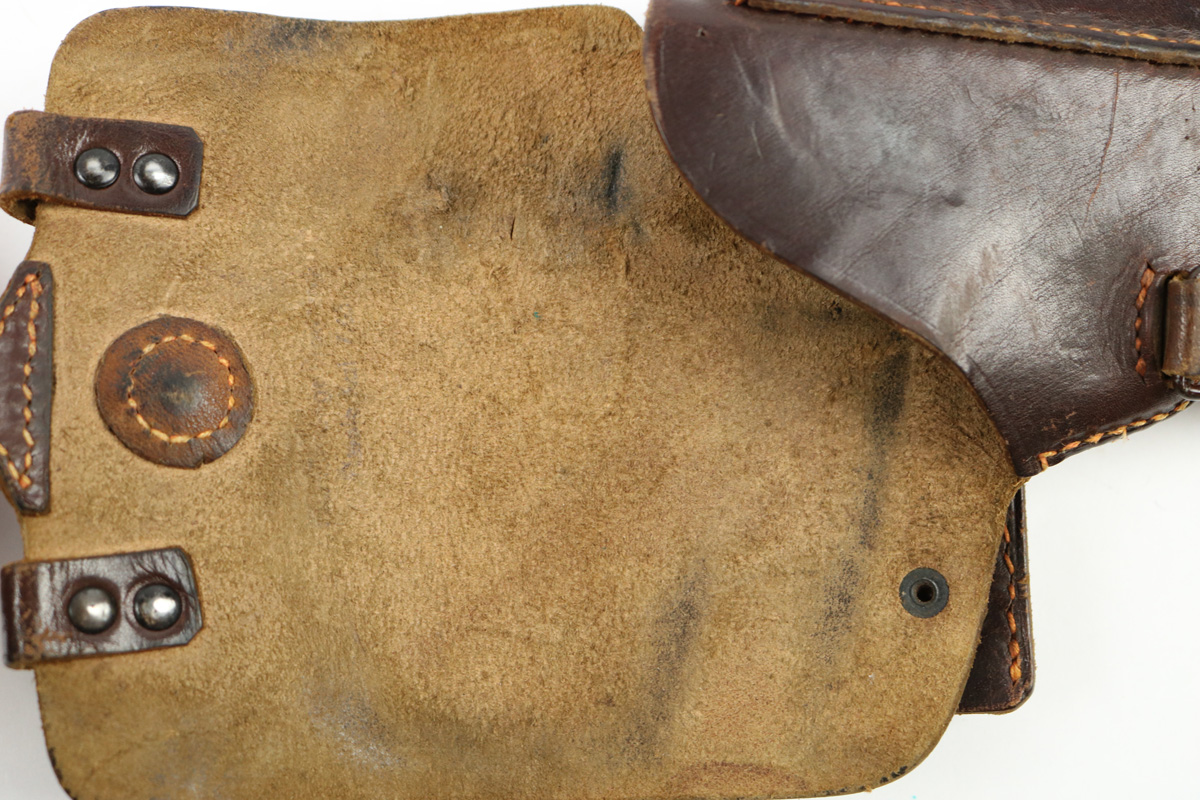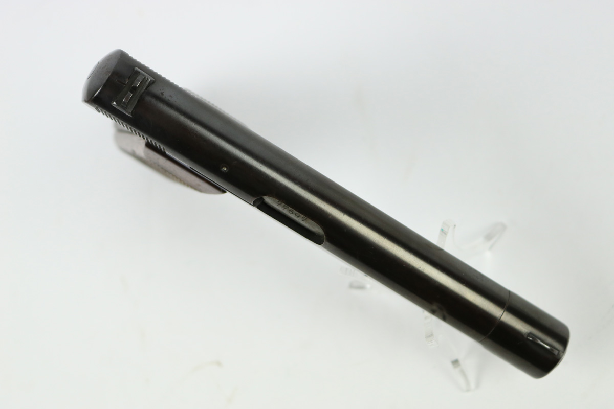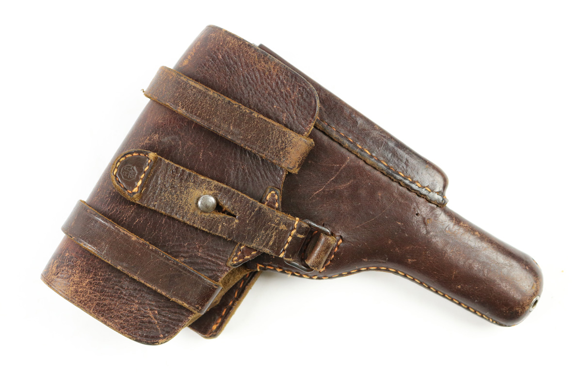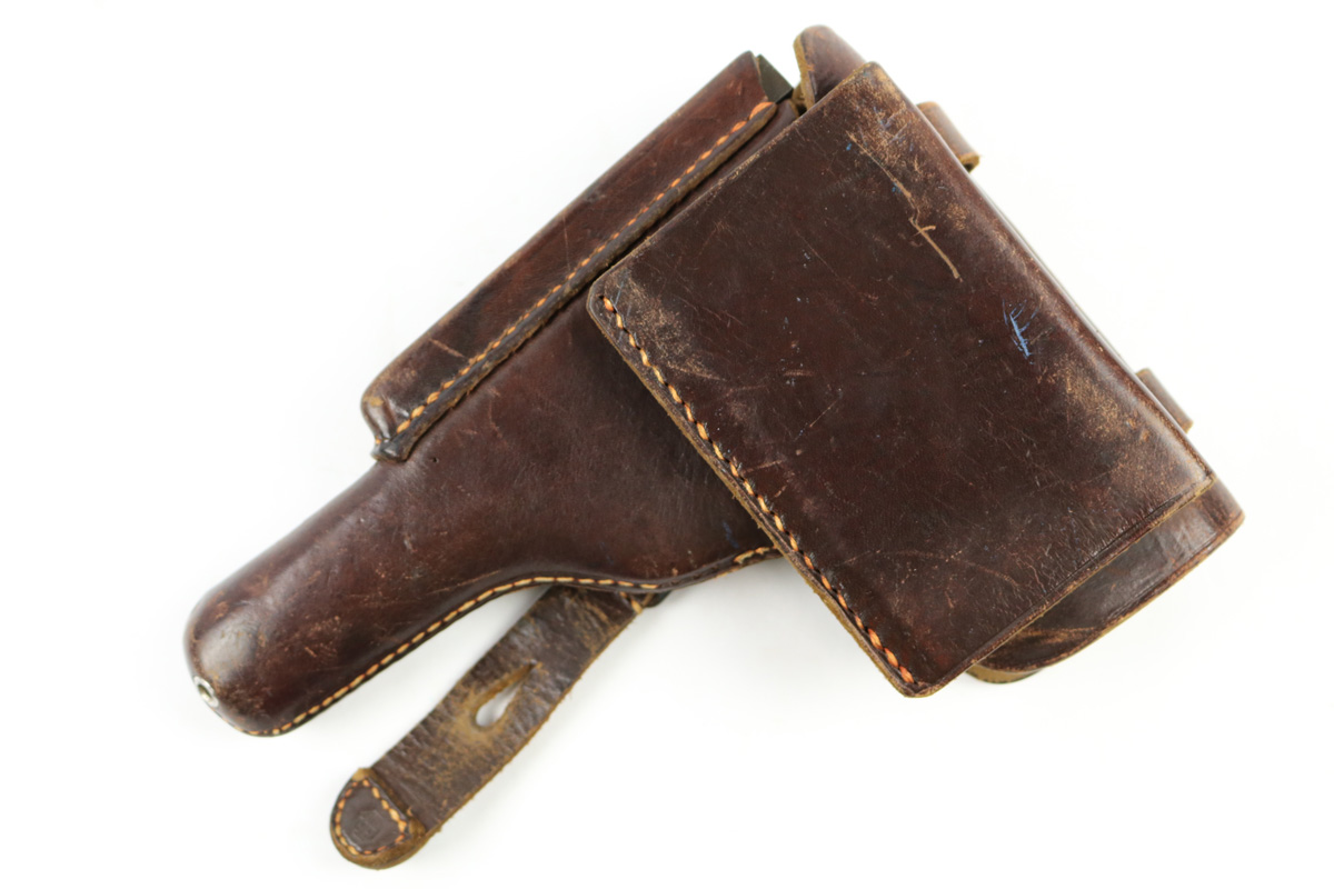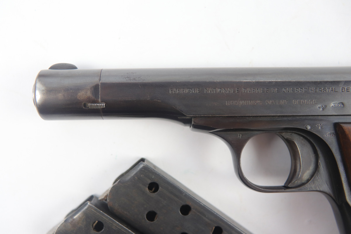 9/27/18 – This is a FN model 1922 WW2 wartime production pistol complete with original holster and two WaA140 proofed magazines. The pistol is in about 92% condition, but is hard to grade as there’s not that much bluing loss, yet there is some browning / patina under the blued finish throughout the pistol. The gun doesn’t look worn though which is nice – the grading of 92% is our best estimate, but other’s might call this a minty pistol. The pistol is matching and original – most likely 1942 or 43 production. No letter suffix on the serial number. The bore is minty with minimal wear. The holster shows normal wear and a light impression of the G.I.’s name and serial number on the back. Guaranteed original and fully functional.