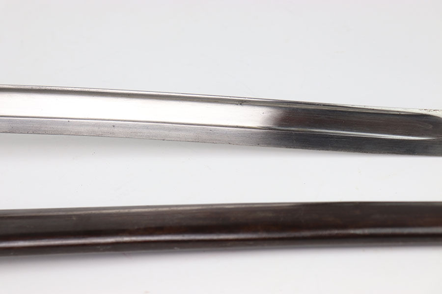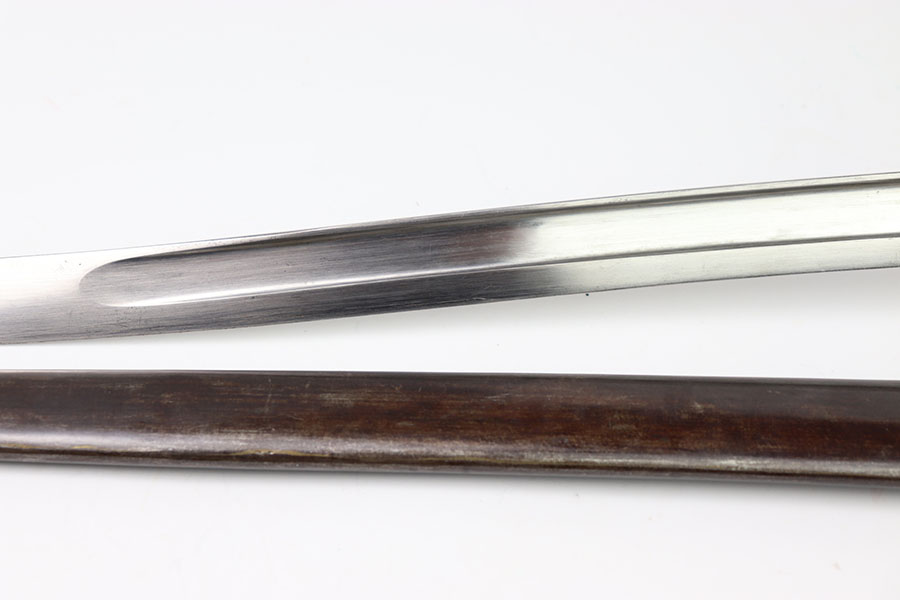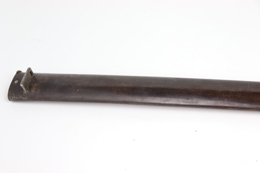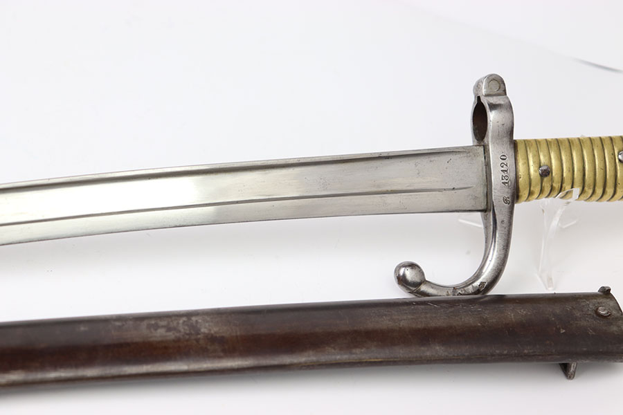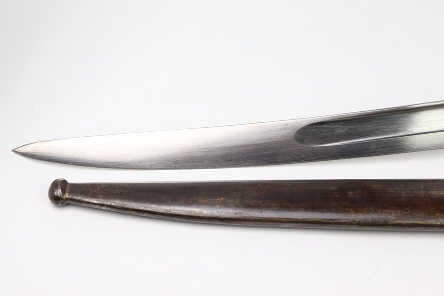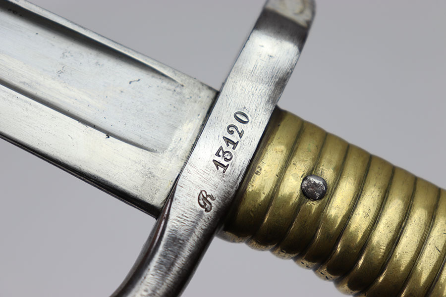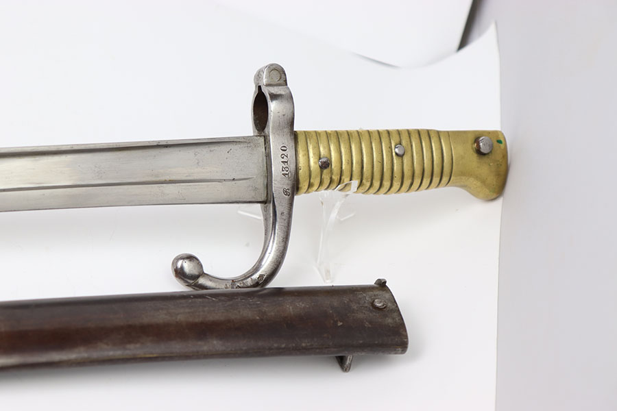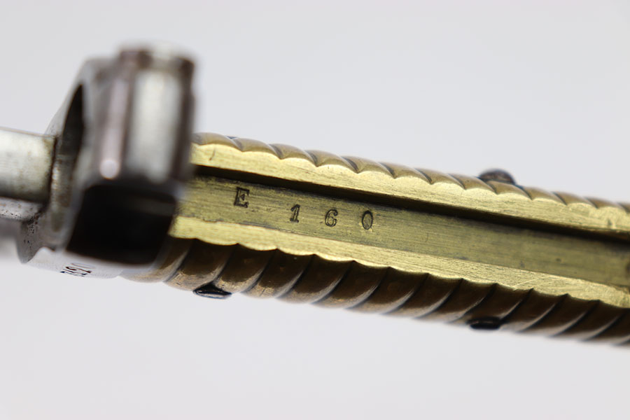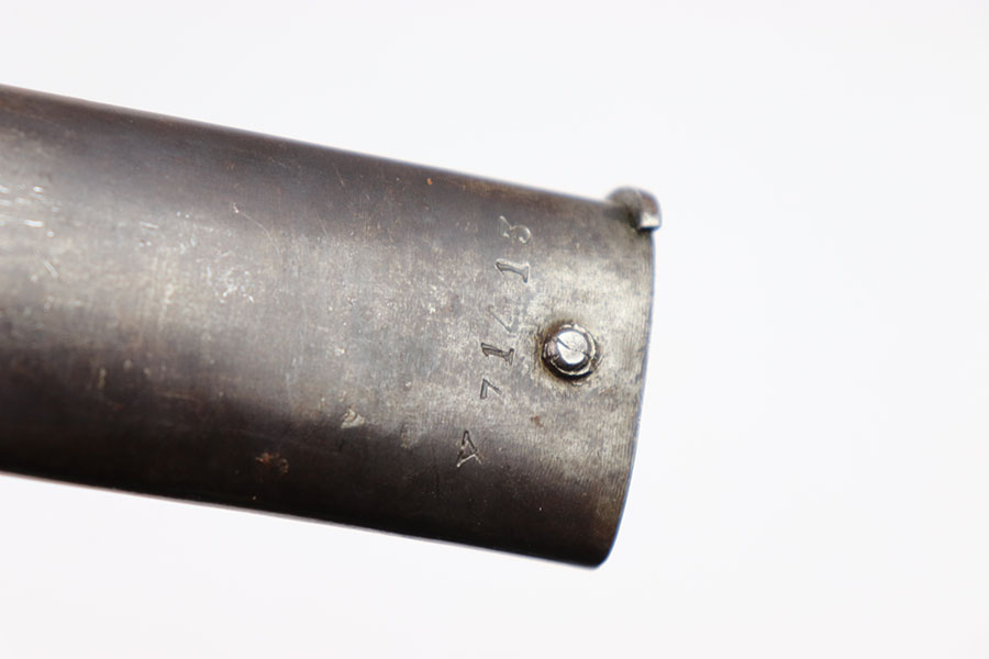 3/13/24 – This is an original, pre WW1 production French M1866 Sword Rifle bayonet with a numbered scabbard. The bayonet blade is in excellent condition with very little surface wear. There’s no signs of sharpening. The cross guard has no patina or pitting just some minor surface scratches The original brass handle is in great condition serial numbered “E 160”. The cross guard is serial numbered “R 13120” and the scabbard, “X 71413” as shown. The scabbard has light wear and dark patina throughout but no major issues, smooth finish, no oxidation or pitting.
