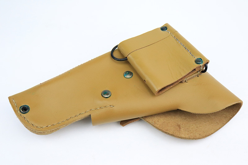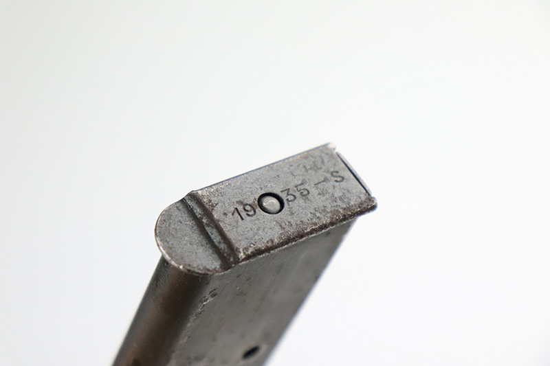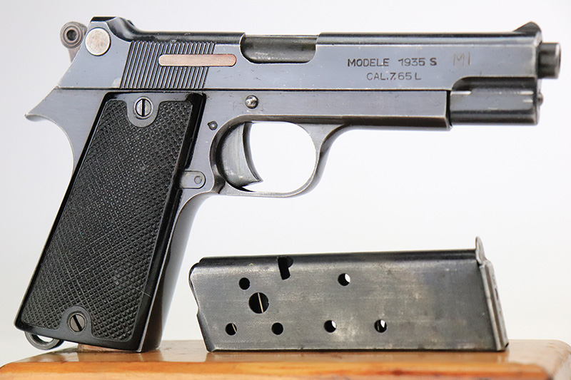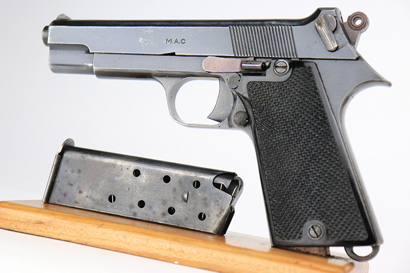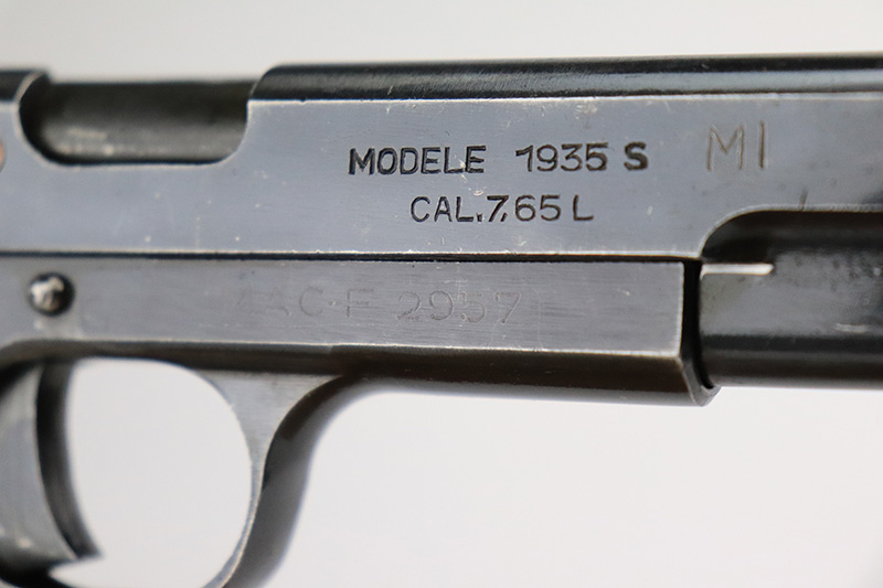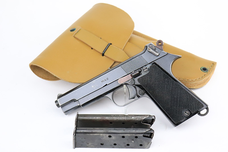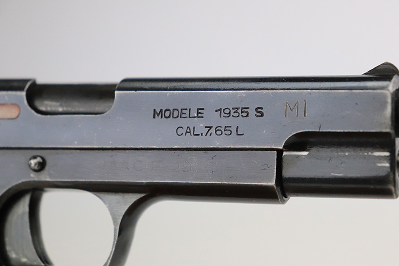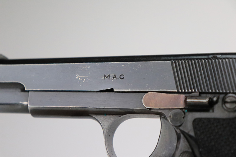 9/26/22 – This is an excellent example of a French MAC Model 1935-S manufactured right after WW2. It is all matching and comes as a rig with two proper magazines and a mint mustard-colored leather holster. It has retained about 95-96% of its original finish. There is very minor wear around the high edges of the slide and around the muzzle. Some tiny scratches and handling marks along both sides of the slide. Minor dulling in the finish on both grip straps. Comes with very nice black plastic grips. The bore has good rifling with minor frosting in the grooves.