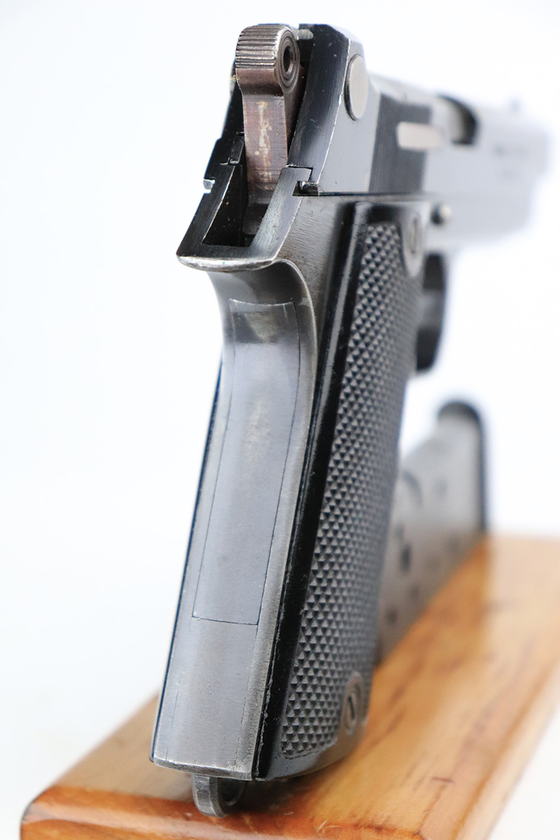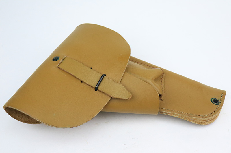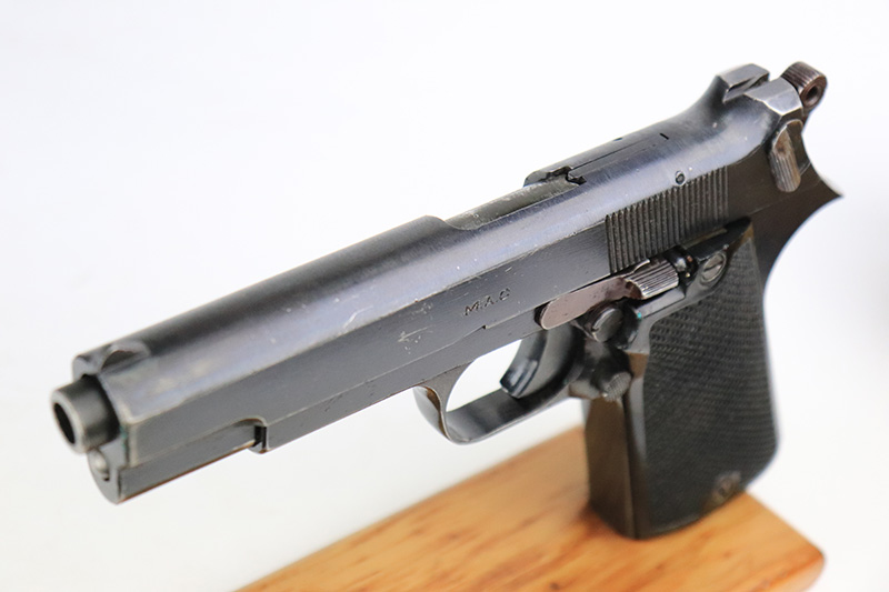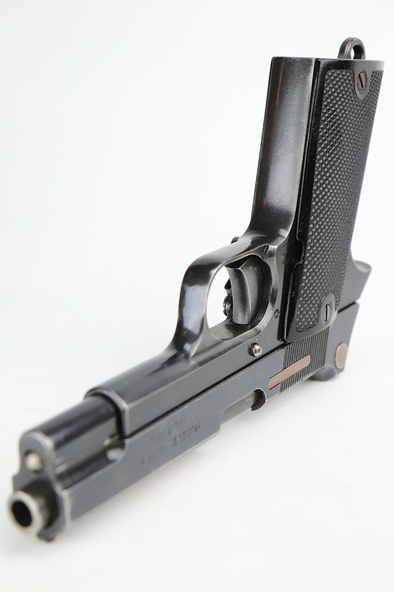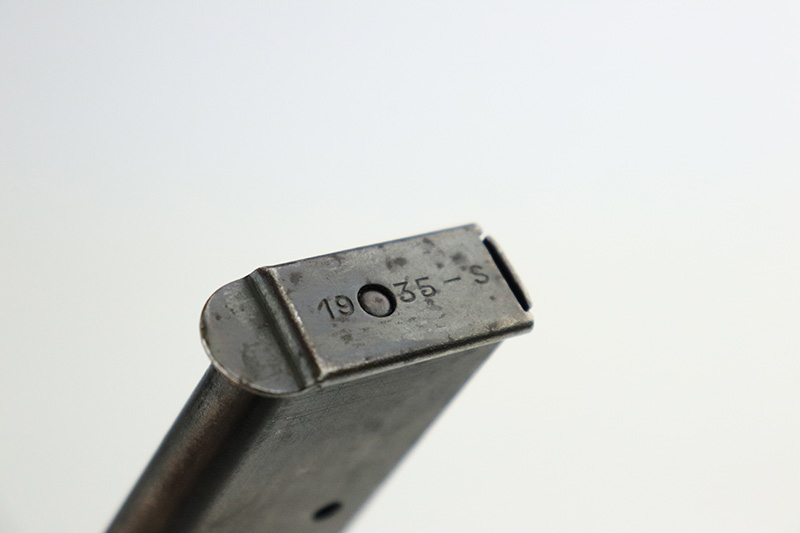 9/26/22 – This is an excellent example of a French MAC Model 1935-S manufactured right after WW2. It is all matching and comes as a rig with two proper magazines and a mint mustard-colored leather holster. It has retained about 95-96% of its original finish. There is very minor wear around the high edges of the slide and around the muzzle. Some tiny scratches and handling marks along both sides of the slide. Minor dulling in the finish on both grip straps. Comes with very nice black plastic grips. The bore has good rifling with minor frosting in the grooves.