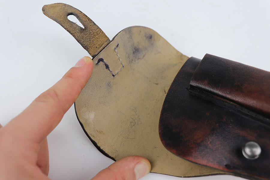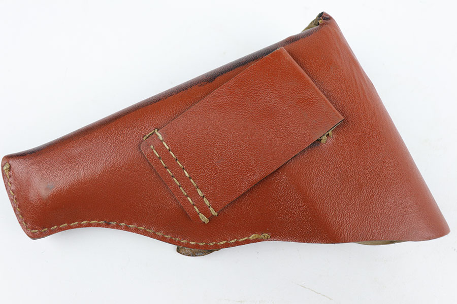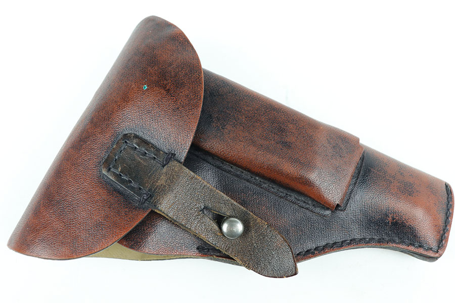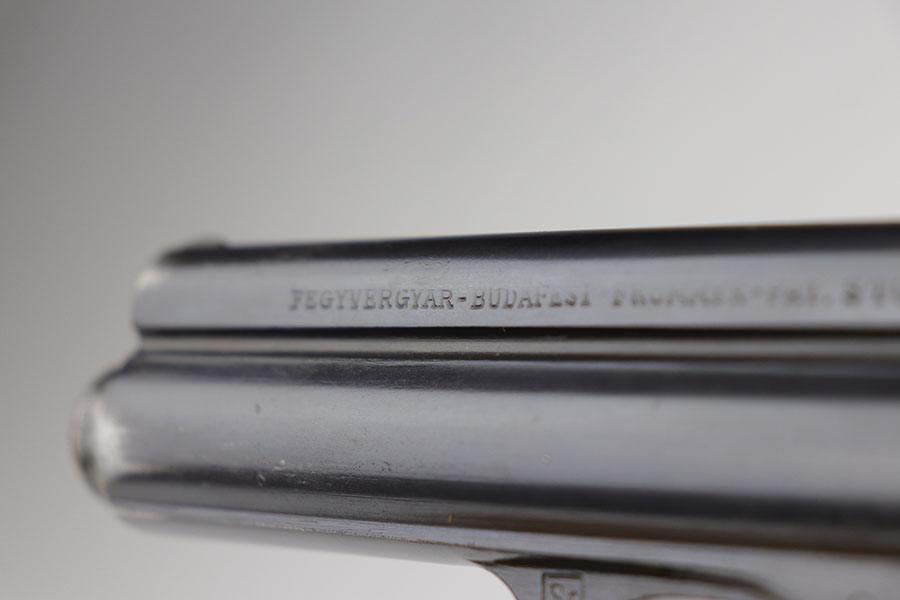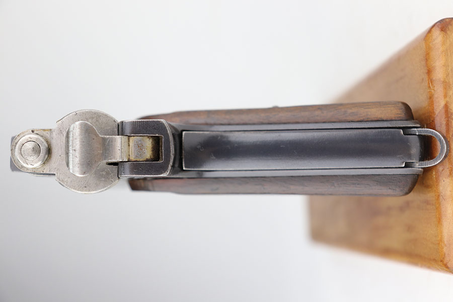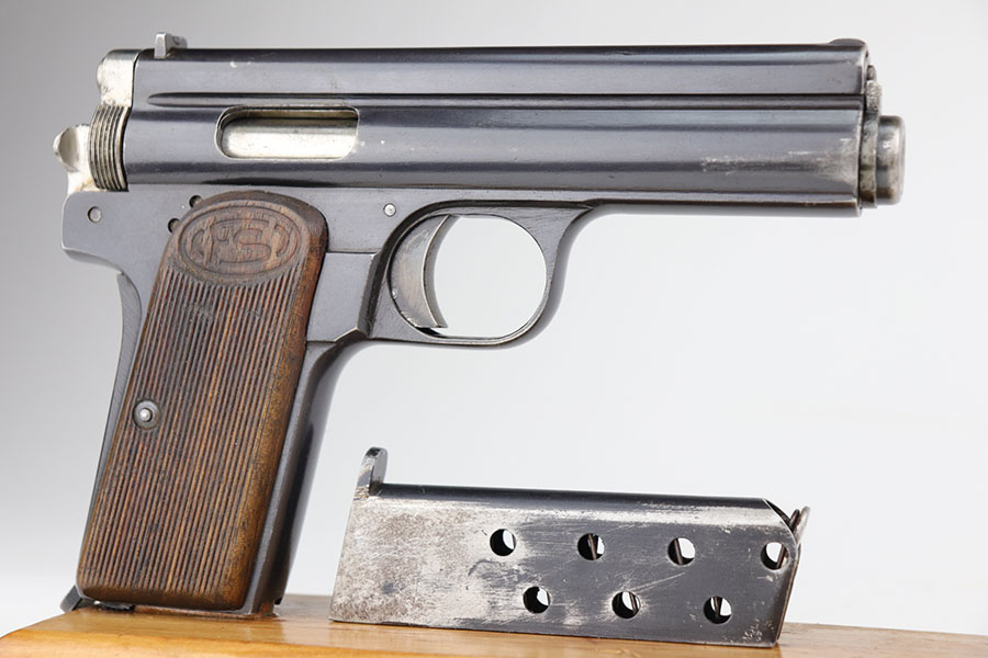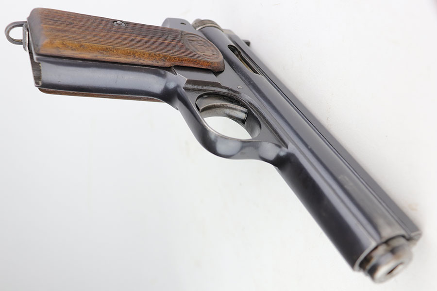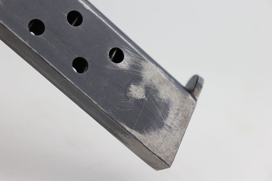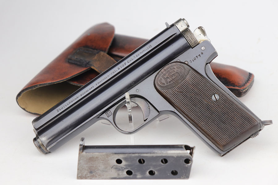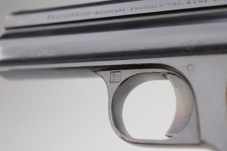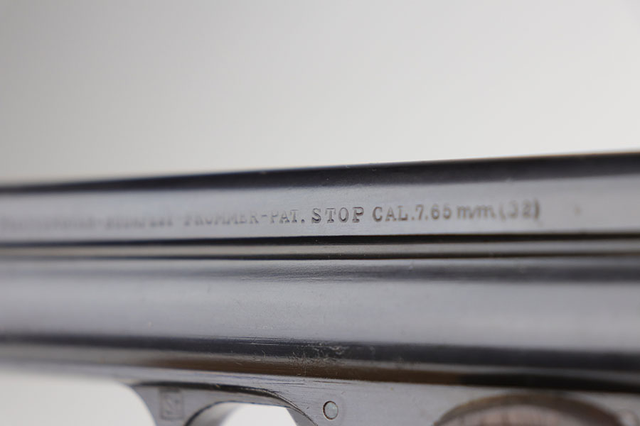 1/18/21 – This is an excellent example of a somewhat uncommonly seen Frommer Stop from 1920. The pistol is all original with about 96-97% of the blue remaining. It just has some muzzle and slide wear from rubbing inside the holster, but looks great overall. The serial dates the gun to 1920, and it is marked ‘Sr’ in a square on the left side of the trigger guard. The meaning of this proof is unknown, though some have suggested it is a police marking. The original grips show minor handling wear but are in great shape overall. Strong, clean bore. Comes with an ersatz holster that is unmarked but could be from the time period. More info on the Frommer Stop can be found here: https://unblinkingeye.com/Guns/Frommer/frommer.html