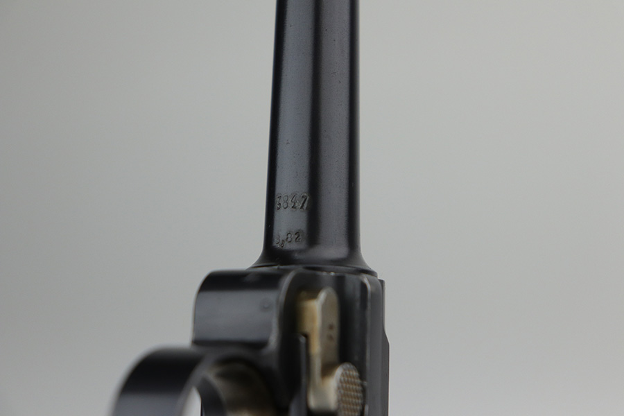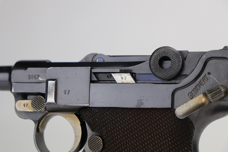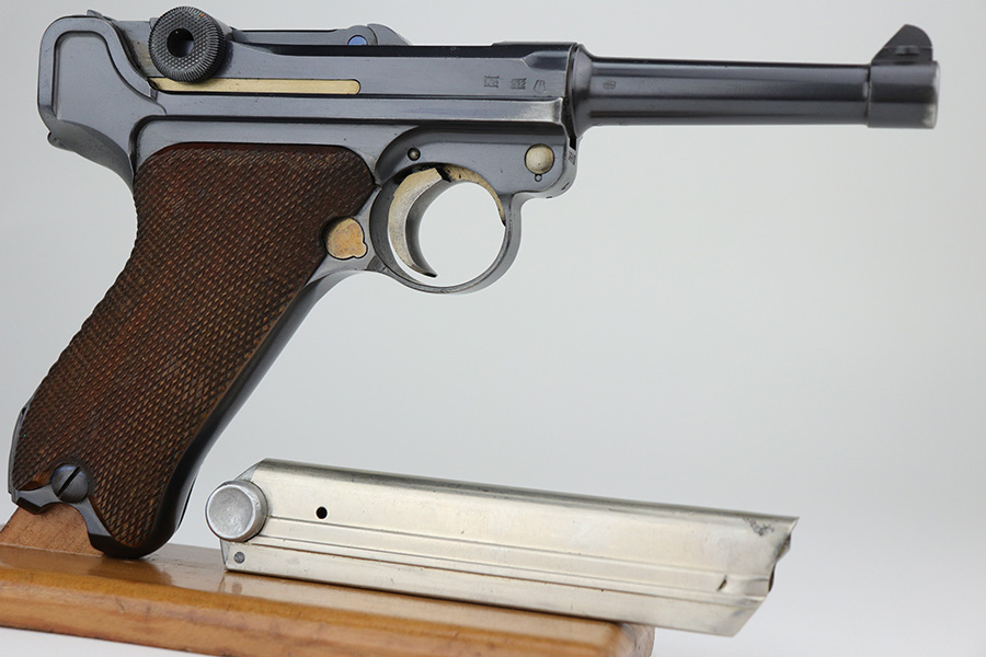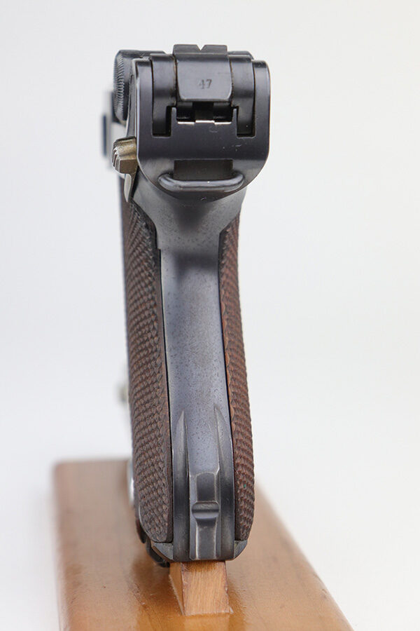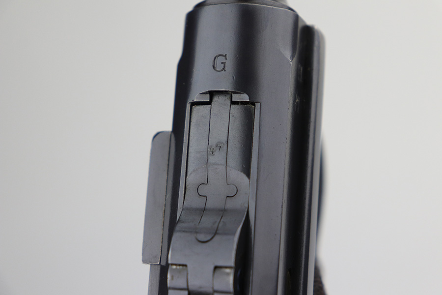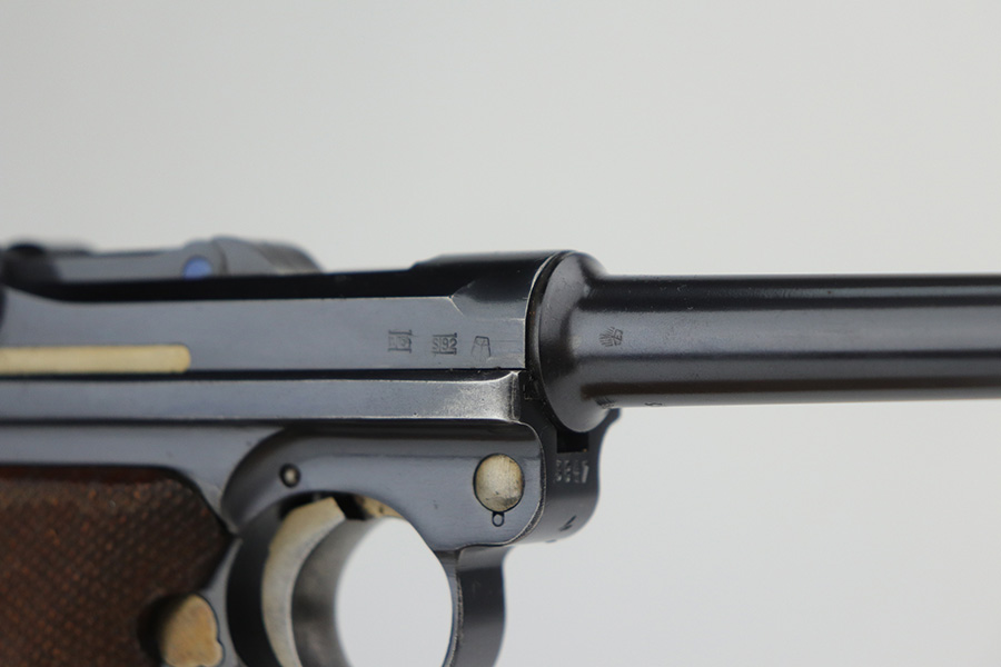 10/20/21 – This is an excellent example of a “G Date” Mauser Luger issued to the Nazi military in 1935. The gun is all matching, has a “G” on the chamber, and has the proper G Date Nazi military proofs on the right side of the slide. The small parts have lost most of the straw coloring, but the gun has retained about 96% of its original finish overall. There is very minor wear on the side plate, side rails, and around the muzzle. Hints of spotty wear on the straps. Spotty oxidation on both straps and one small area on the left side of the frame. Comes with excellent un-numbered wood grips – the left panel has a hand-scratched swastika on the inside. It also comes with a mismatched period-correct magazine with an “Eagle 154” proof on the bottom. The bore has decent rifling with minor pitting throughout.