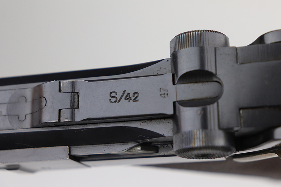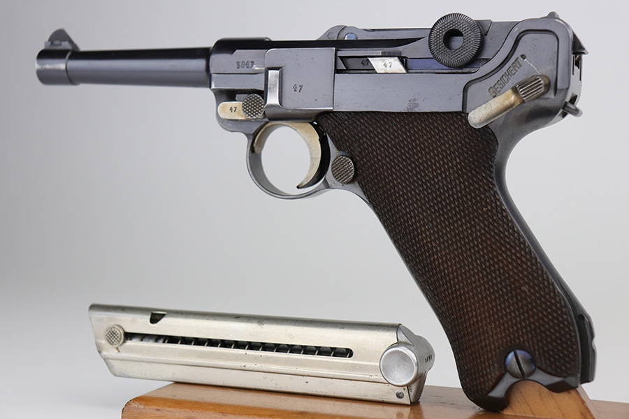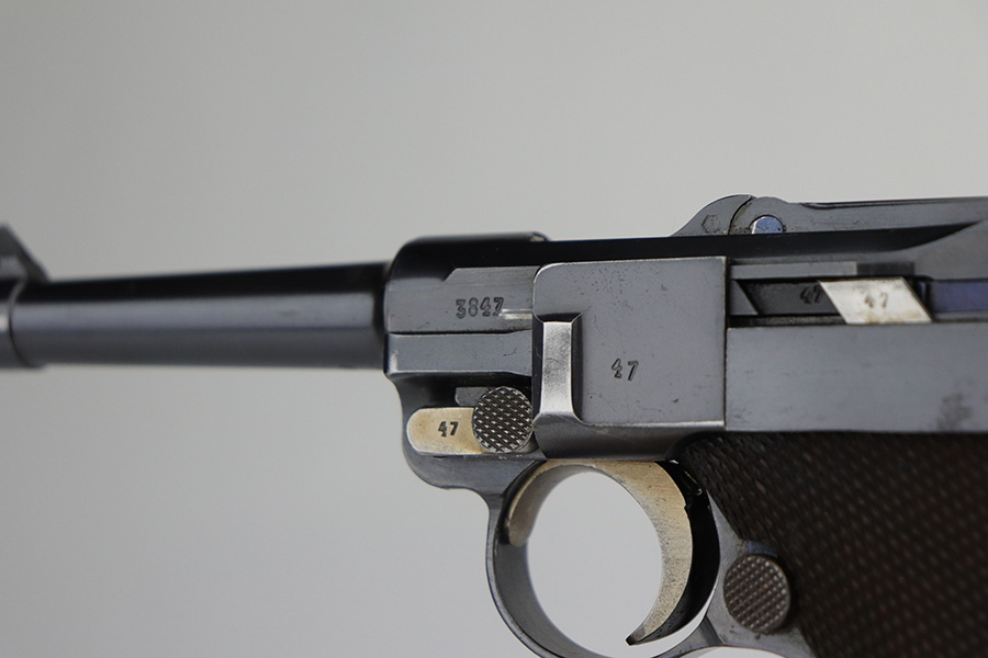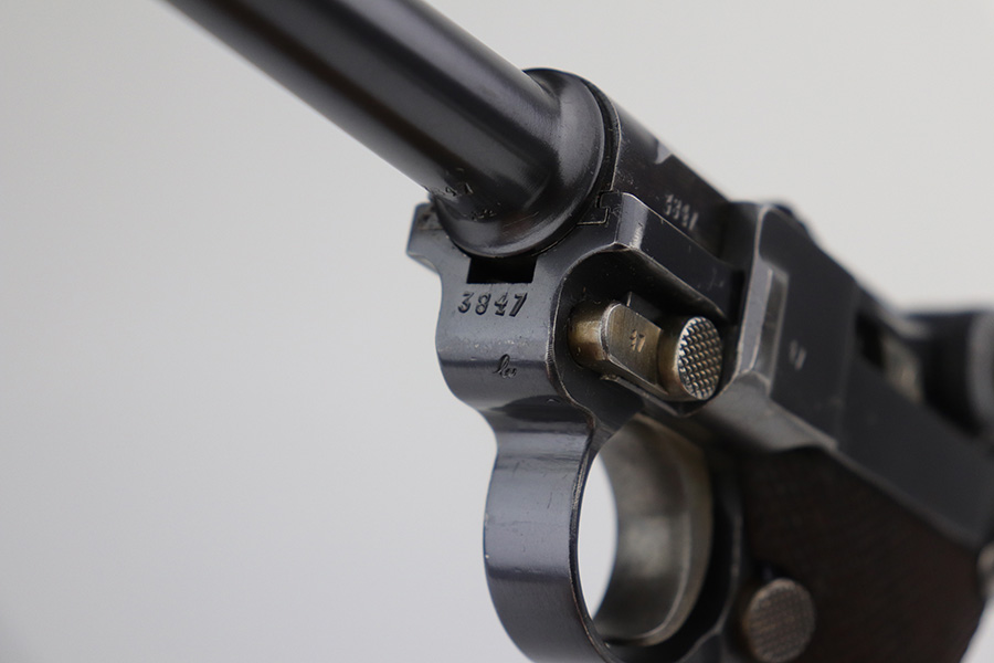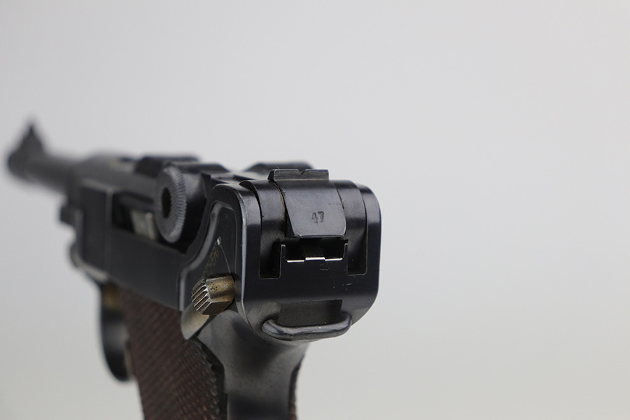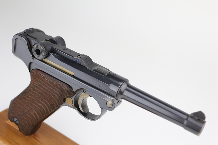 10/20/21 – This is an excellent example of a “G Date” Mauser Luger issued to the Nazi military in 1935. The gun is all matching, has a “G” on the chamber, and has the proper G Date Nazi military proofs on the right side of the slide. The small parts have lost most of the straw coloring, but the gun has retained about 96% of its original finish overall. There is very minor wear on the side plate, side rails, and around the muzzle. Hints of spotty wear on the straps. Spotty oxidation on both straps and one small area on the left side of the frame. Comes with excellent un-numbered wood grips – the left panel has a hand-scratched swastika on the inside. It also comes with a mismatched period-correct magazine with an “Eagle 154” proof on the bottom. The bore has decent rifling with minor pitting throughout.
