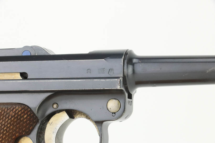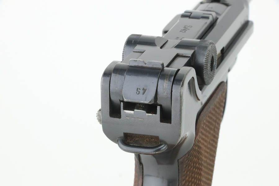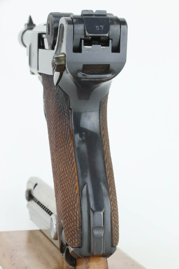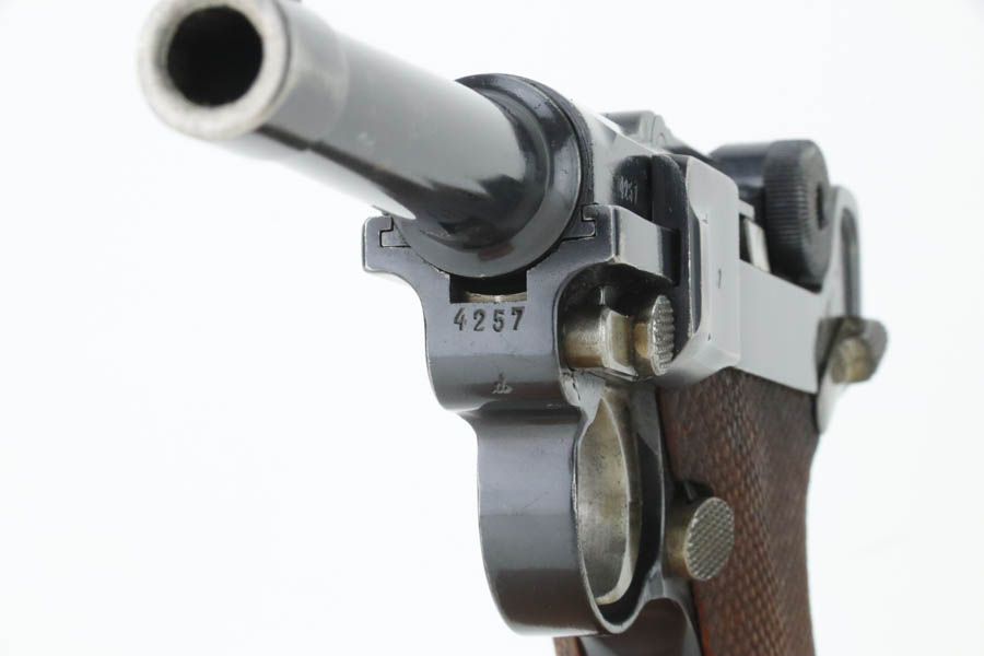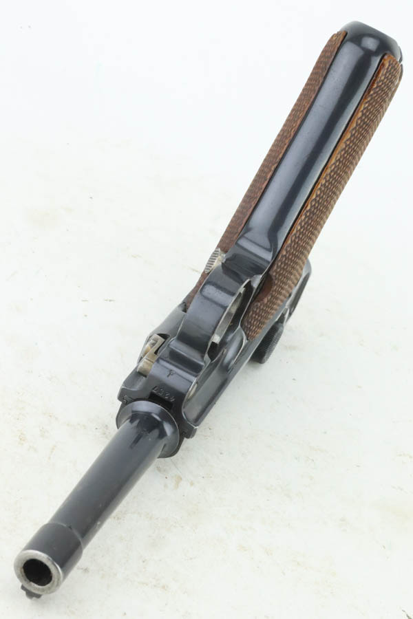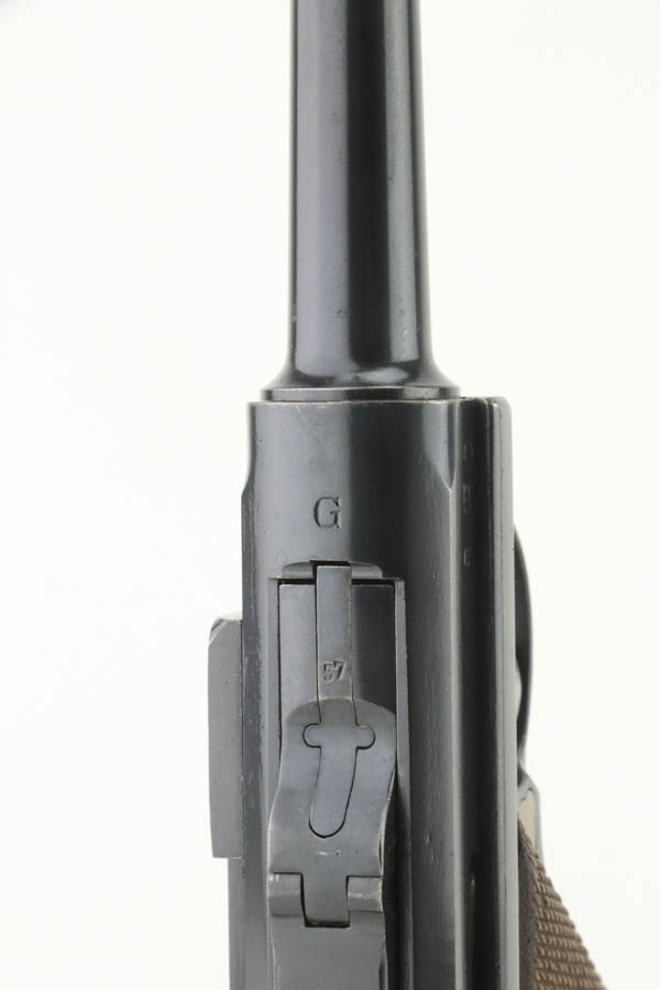 7/29/24 – This is an excellent example of a “G Date” Mauser Luger issued to the Nazi military in 1935. All matching with the proper “Eagle 211” and “S92” military inspection proofs. It is in excellent condition, retaining about 95% of its original finish. There is just minor high edge and muzzle wear. Beautiful grip straps and excellent straw-coloring on the small parts. Fitted with excellent un-numbered wood grips. Near-mint bore. There is a small chip in the ejector. We had our gunsmith examine it, and he says it will not affect functionality.