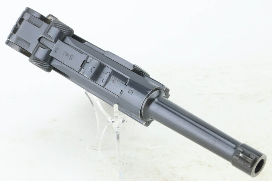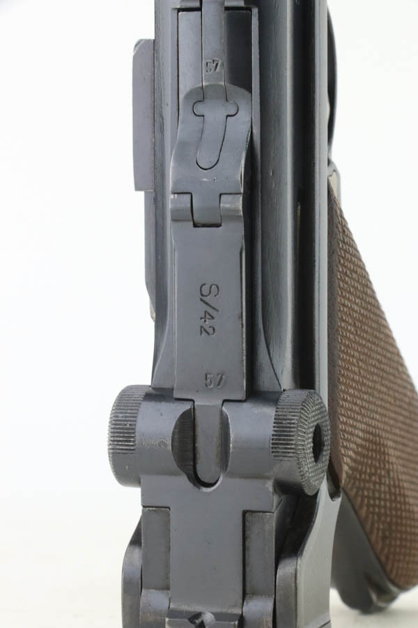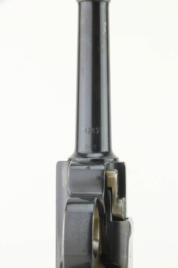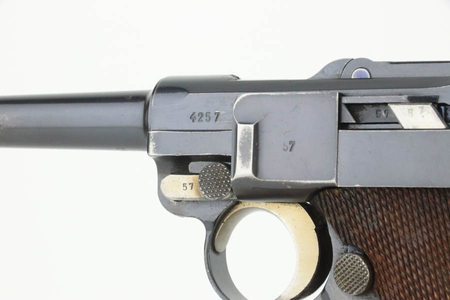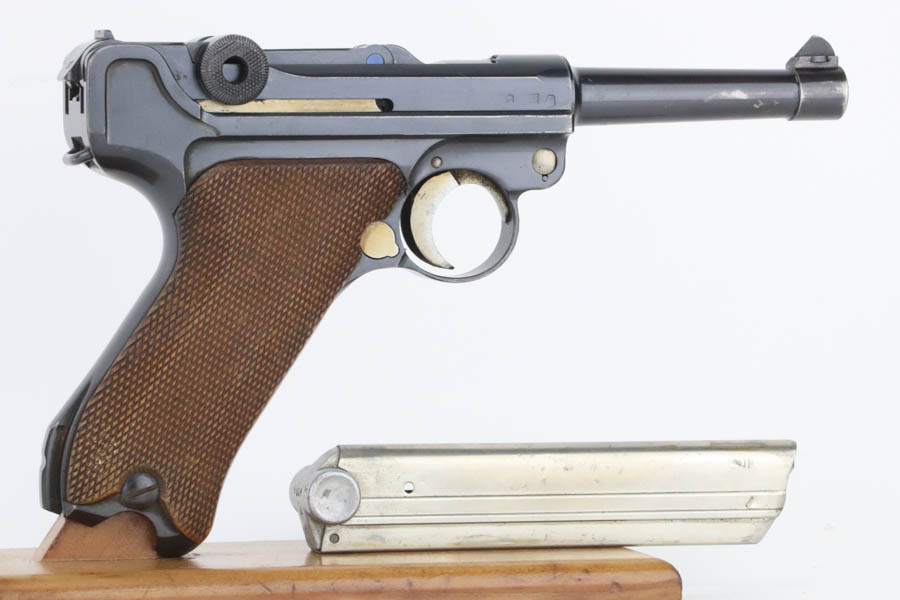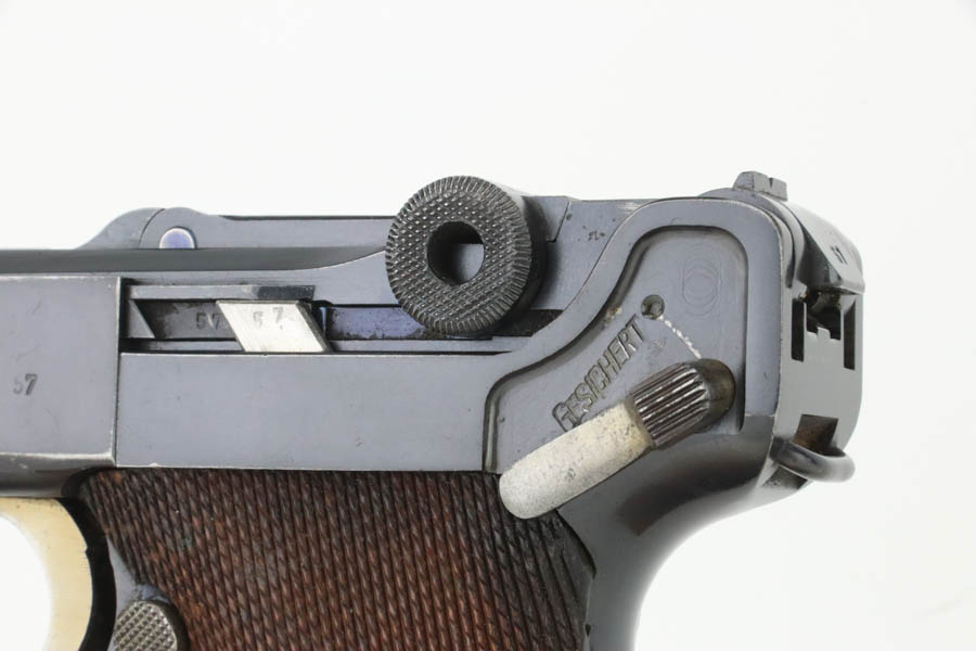 7/29/24 – This is an excellent example of a “G Date” Mauser Luger issued to the Nazi military in 1935. All matching with the proper “Eagle 211” and “S92” military inspection proofs. It is in excellent condition, retaining about 95% of its original finish. There is just minor high edge and muzzle wear. Beautiful grip straps and excellent straw-coloring on the small parts. Fitted with excellent un-numbered wood grips. Near-mint bore. There is a small chip in the ejector. We had our gunsmith examine it, and he says it will not affect functionality.