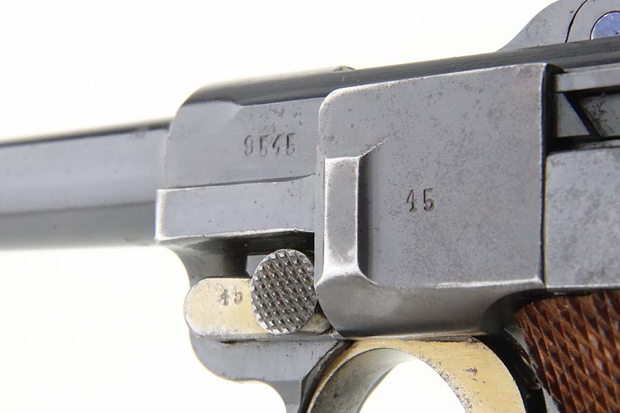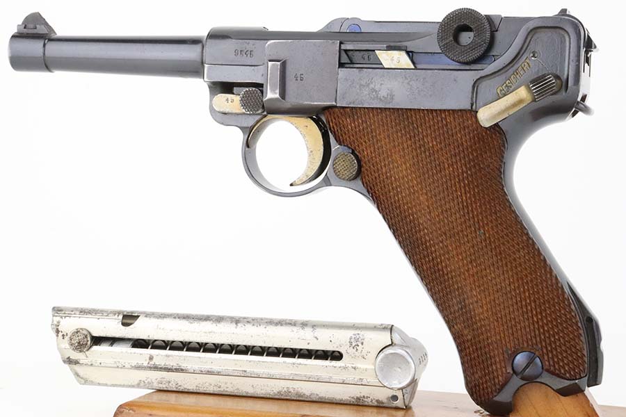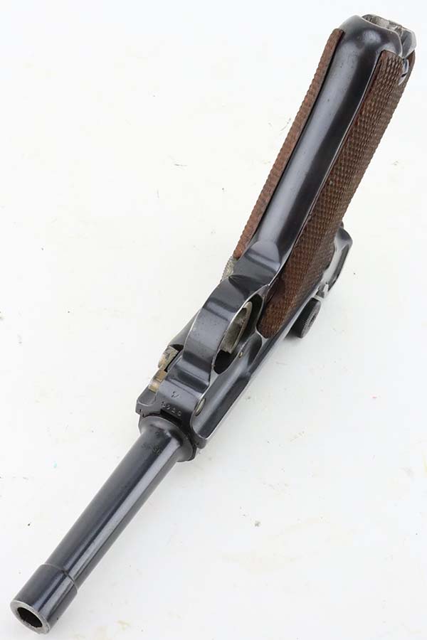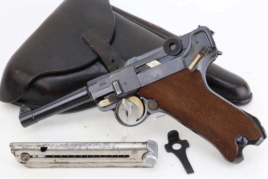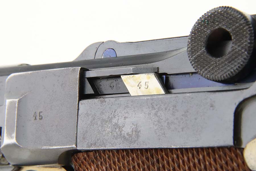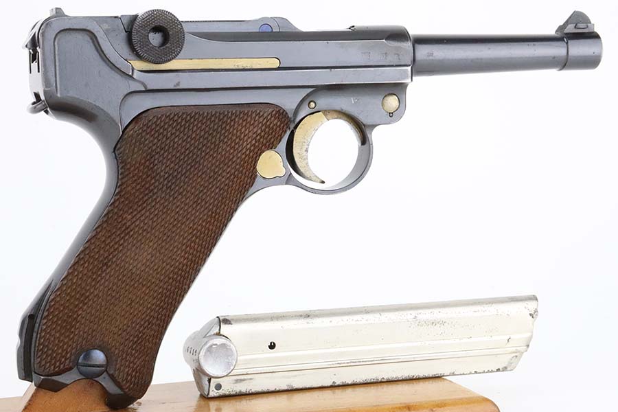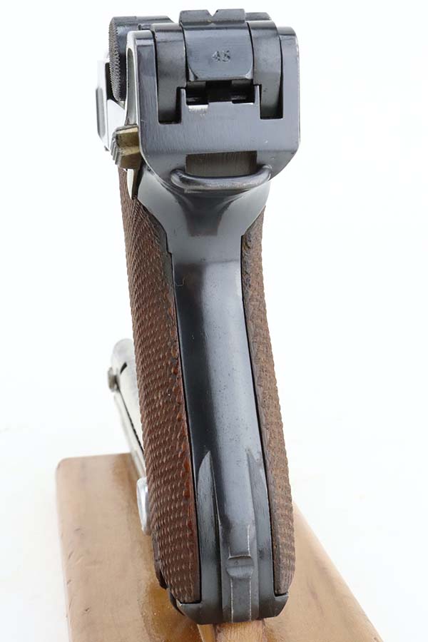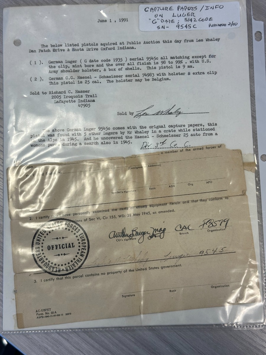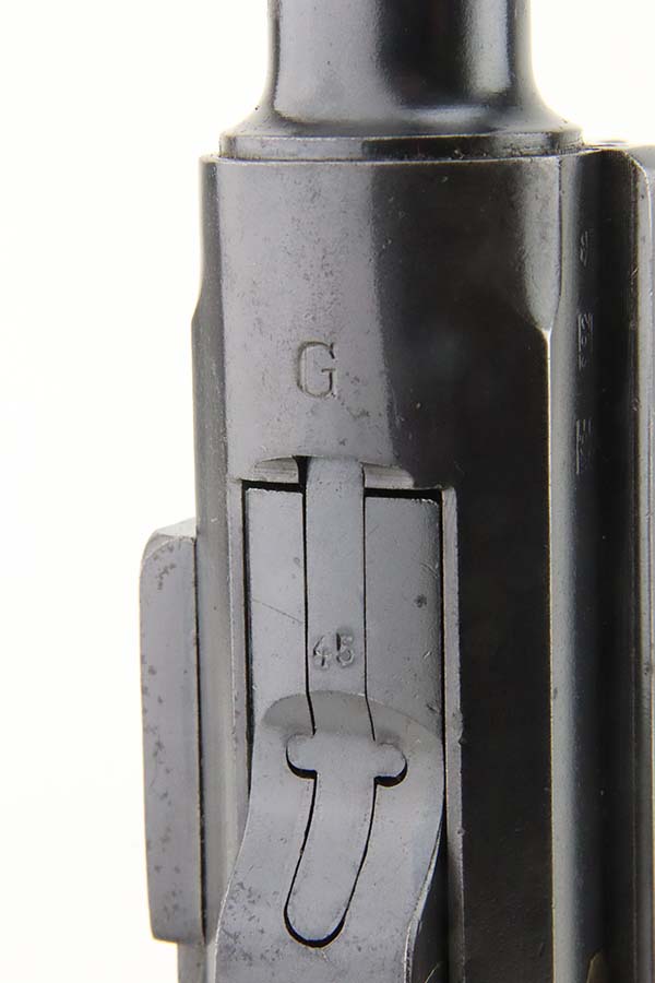 4/4/24 – This is an excellent example of a G Date Mauser Luger issued to the Nazi military in 1935. All matching with the proper “W154” and “S92” military acceptance proofs. Comes with capture document and signed documentation involving the auction sale of this rig in 1991. It comes as a rig with a mismatched “Eagle 154” magazine, an “Eagle 154” tool, and an interesting 1935-dated G Date holster. The 1935 date on the back of the holster appears to be correct, but the inside of the holster shows K Date-style pouches. This could either be a very early G Date holster that originally had K Date features or the pouches were added later. We can’t say for sure. The gun itself has retained about 97% of its finish with just very minor high edge wear and some light freckling on the left side of the frame. Excellent straw finish on the small parts. Fitted with minty un-numbered wood grips. Mint bore.