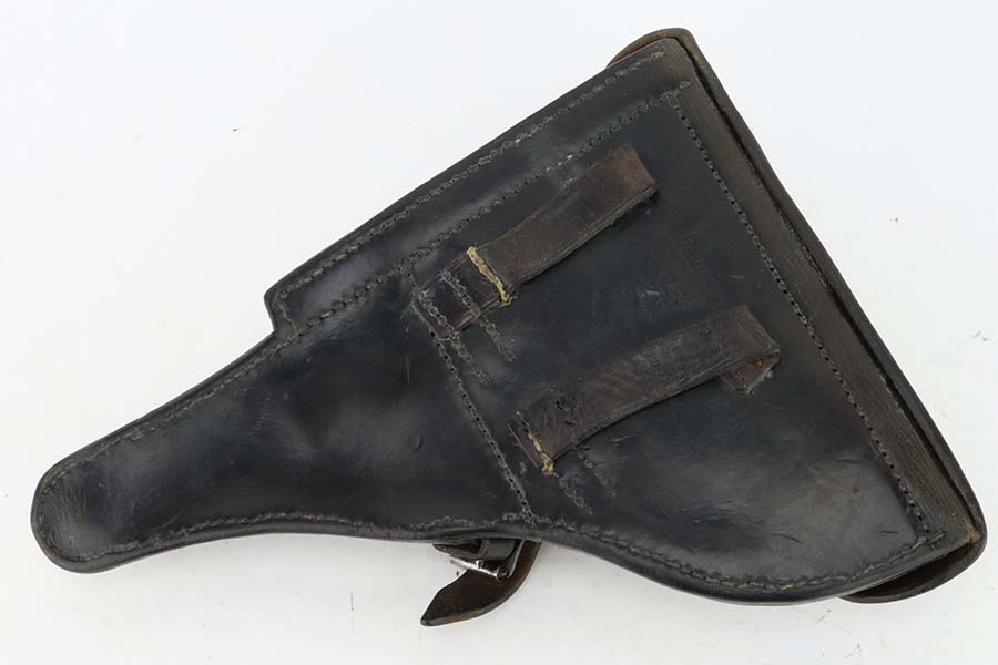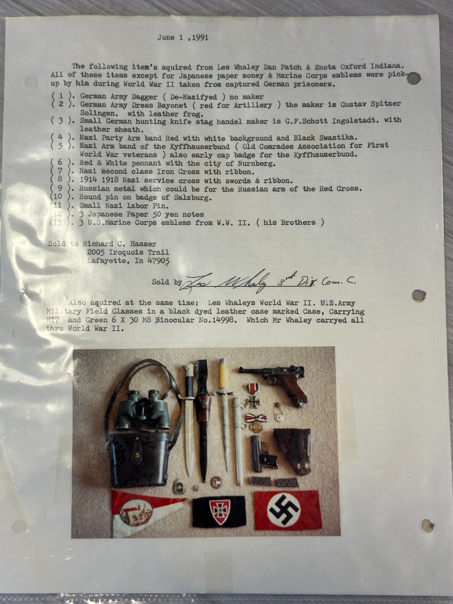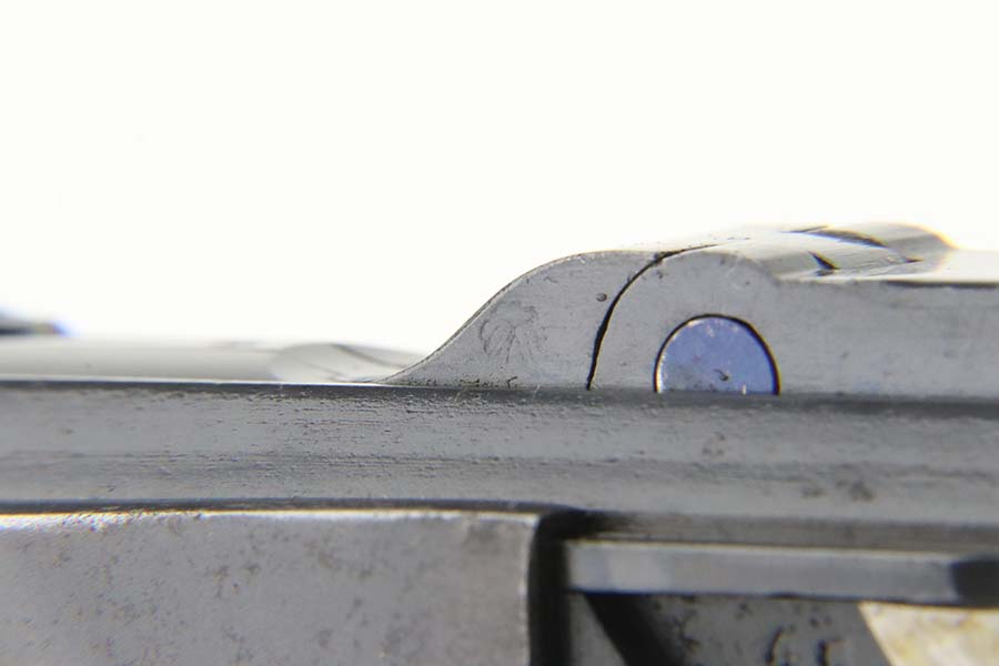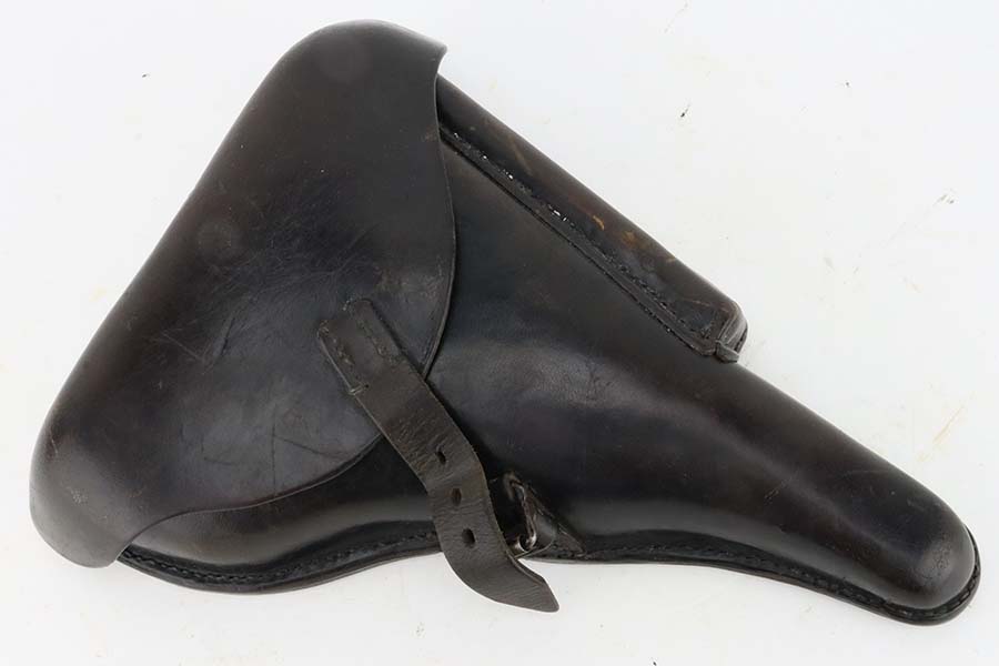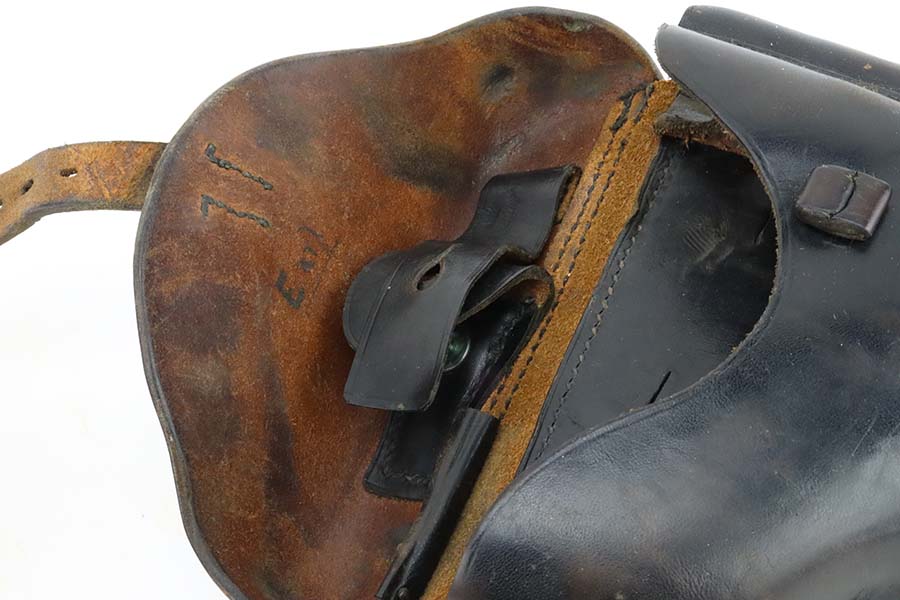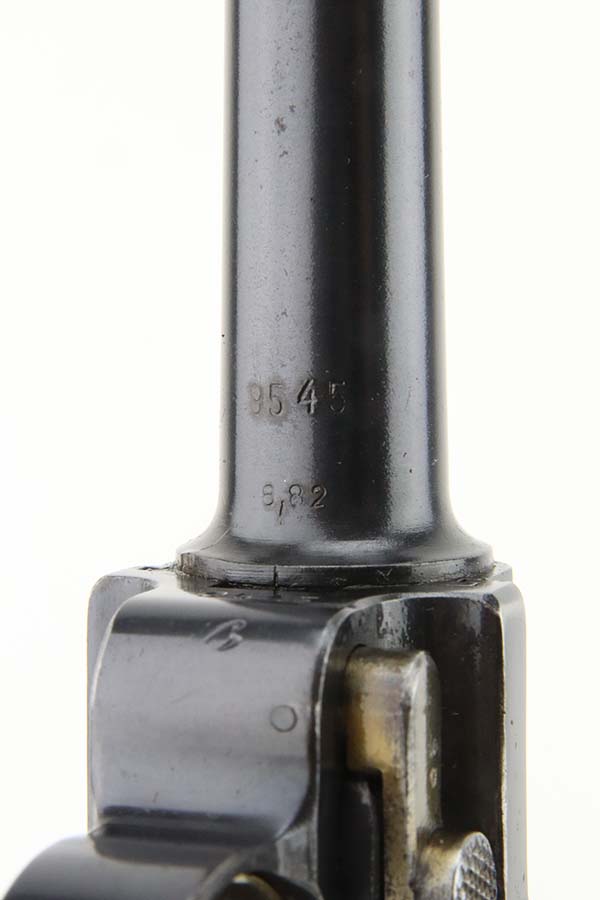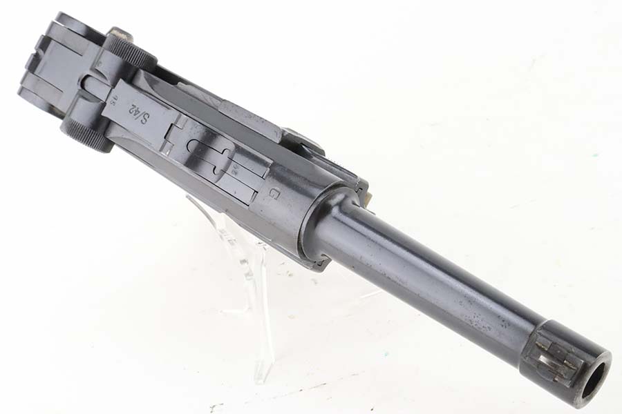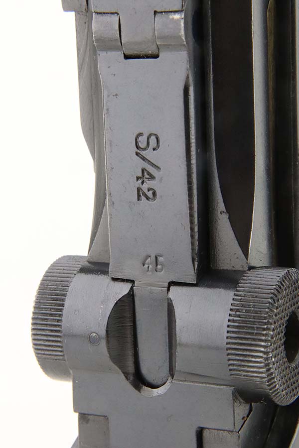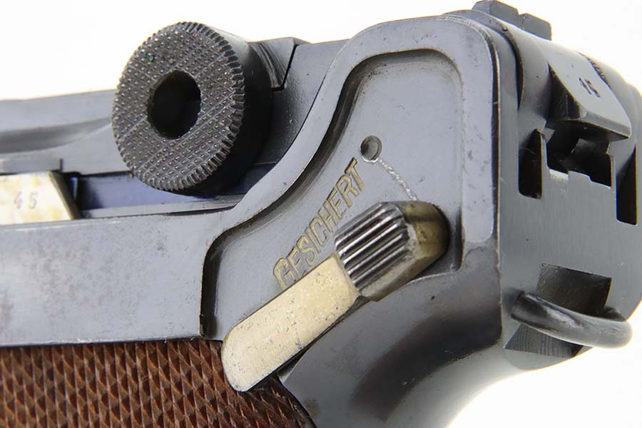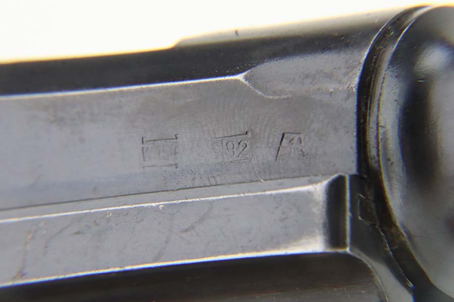 4/4/24 – This is an excellent example of a G Date Mauser Luger issued to the Nazi military in 1935. All matching with the proper “W154” and “S92” military acceptance proofs. Comes with capture document and signed documentation involving the auction sale of this rig in 1991. It comes as a rig with a mismatched “Eagle 154” magazine, an “Eagle 154” tool, and an interesting 1935-dated G Date holster. The 1935 date on the back of the holster appears to be correct, but the inside of the holster shows K Date-style pouches. This could either be a very early G Date holster that originally had K Date features or the pouches were added later. We can’t say for sure. The gun itself has retained about 97% of its finish with just very minor high edge wear and some light freckling on the left side of the frame. Excellent straw finish on the small parts. Fitted with minty un-numbered wood grips. Mint bore.