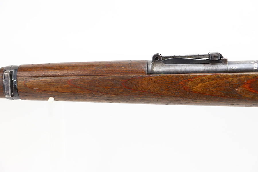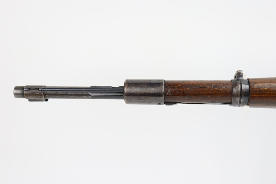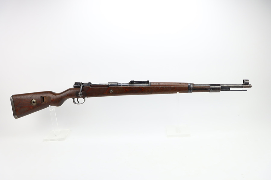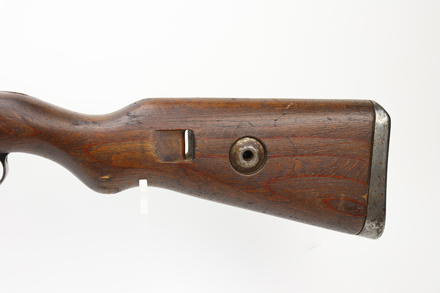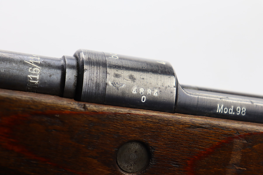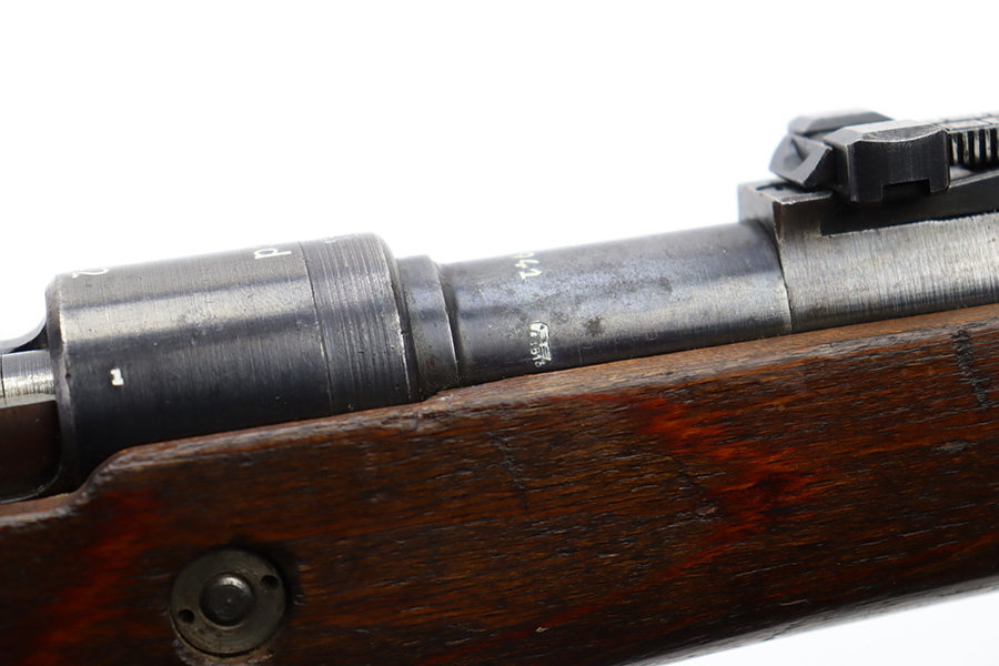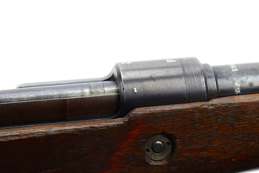 12/5/23 – This is a matching and original K98 rifle that was made in 1942 at the Gustloff-Werke factory and issued to the German military. All numbered parts match, including the receiver, barrel, bands, trigger group, rear sight, handguard and stock (internally), bolt release and bolt assembly. Follower is unmarked. The finish is original but shows thinning on most parts, and some splotchy discoloration on the barrel. Comes with cleaning rod and sight hood. Bore has strong rifling but frost and freckling in the grooves. Nice stock with minor handling wear but no cracks.
