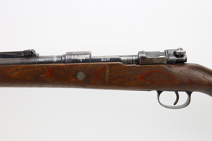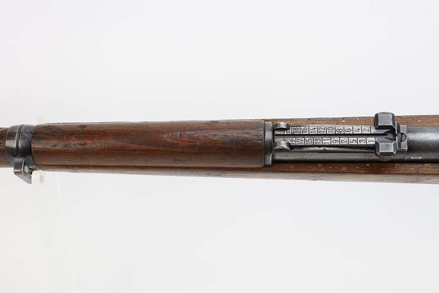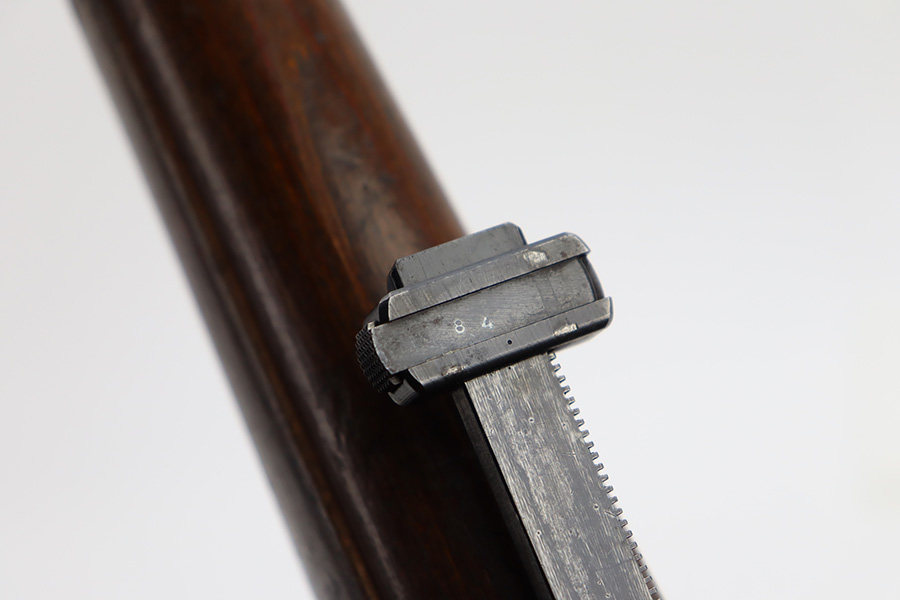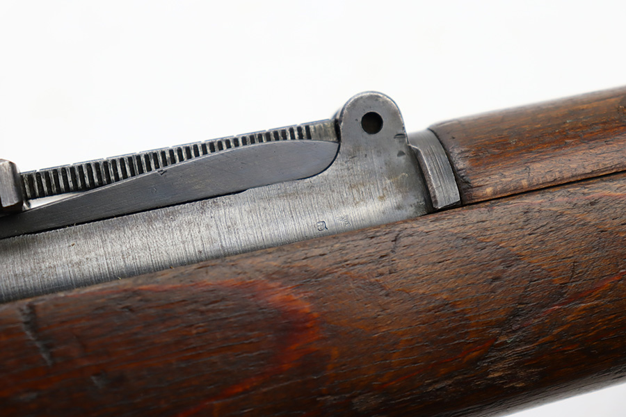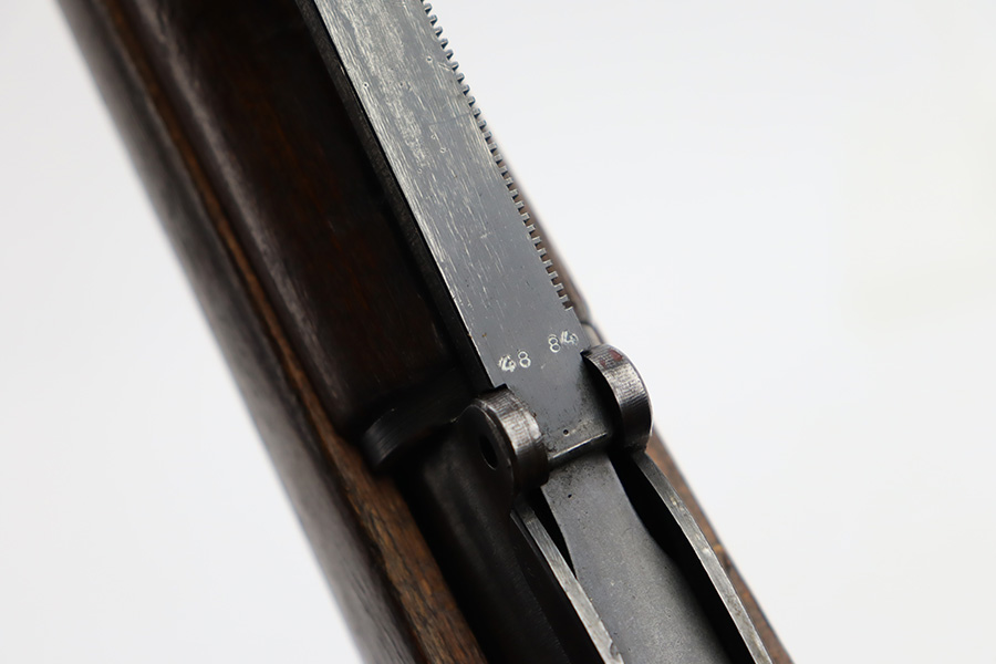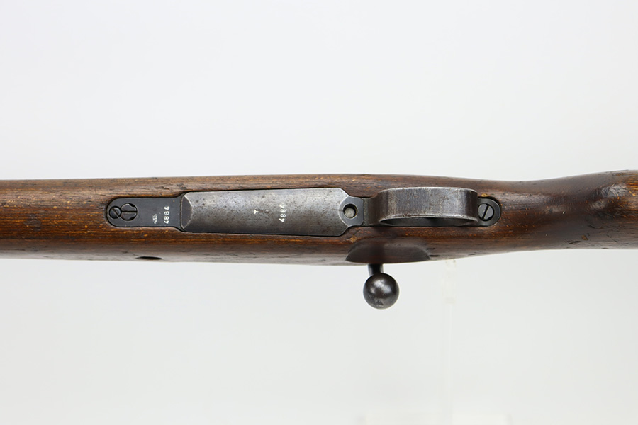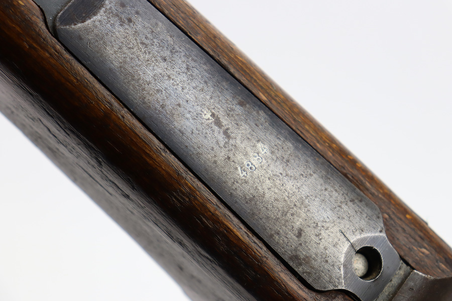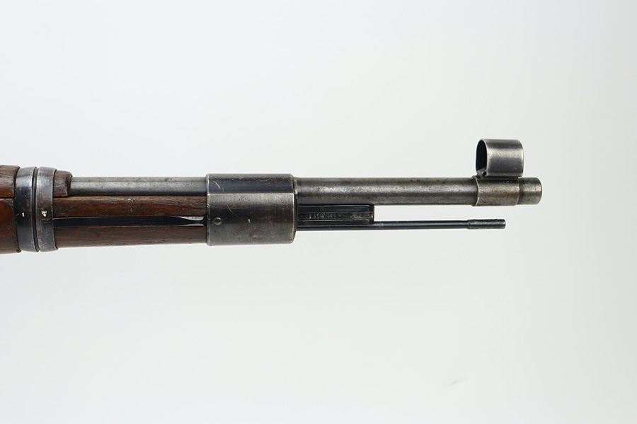 12/5/23 – This is a matching and original K98 rifle that was made in 1942 at the Gustloff-Werke factory and issued to the German military. All numbered parts match, including the receiver, barrel, bands, trigger group, rear sight, handguard and stock (internally), bolt release and bolt assembly. Follower is unmarked. The finish is original but shows thinning on most parts, and some splotchy discoloration on the barrel. Comes with cleaning rod and sight hood. Bore has strong rifling but frost and freckling in the grooves. Nice stock with minor handling wear but no cracks.