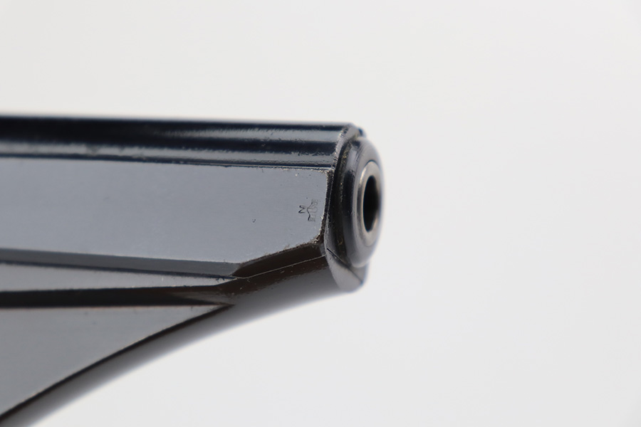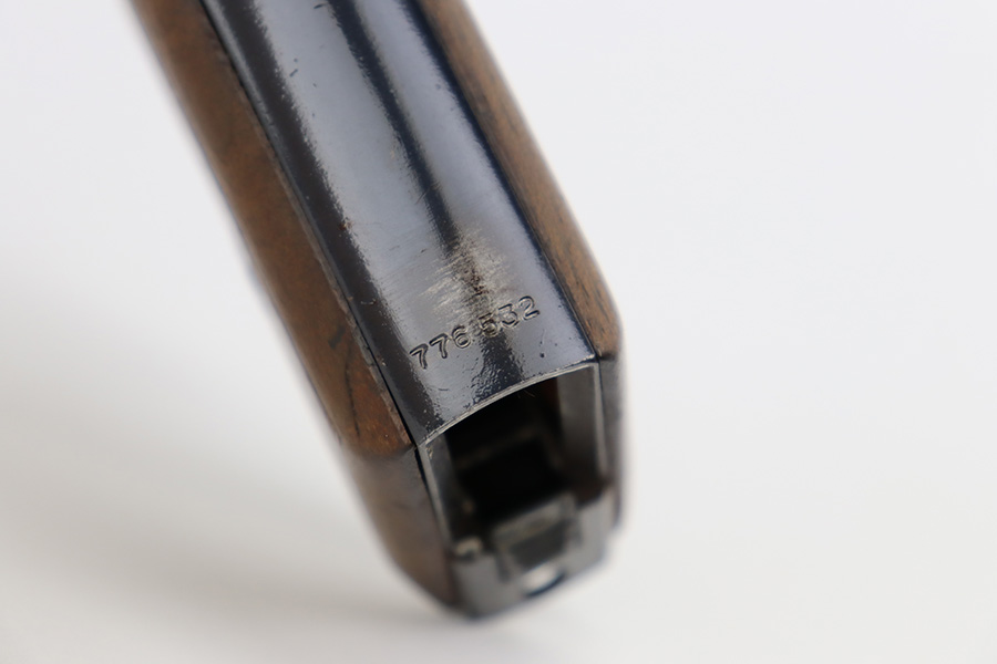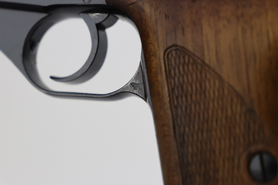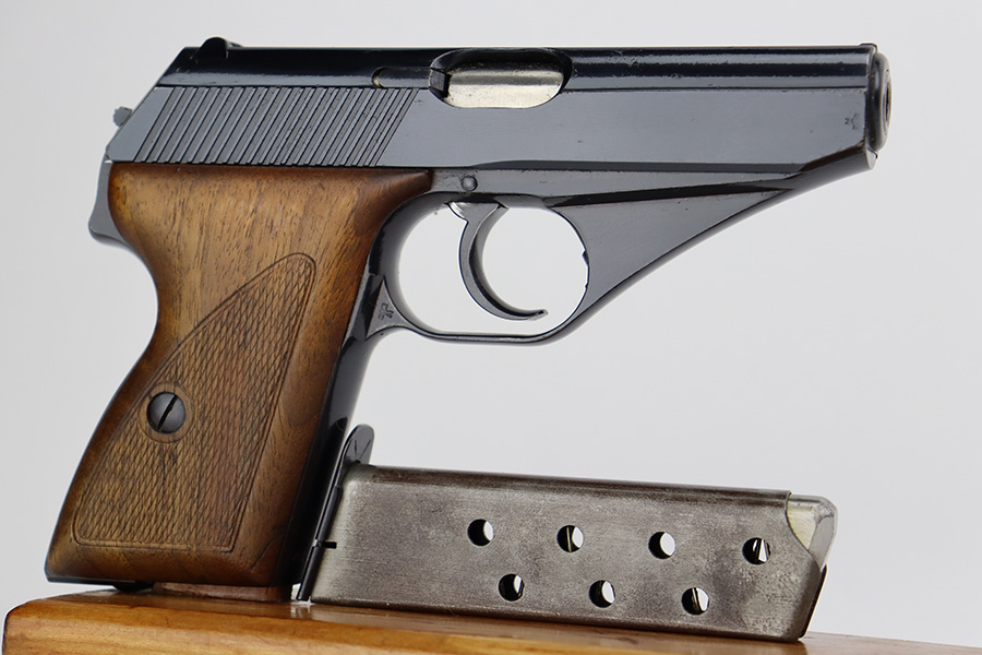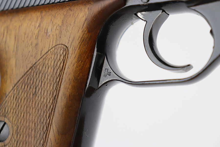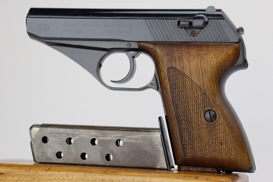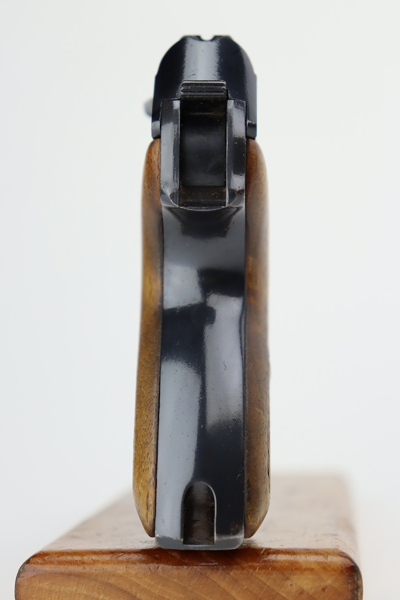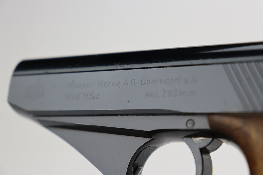 7/31/23 – This is an excellent example of a Mauser HSC issued to the Nazi police force in 1942. All matching with the proper police “Eagle L” proof on the left side of the trigger guard. It has retained about 97% of its original high polish finish. There is just one small area of very light scratchy wear on the front strap and a few tiny dots of discoloration along the left side of the slide. Fitted with excellent period-correct wood grips. Comes with one proper magazine. Like-new bore.