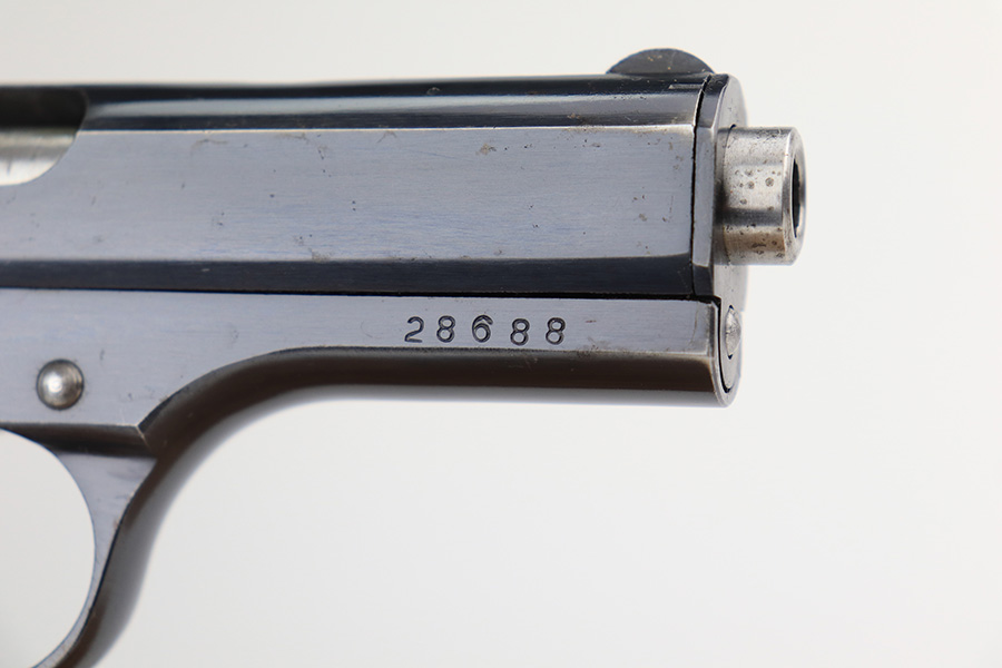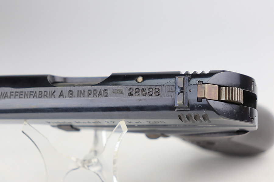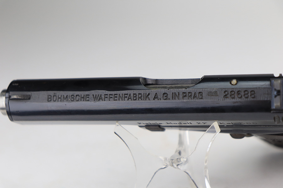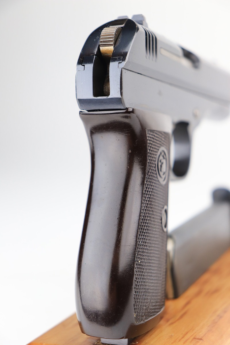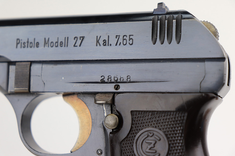 3/3/22 – This is an excellent example of a CZ Model 27 issued to the Nazi military during WW2. The gun is all matching and has the proper “Waffen 76” Nazi military acceptance proof on the right side of the frame. It has retained about 96-97% of its original high polish finish. There is just very minor wear on the high edges of the slide and a few small dots of light discoloration on the left side of the slide. There are some areas of minor dark discoloration here and there on all surfaces of the slide. Comes with a very nice period-correct grip and one proper magazine. There is one small chip in the bottom right corner of the grip. The bore is mint.