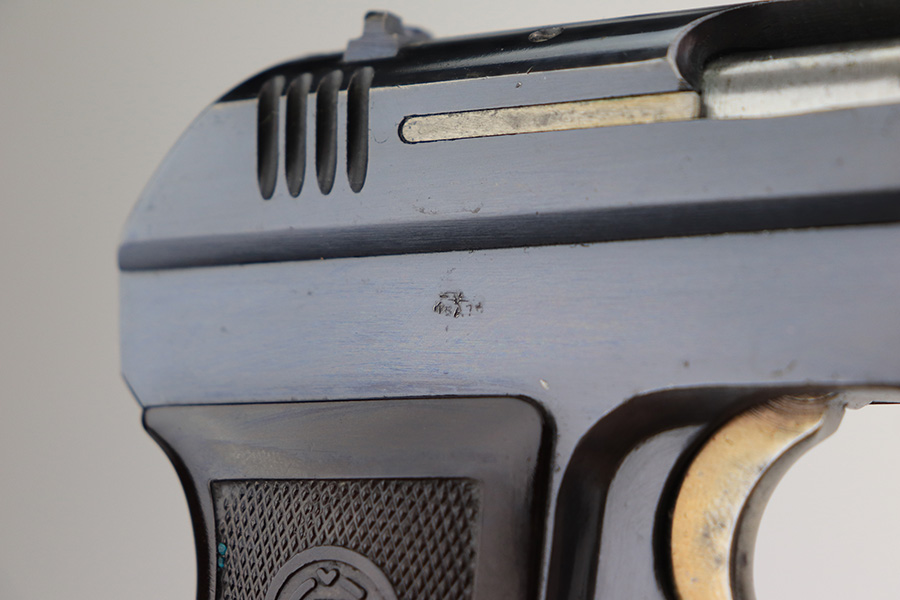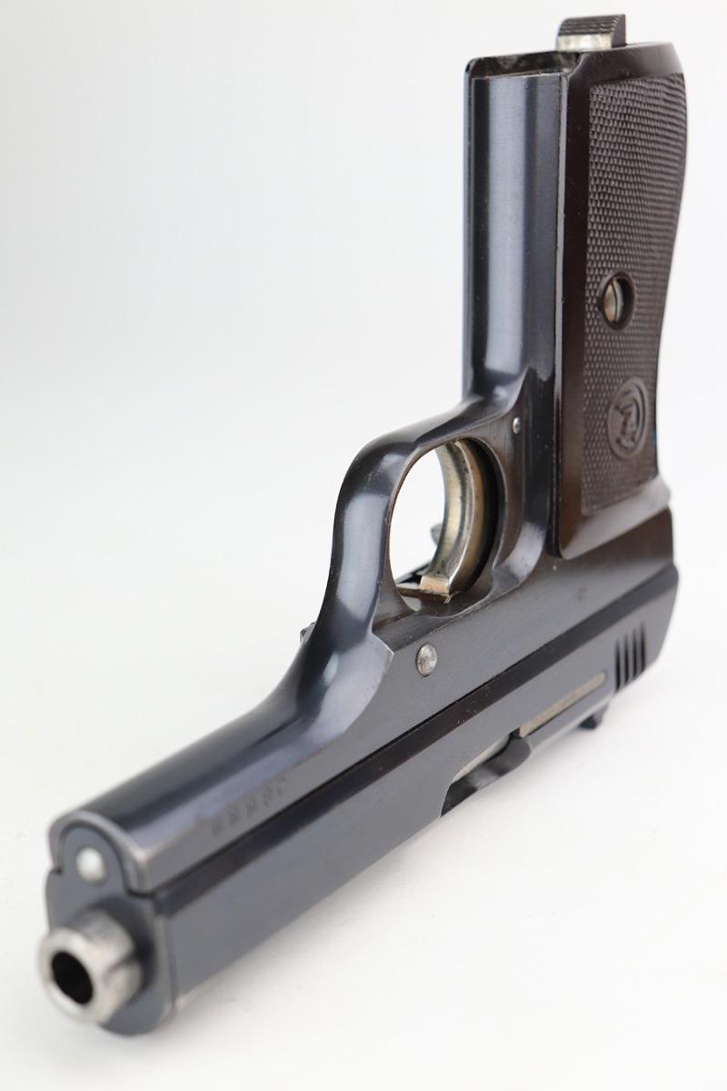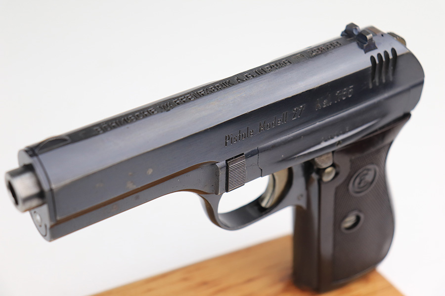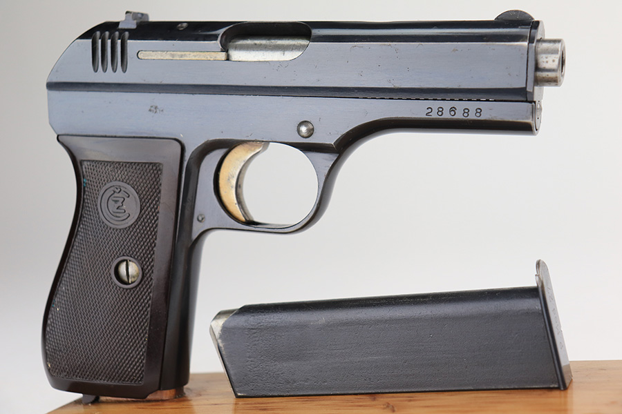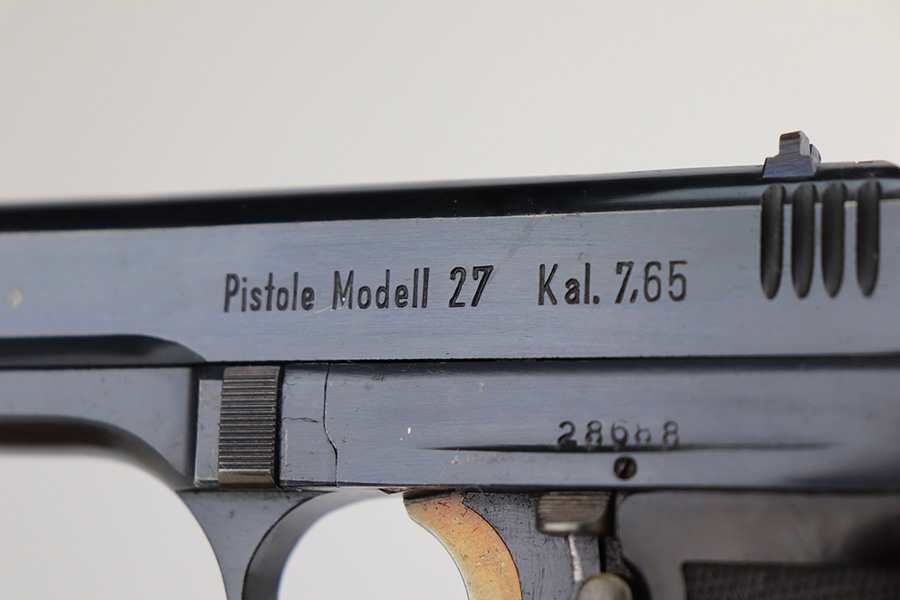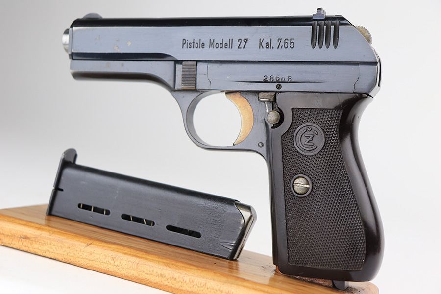 3/3/22 – This is an excellent example of a CZ Model 27 issued to the Nazi military during WW2. The gun is all matching and has the proper “Waffen 76” Nazi military acceptance proof on the right side of the frame. It has retained about 96-97% of its original high polish finish. There is just very minor wear on the high edges of the slide and a few small dots of light discoloration on the left side of the slide. There are some areas of minor dark discoloration here and there on all surfaces of the slide. Comes with a very nice period-correct grip and one proper magazine. There is one small chip in the bottom right corner of the grip. The bore is mint.