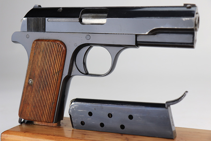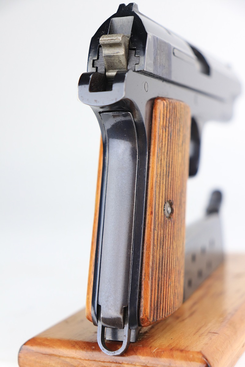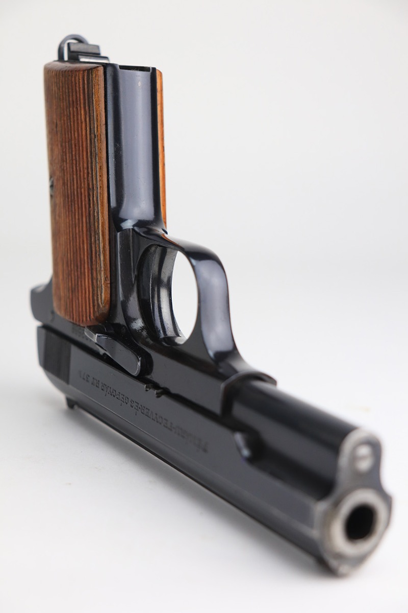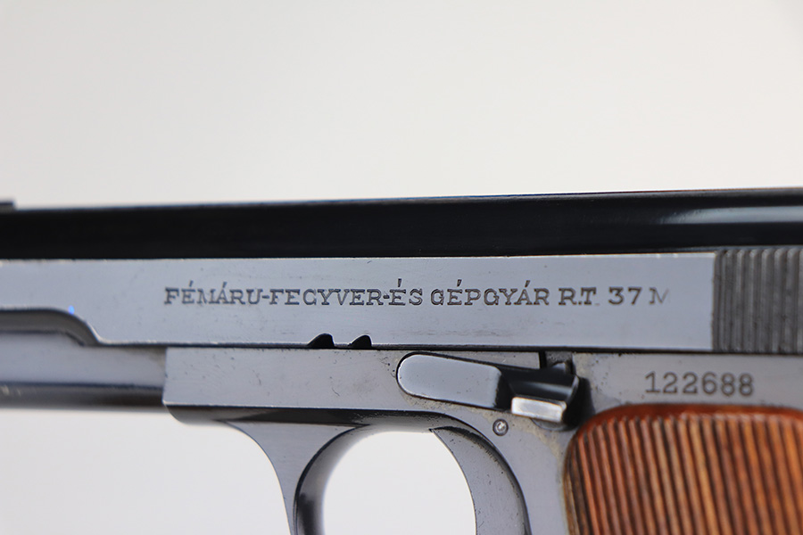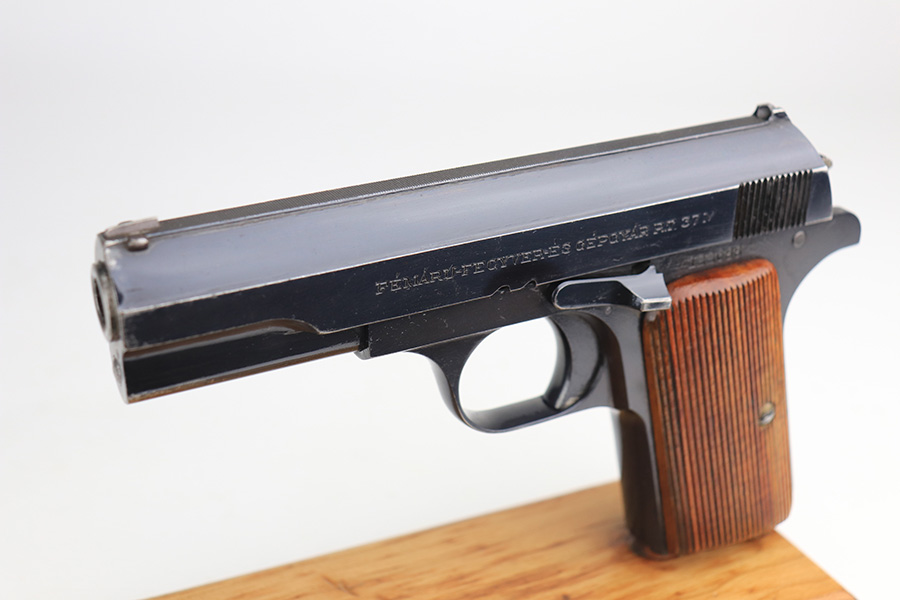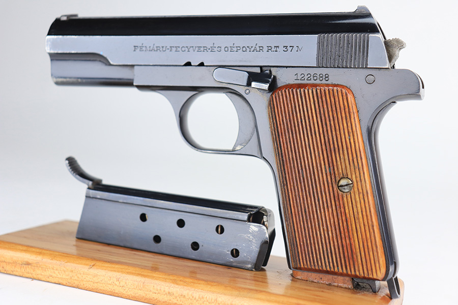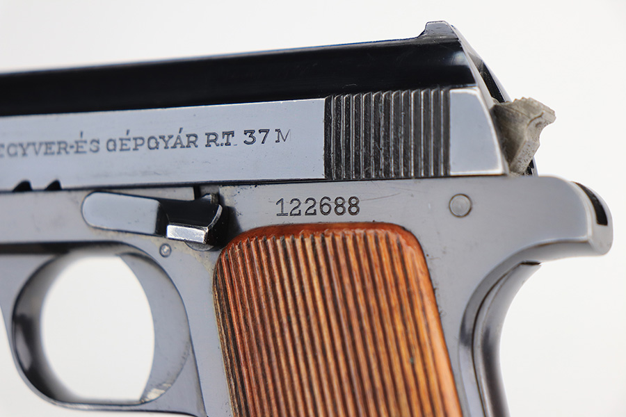 1/19/22 – This is an excellent Hungarian Femaru 37M pistol from 1941. All original with 96+% of the bluing remaining. Just some patina on the grip safety and a little bit of bluing loss on the left side of the slide. Bore has strong rifling but a little frost throughout. Excellent grips with hardly any handling wear. Correct magazine with ’37m’ mark on base.