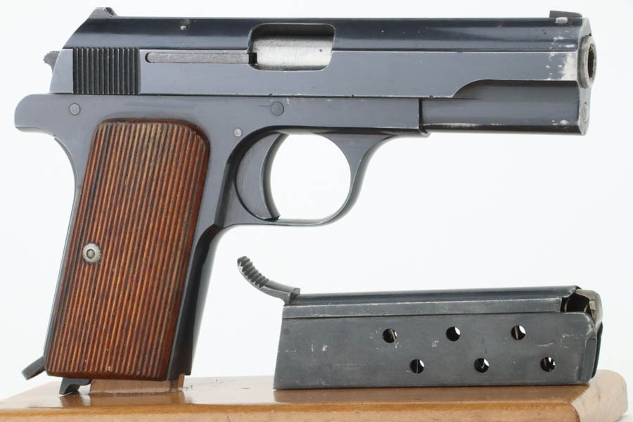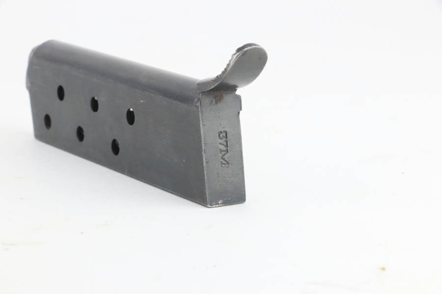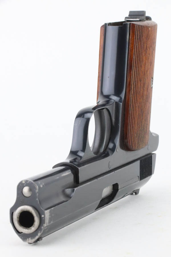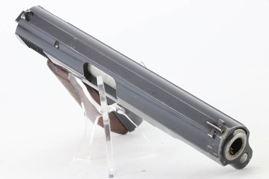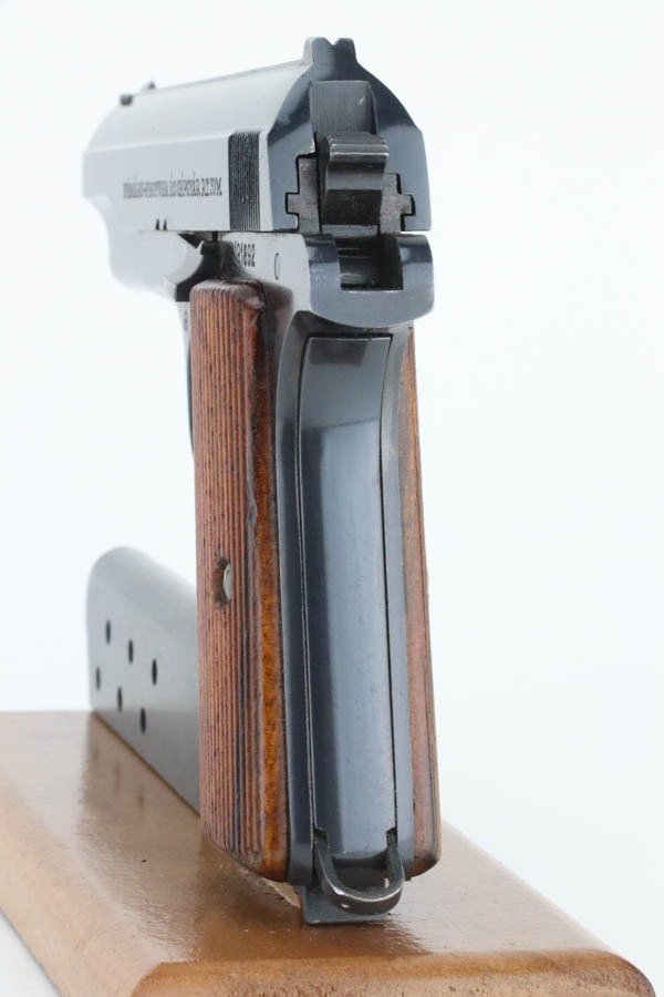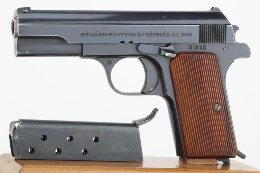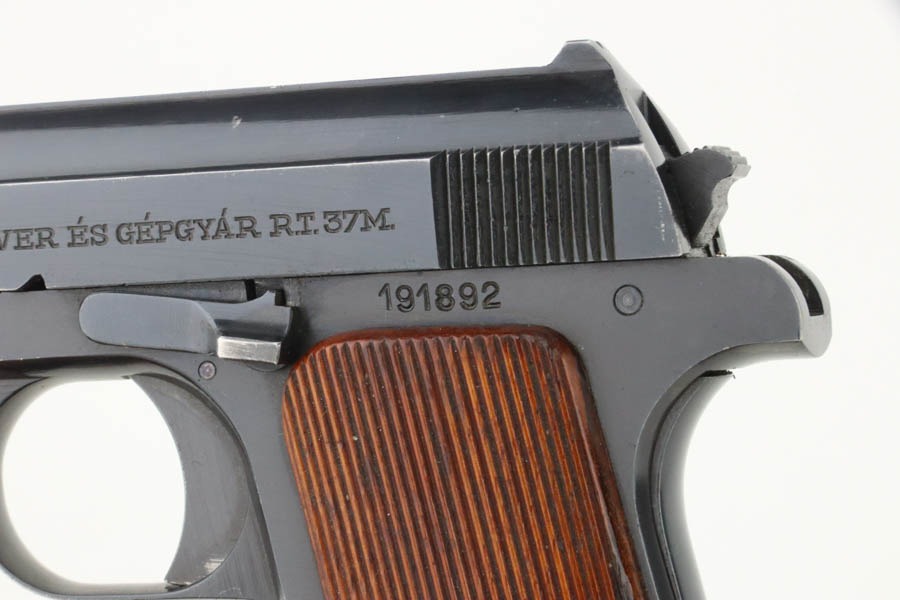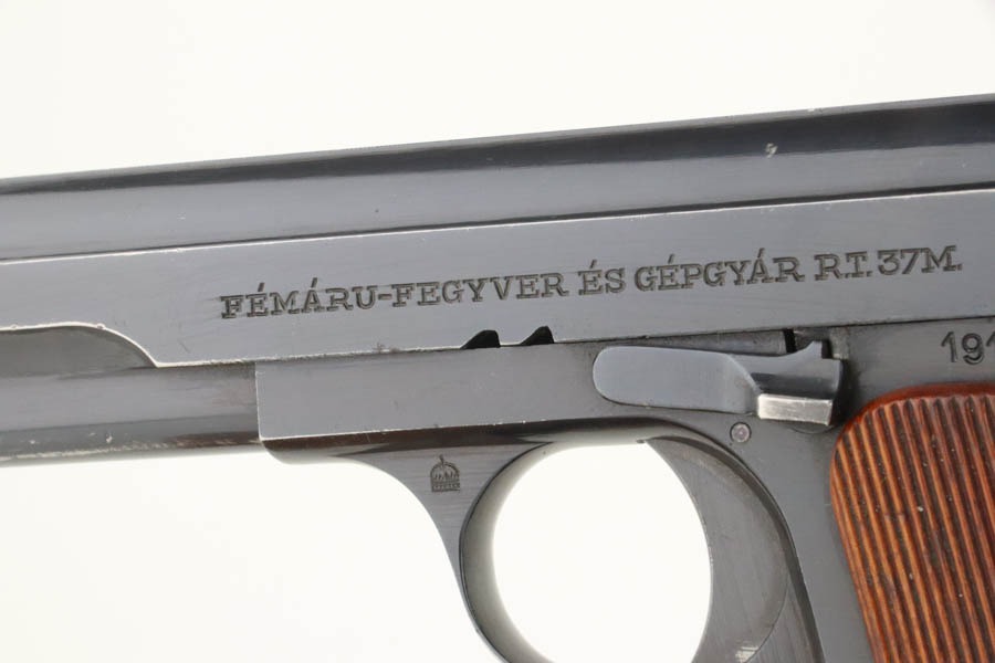 12/3/24 – This is an excellent example of a Hungarian Femaru Model 37 rig manufactured in 1943. It is all matching and has a “St. Stephen’s Crown” acceptance proof on the left side of the trigger guard. It is generally believed this a non-military mark but rather indicates commercial sale or police issue. It has retained about 96-97% of its original finish. There is wear around the muzzle and some tiny dings along the bottom edge of the right side of the slide. Fitted with wood grips and comes with a proper magazine. Excellent bore.