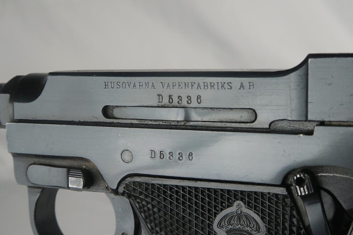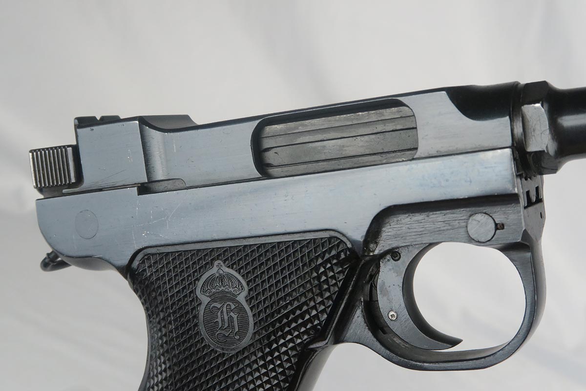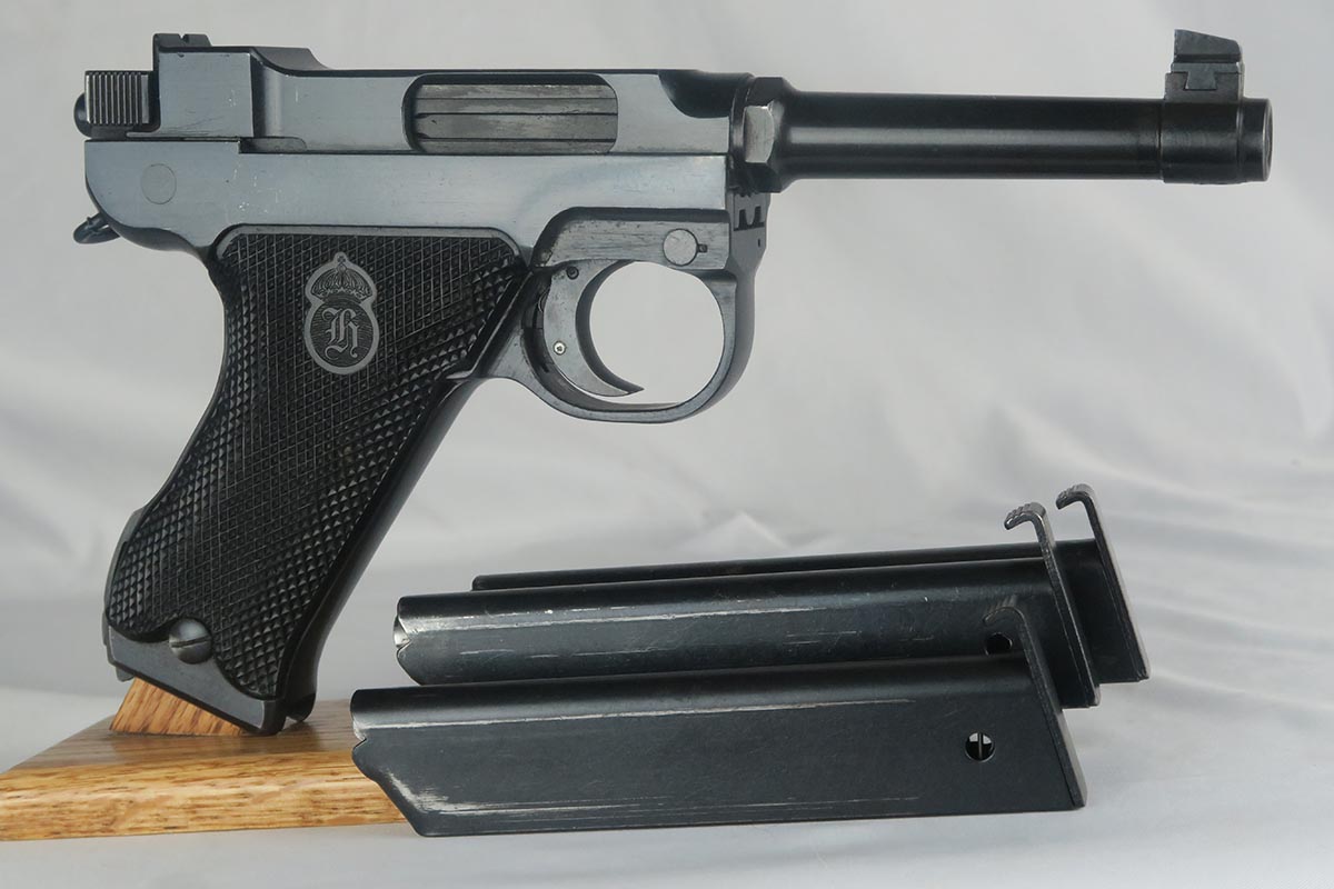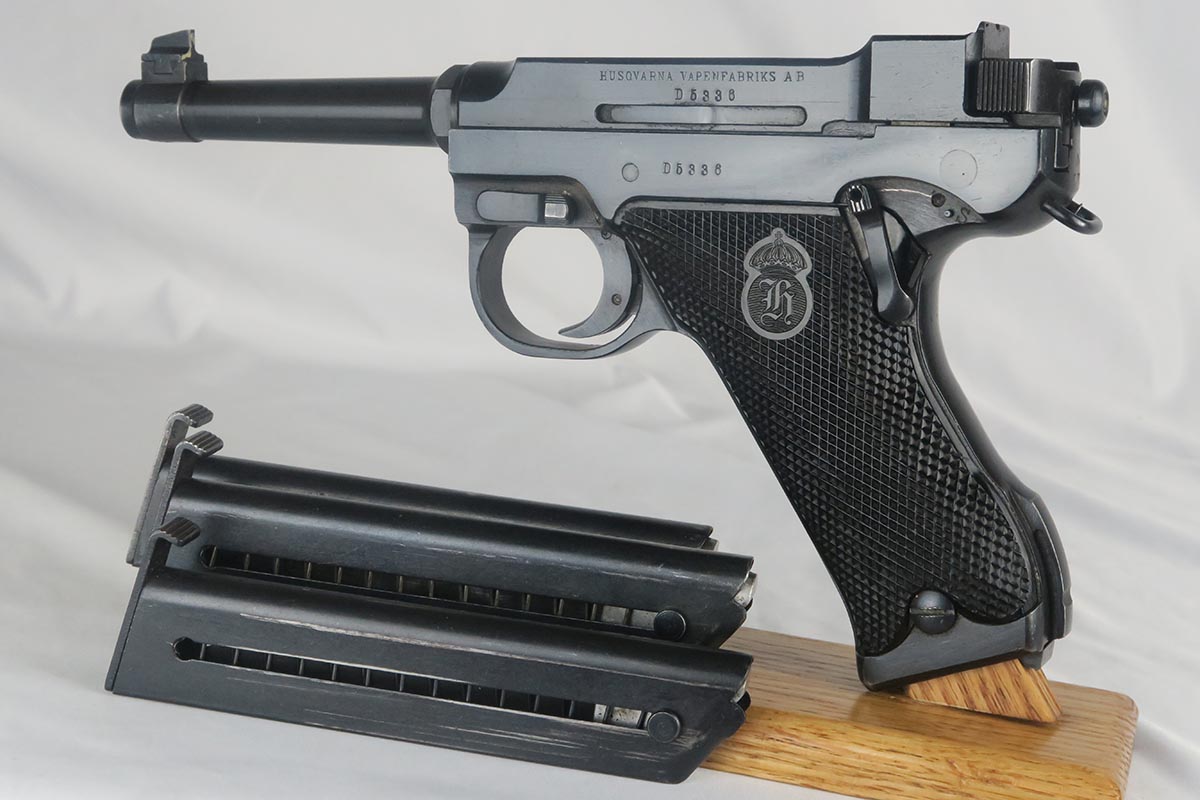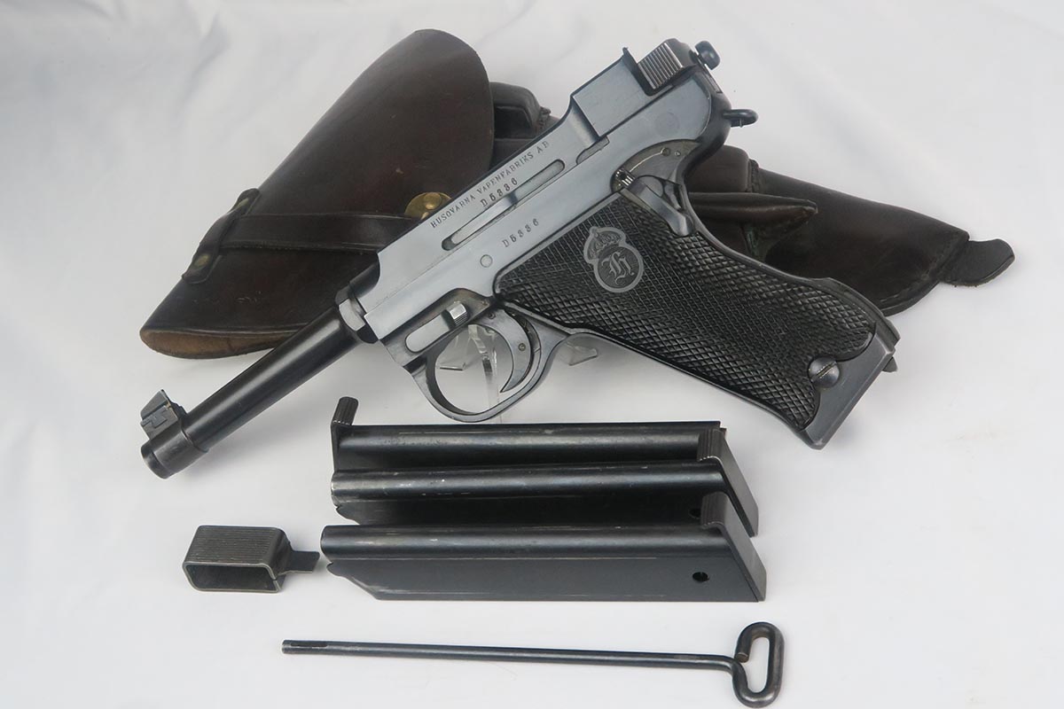 11/3/17 – The Husqvarna Model 40 or m/40 was manufactured 1940 to 1946 and was a Swedish copy of the Finnish Lahti pistol. The Swedish army realized there would be a shortage of pistols in the event of large scale military mobilization in Europe. Originally adopting the Walther P38 in 1939, Germany’s entry into World War II stopped the export of P38s to Sweden.  To compensate, Sweden adopted the Lahti pistol but was unable to import L-35-type guns because of Finland’s conflicts with the USSR.  Production was licensed to Svenska Automatvapen AB but the immediate collapse of the company passed the contract to Husqvarna Vapenfabriks Aktiebolag.  The first m/40s were delivered to the Swedish military by 1942 with slight differences from the Finnish L-35 Lahtis.  The grips of the m/40 have the Husqvarna “crown H” motif engraved and the front sight was slightly larger. The barrel is also slightly longer on the m/40 than the Finnish Lahti with the m/40’s trigger guard being heavier, and the pistol does not have the loaded chamber indicator and lock-retaining spring of the Finnish Lahti.   This particular pistol is part of a smaller Danish contract, as evidenced by the D-prefix in the serial.  The finish on this pistol rates at over 98%, with minor muzzle wear on the left side.  The pistol is all correct and original.  Comes as part of a full rig, with tool, two spare magazines and a Husqvarna marked holster.  All pieces included range from very good to excellent, and the pistol has an excellent bore.