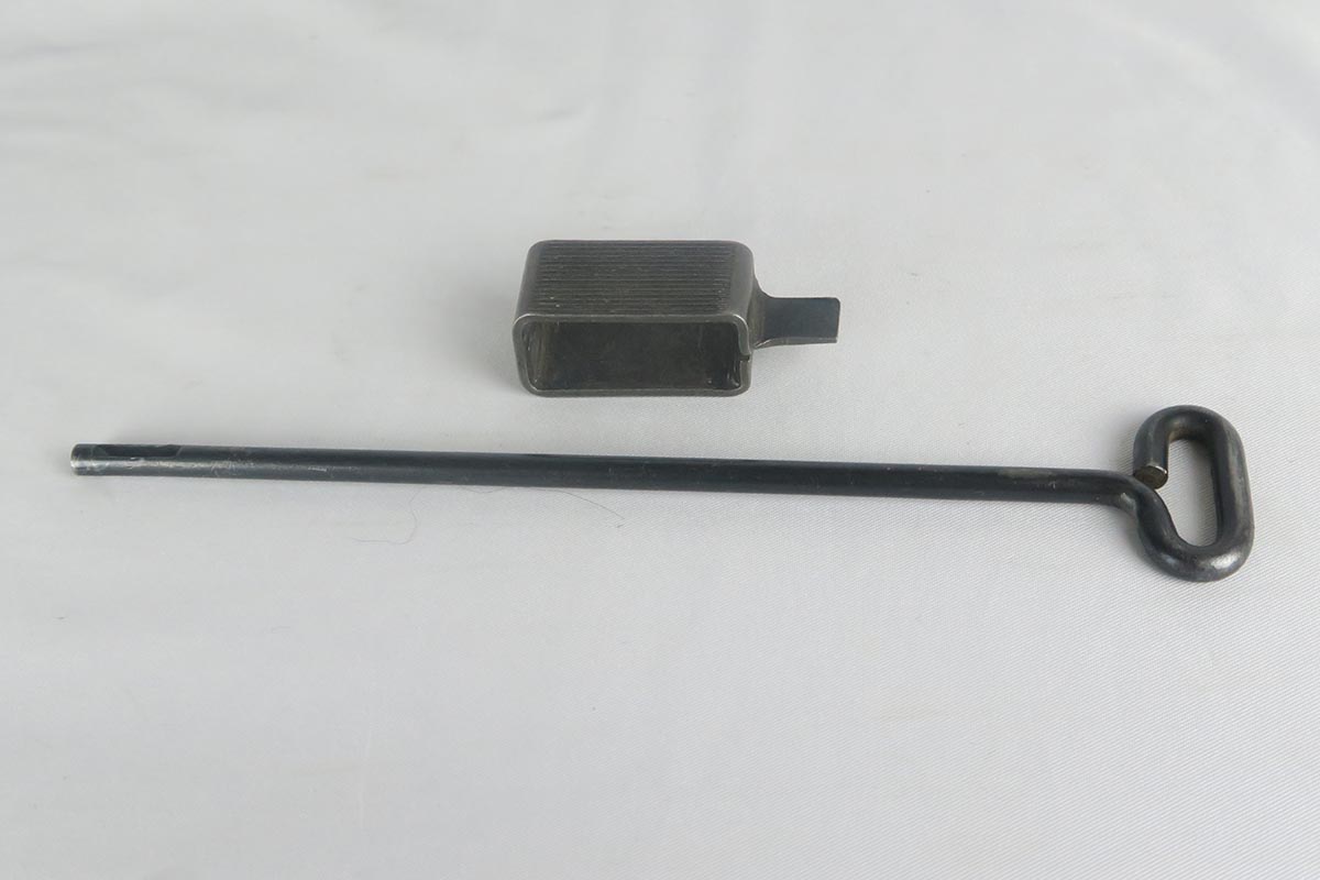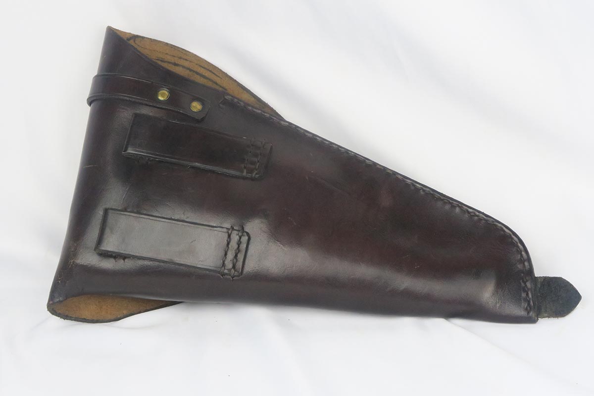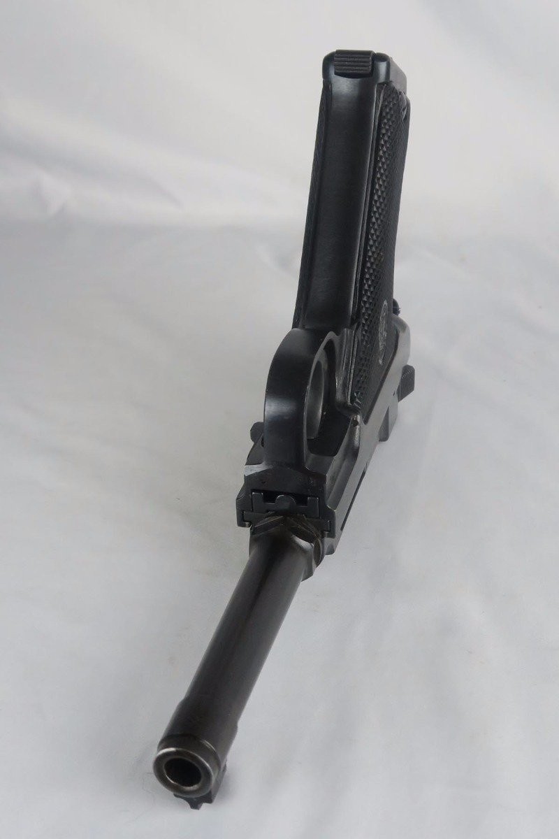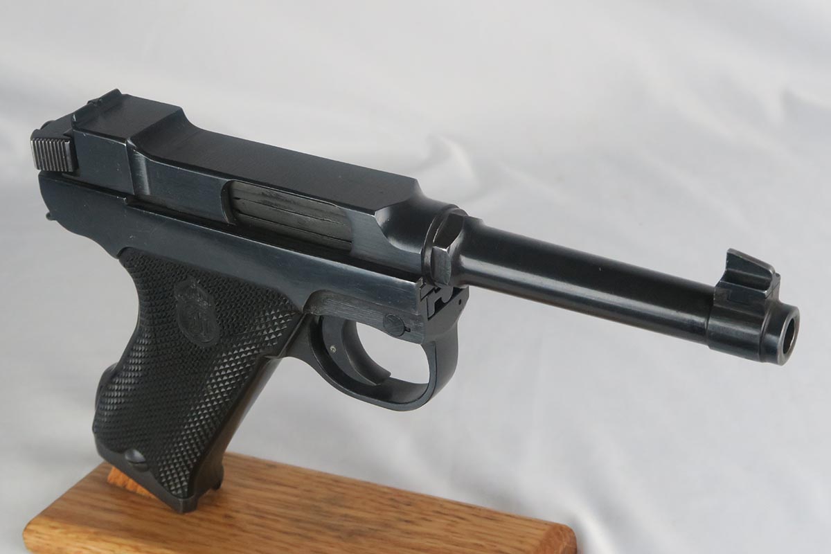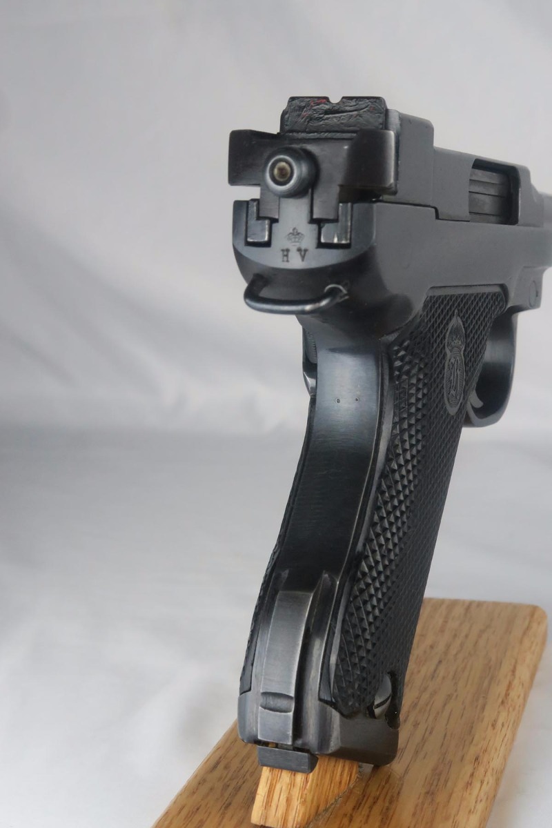 11/3/17 – The Husqvarna Model 40 or m/40 was manufactured 1940 to 1946 and was a Swedish copy of the Finnish Lahti pistol. The Swedish army realized there would be a shortage of pistols in the event of large scale military mobilization in Europe. Originally adopting the Walther P38 in 1939, Germany’s entry into World War II stopped the export of P38s to Sweden.  To compensate, Sweden adopted the Lahti pistol but was unable to import L-35-type guns because of Finland’s conflicts with the USSR.  Production was licensed to Svenska Automatvapen AB but the immediate collapse of the company passed the contract to Husqvarna Vapenfabriks Aktiebolag.  The first m/40s were delivered to the Swedish military by 1942 with slight differences from the Finnish L-35 Lahtis.  The grips of the m/40 have the Husqvarna “crown H” motif engraved and the front sight was slightly larger. The barrel is also slightly longer on the m/40 than the Finnish Lahti with the m/40’s trigger guard being heavier, and the pistol does not have the loaded chamber indicator and lock-retaining spring of the Finnish Lahti.   This particular pistol is part of a smaller Danish contract, as evidenced by the D-prefix in the serial.  The finish on this pistol rates at over 98%, with minor muzzle wear on the left side.  The pistol is all correct and original.  Comes as part of a full rig, with tool, two spare magazines and a Husqvarna marked holster.  All pieces included range from very good to excellent, and the pistol has an excellent bore.