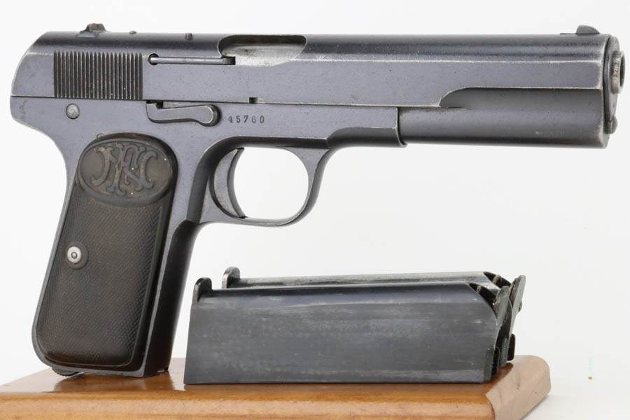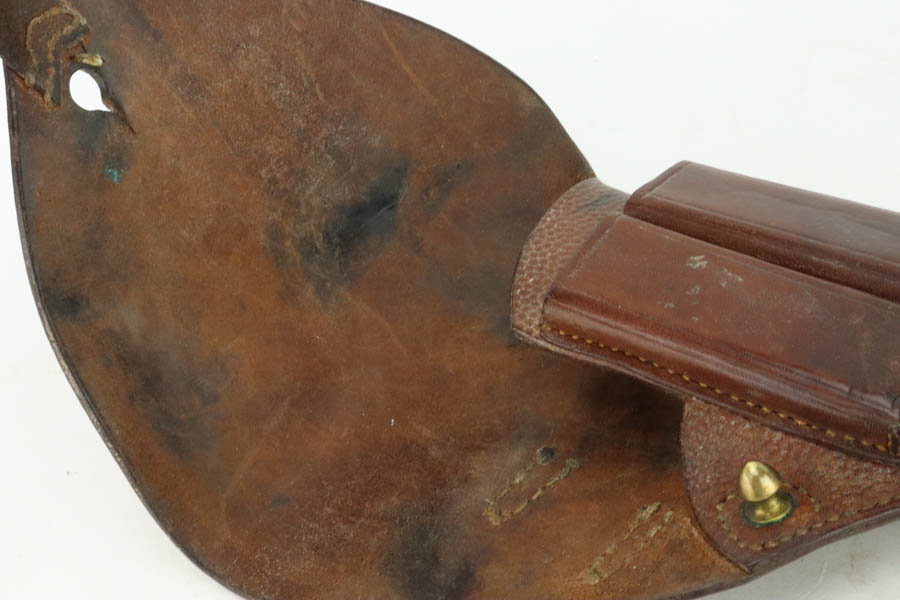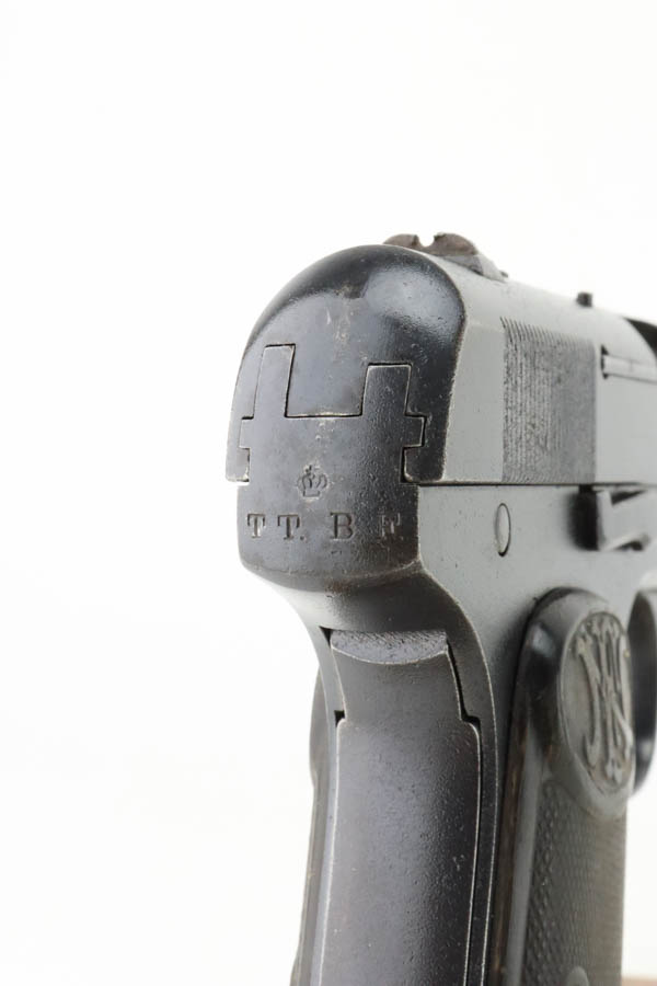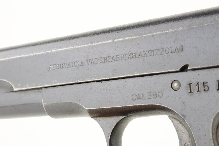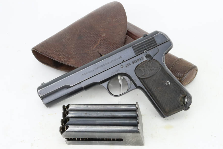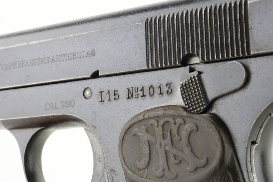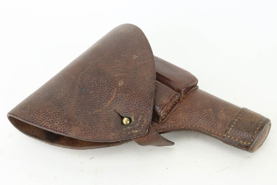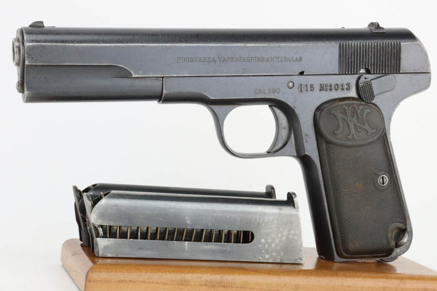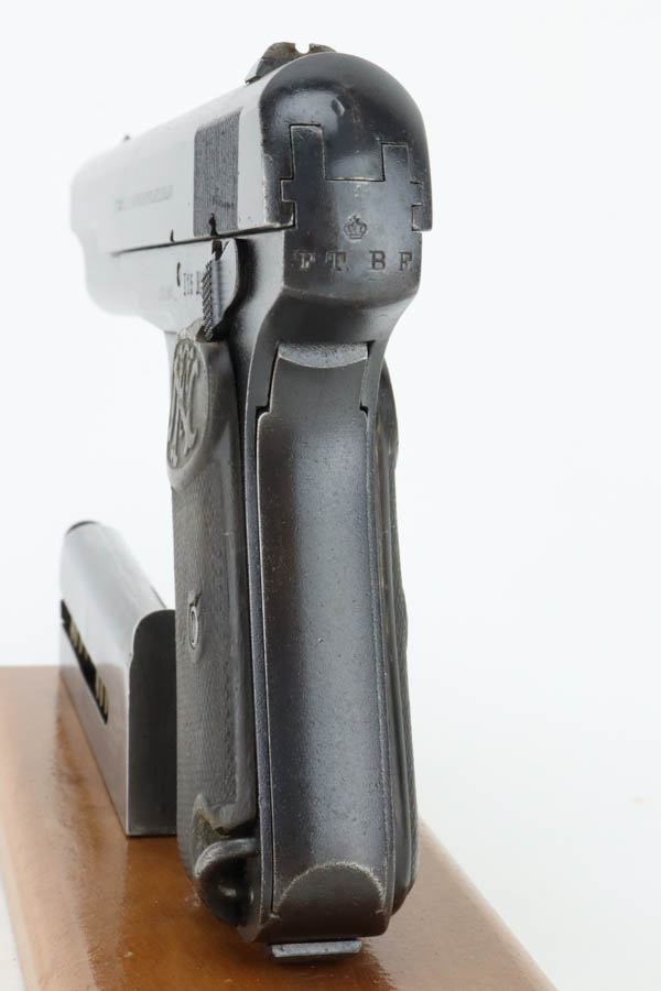 7/23/24 – This is an excellent example of a Husqvarna Model 1907 issued to the Swedish military. It has the proper Swedish military proofs at the back of the frame. Unit marking on the left side of the frame. It comes as a rig with an excellent correct leather holster and 4 magazines. The holster appears to have an “I.13.” on the top flap. The gun has retained about 97% of its dusty blue finish with just minor high edge wear. Fitted with nice original horn grips. Minty bore.