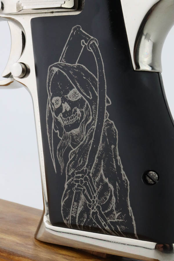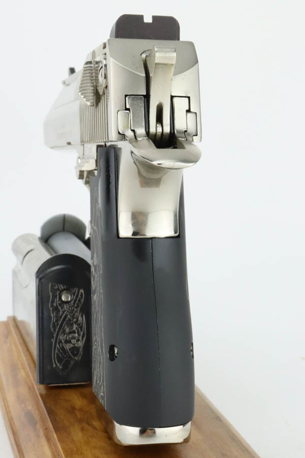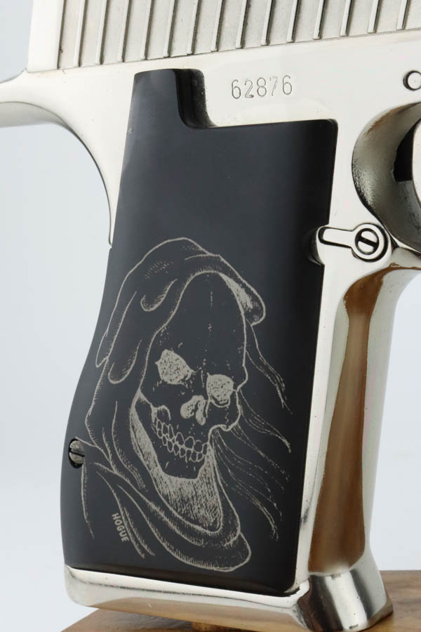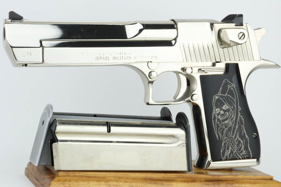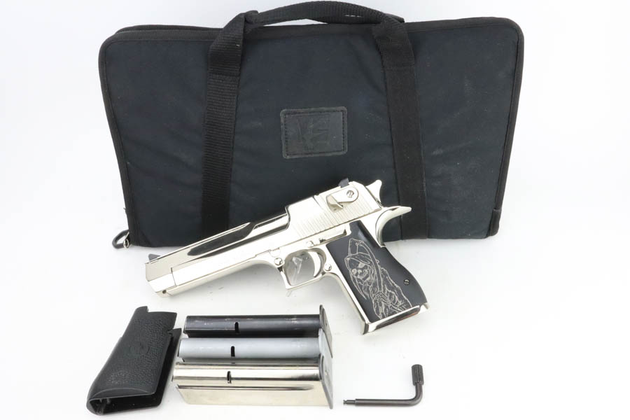 06/28/2024 – For sale is a very nice Desert Eagle made by Israeli Desert Industries. The pistol comes in a high polished Nickel finish and it is in excellent condition. There are some minor handling scratches. The bore is mirror bright. The pistol comes with 3 magazines and Grim Reaper grips made by Hogue grips.