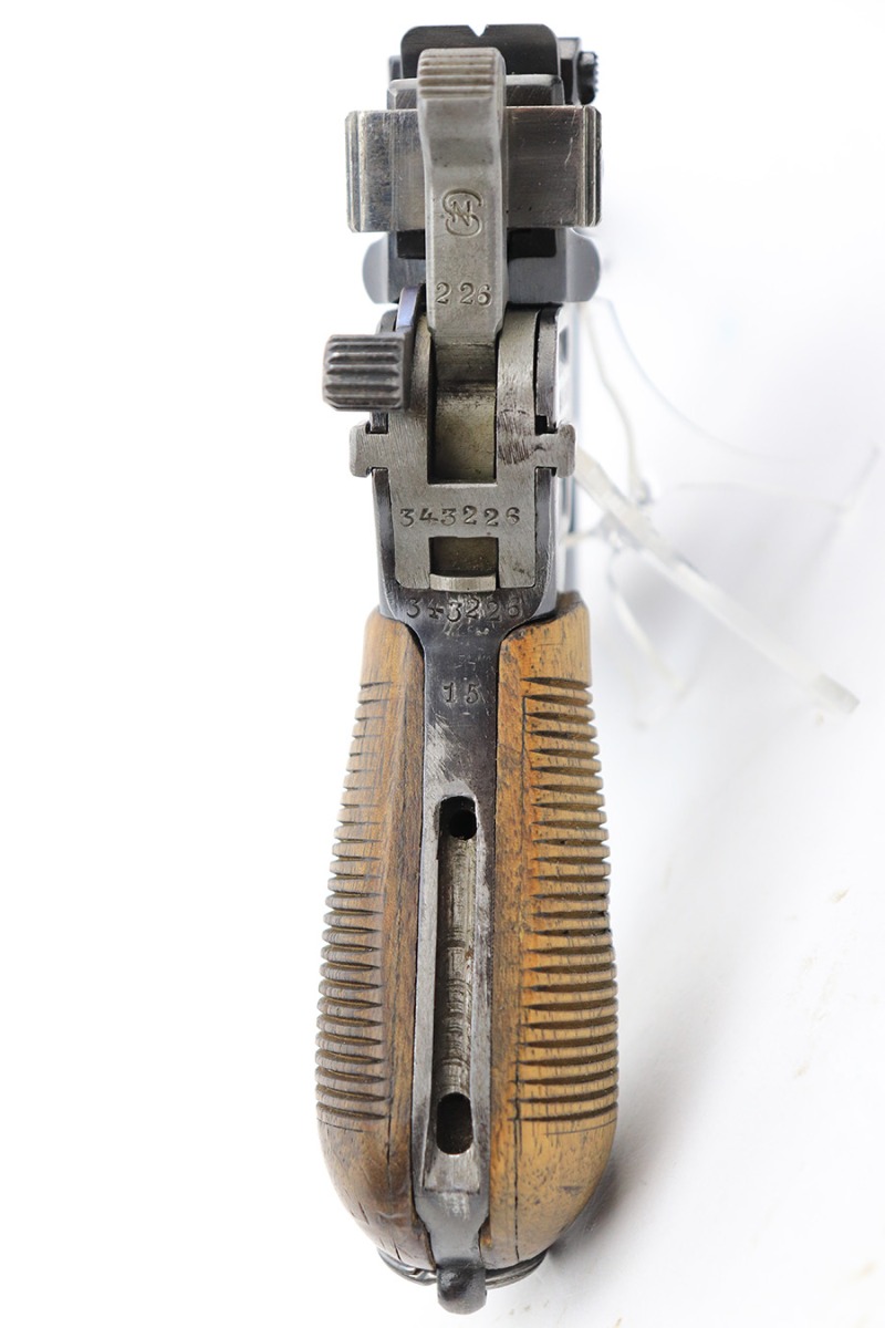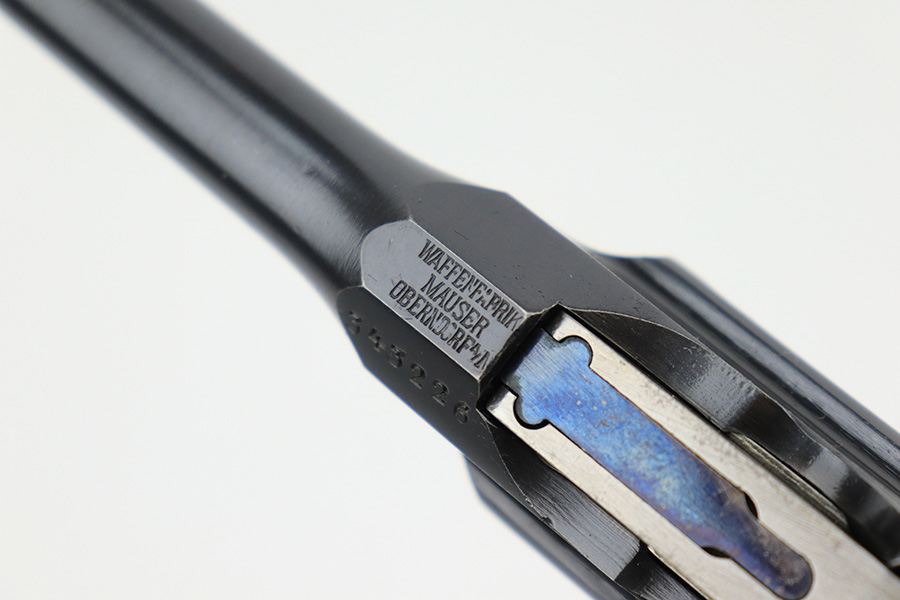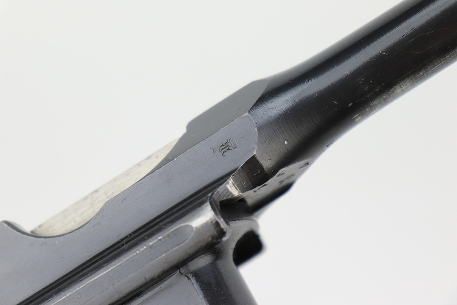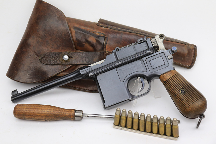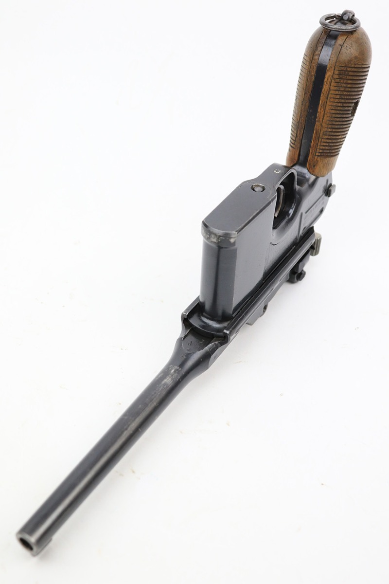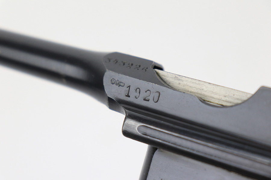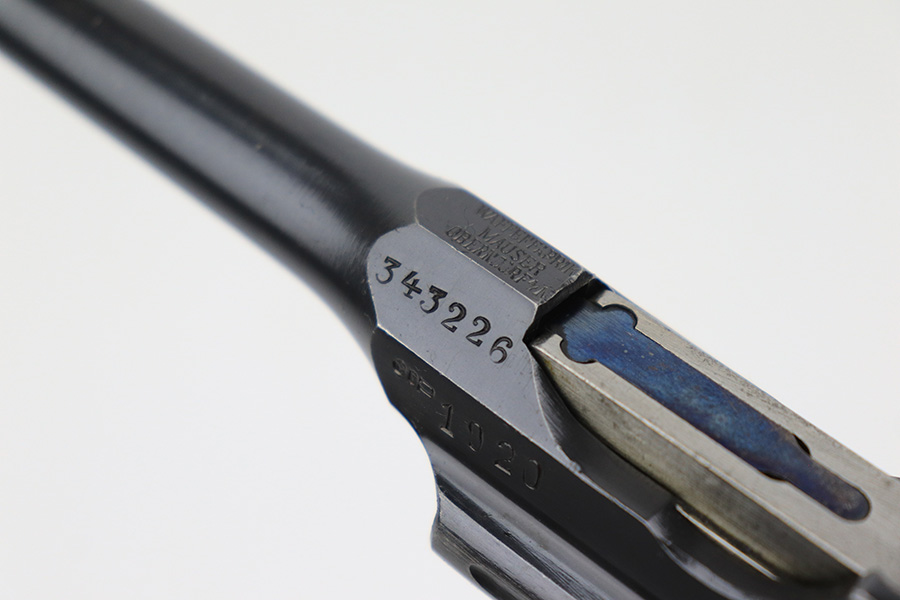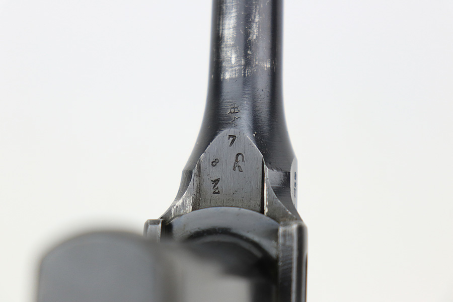 6/1/23 – This is a nice example of a Mauser C96 Broomhandle issued to the Imperial German military during WW1. Chambered in 7.63mm Mauser. It is all matching, has an Imperial proof on the right side of the slide, and has a Prussian Eagle on the underside of the trigger guard. There is a “15” under the serial number on the back of the frame, which we assume to be a unit or rack number. There is also a “1920” government property marking on the left side of the slide, indicating it remained in government service following WW1, likely issued to the police. The gun comes as a complete rig with a rare leather holster, a cleaning rod, and a stripper clip with ammo. The holster has a unit marking on the back – not matching to the gun. The gun itself has retained about 96% of its bluing. The majority of the wear is on the back strap, so the rest of the gun is really nice. Just hints of wear on some of the high edges, light streaks of wear on the underside of the barrel, some tiny handling marks here and there, and some small dots of discoloration on the front strap. Fitted with excellent matching-numbered wood grips. Mint bore.