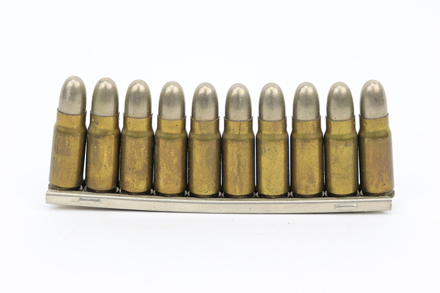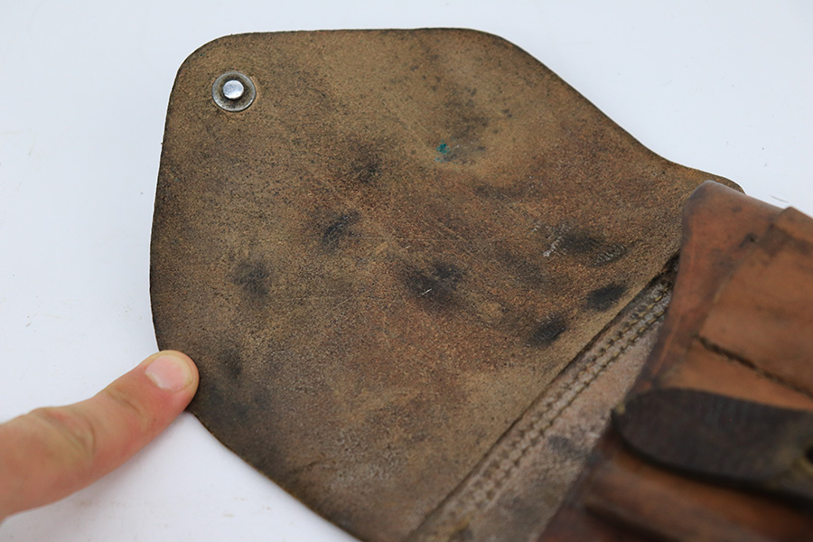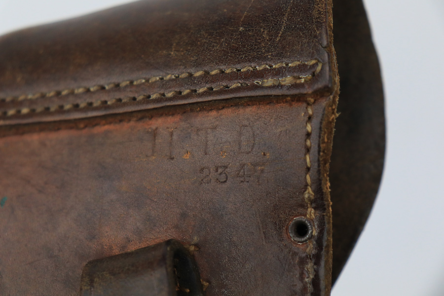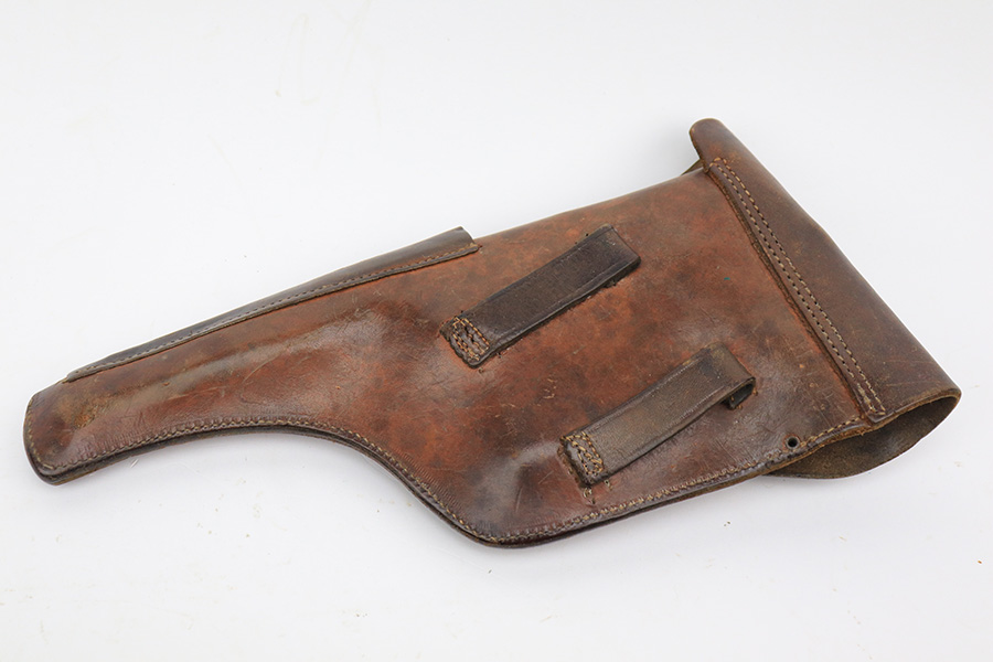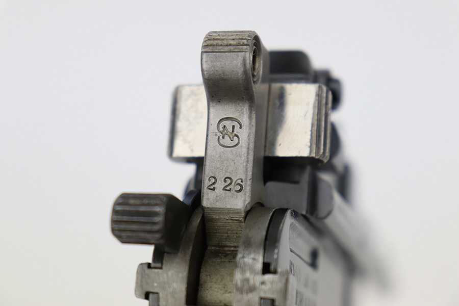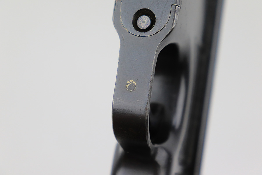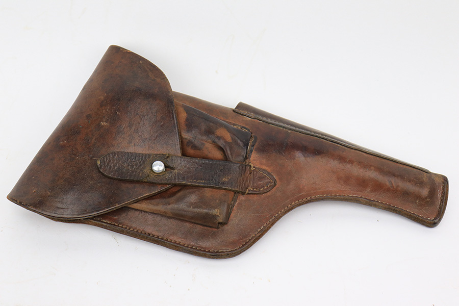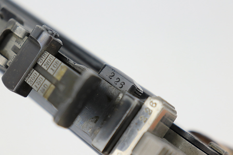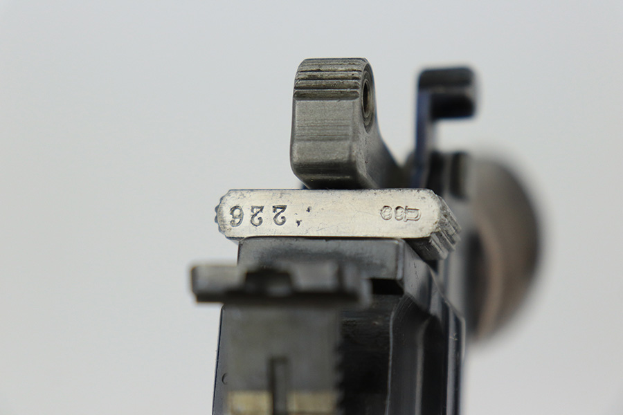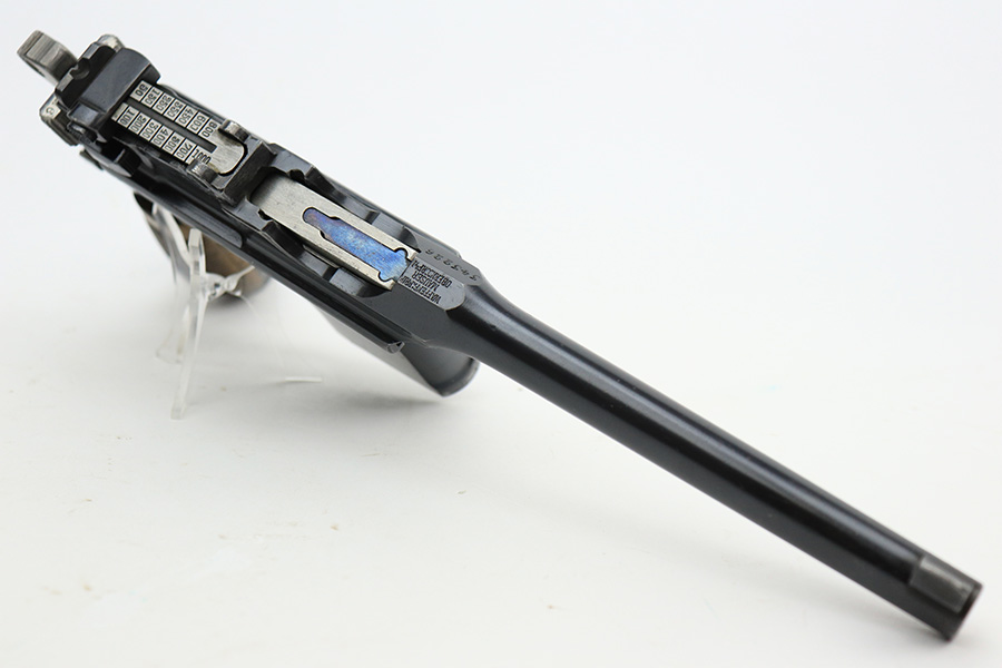6/1/23 – This is a nice example of a Mauser C96 Broomhandle issued to the Imperial German military during WW1. Chambered in 7.63mm Mauser. It is all matching, has an Imperial proof on the right side of the slide, and has a Prussian Eagle on the underside of the trigger guard. There is a “15” under the serial number on the back of the frame, which we assume to be a unit or rack number. There is also a “1920” government property marking on the left side of the slide, indicating it remained in government service following WW1, likely issued to the police. The gun comes as a complete rig with a rare leather holster, a cleaning rod, and a stripper clip with ammo. The holster has a unit marking on the back – not matching to the gun. The gun itself has retained about 96% of its bluing. The majority of the wear is on the back strap, so the rest of the gun is really nice. Just hints of wear on some of the high edges, light streaks of wear on the underside of the barrel, some tiny handling marks here and there, and some small dots of discoloration on the front strap. Fitted with excellent matching-numbered wood grips. Mint bore.