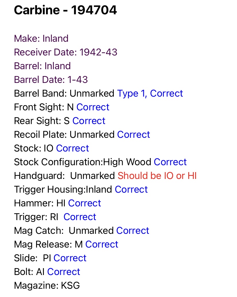 8/6/21 – This is a very nice example of an early Inland M1 Carbine with six digit serial. A full parts list is included in the photos for the listing. It’s all correct and original except for the handguard, which is unmarked and was likely replaced at some point. Excellent original finish on the metal parts with minor patina, and a little bit of wear on the barrel. Nice, early stock with flaming bomb in sling well and crossed cannon cartouche on right side. Terrific, shiny bore.
