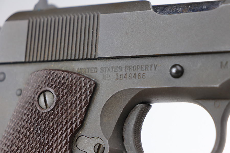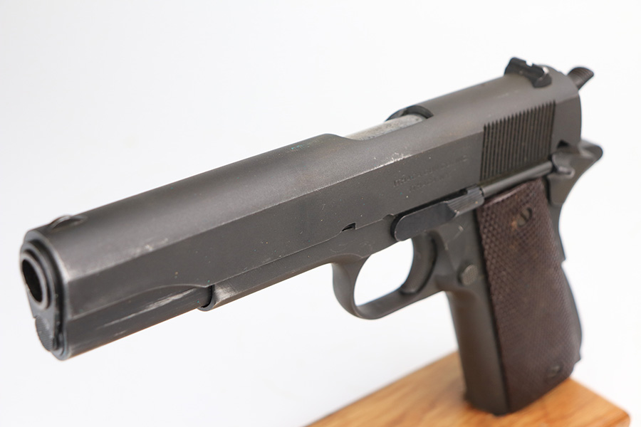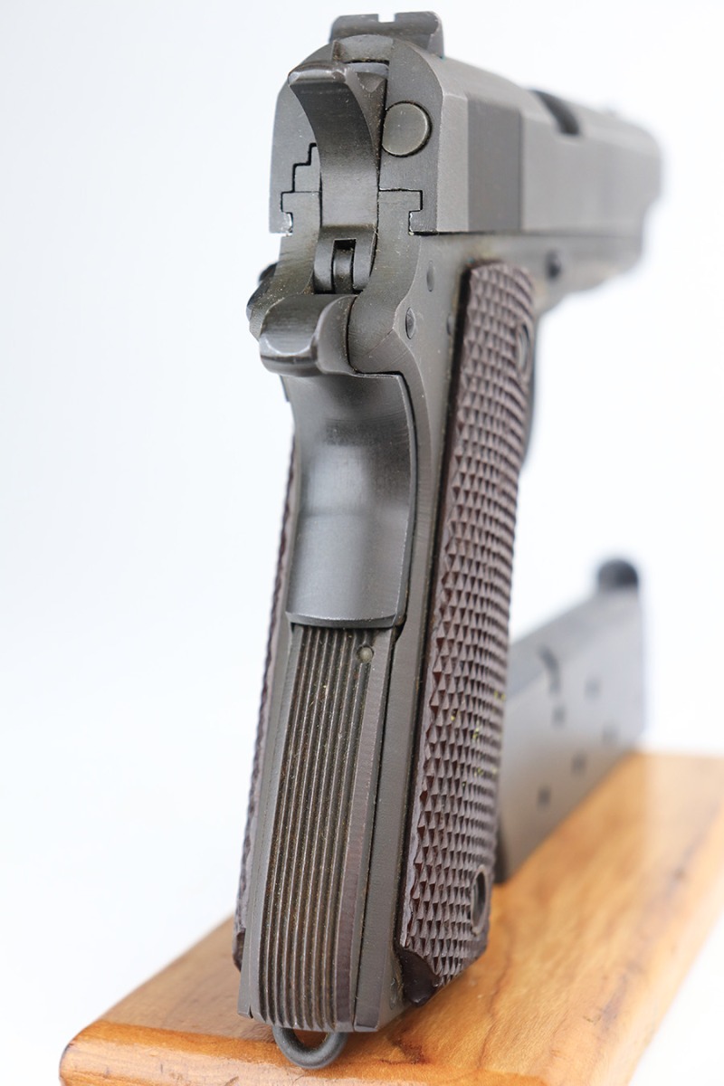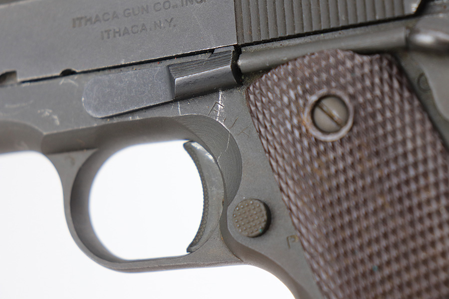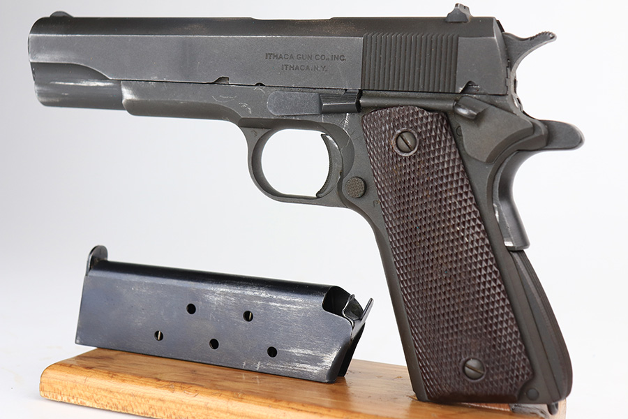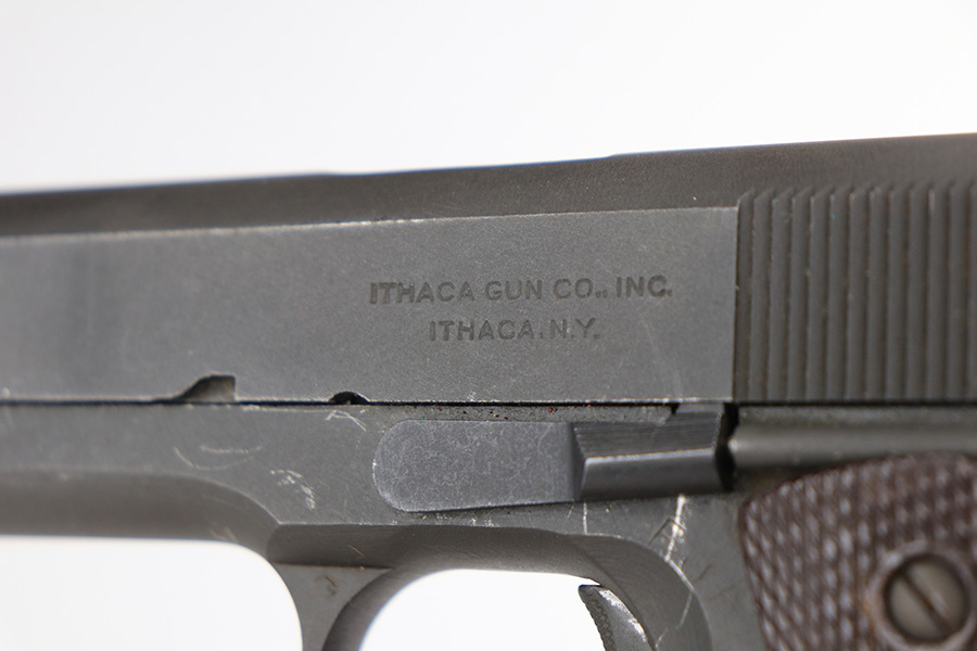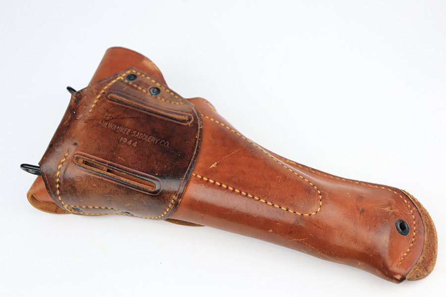2/21/22 – This is a minty Ithaca 1911A1 that was sent to Benicia Ordnance Depot in July of 1944. This info can be found via factory records in Meadows’ book on U.S. Military Automatic Pistols. It’s all original and correct with just a little high edge wear on the left side of the slide and frame. Nice grips but some wear on the bottom of each panel. ‘L’ marked magazine. Correct HS barrel with excellent bore. Rig is completed by an excellent 1944 holster that was made by Milwaukee Saddlery Co.