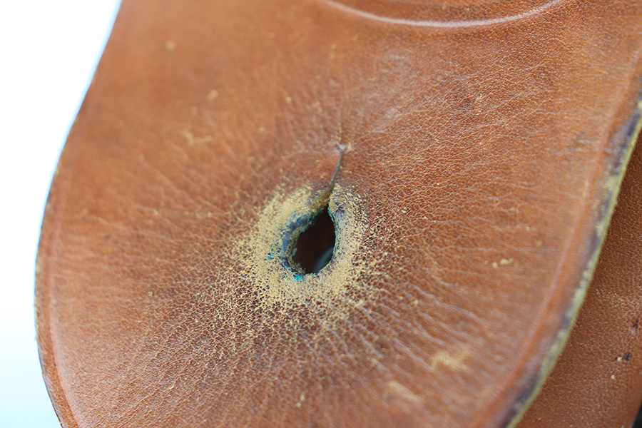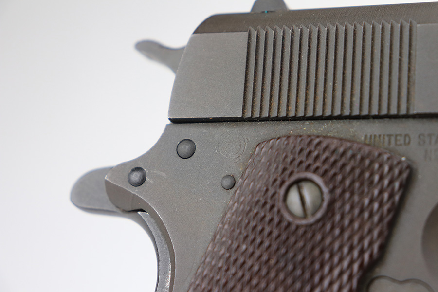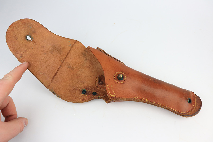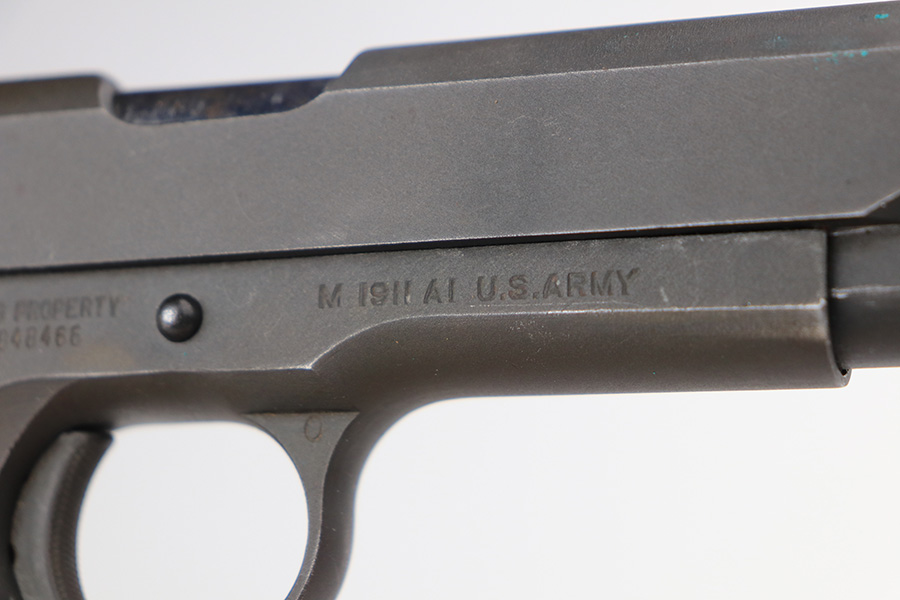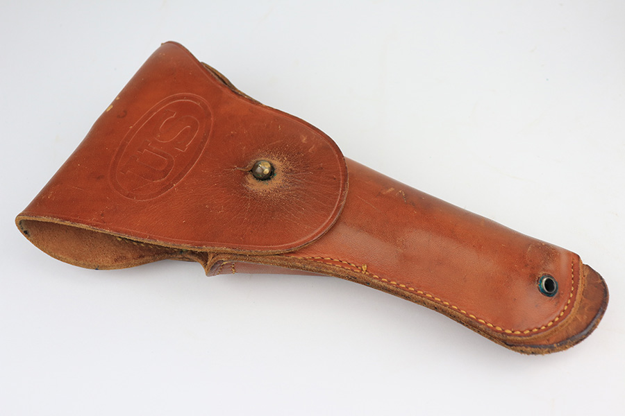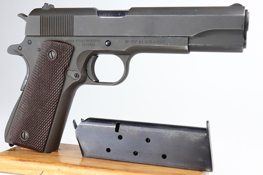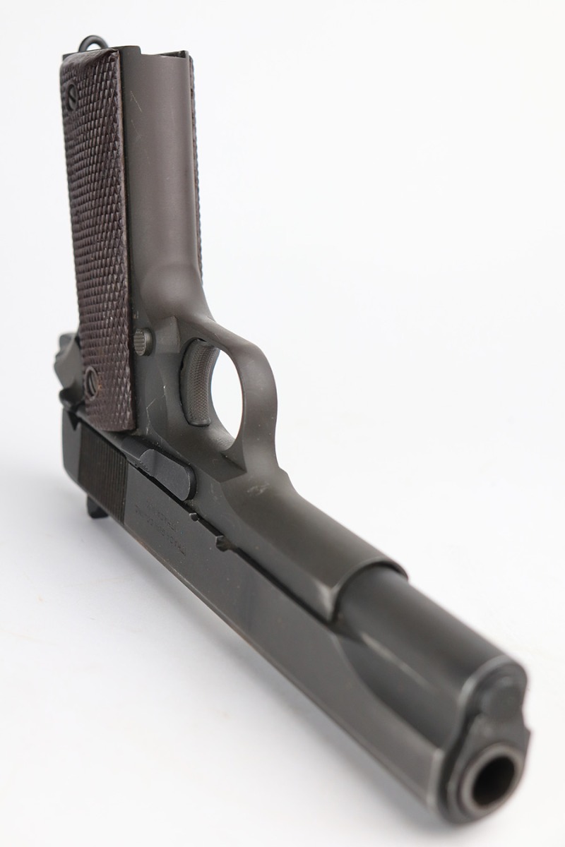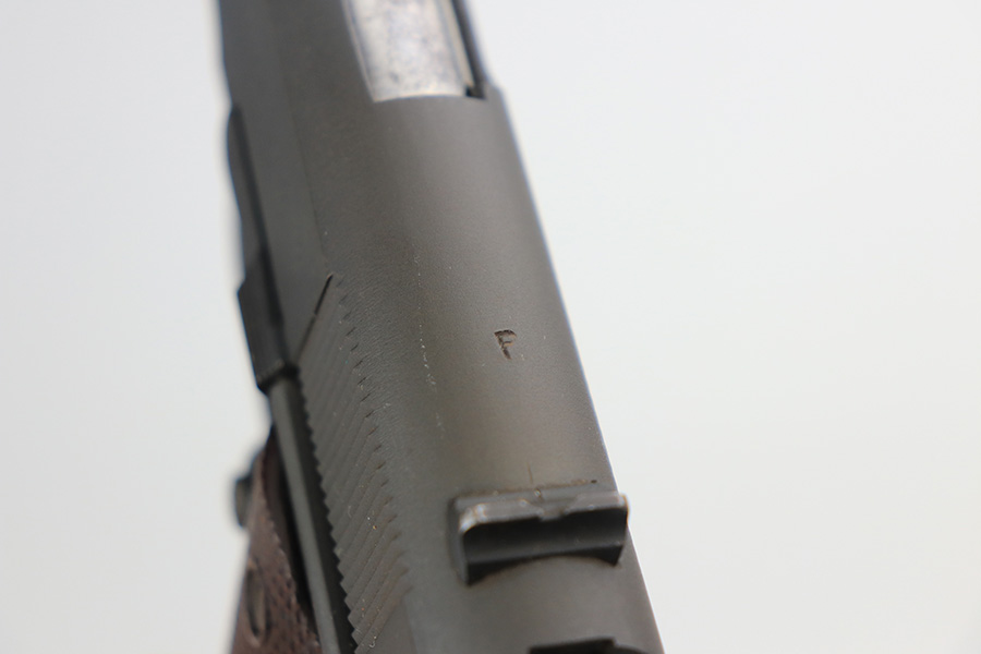 2/21/22 – This is a minty Ithaca 1911A1 that was sent to Benicia Ordnance Depot in July of 1944. This info can be found via factory records in Meadows’ book on U.S. Military Automatic Pistols. It’s all original and correct with just a little high edge wear on the left side of the slide and frame. Nice grips but some wear on the bottom of each panel. ‘L’ marked magazine. Correct HS barrel with excellent bore. Rig is completed by an excellent 1944 holster that was made by Milwaukee Saddlery Co.