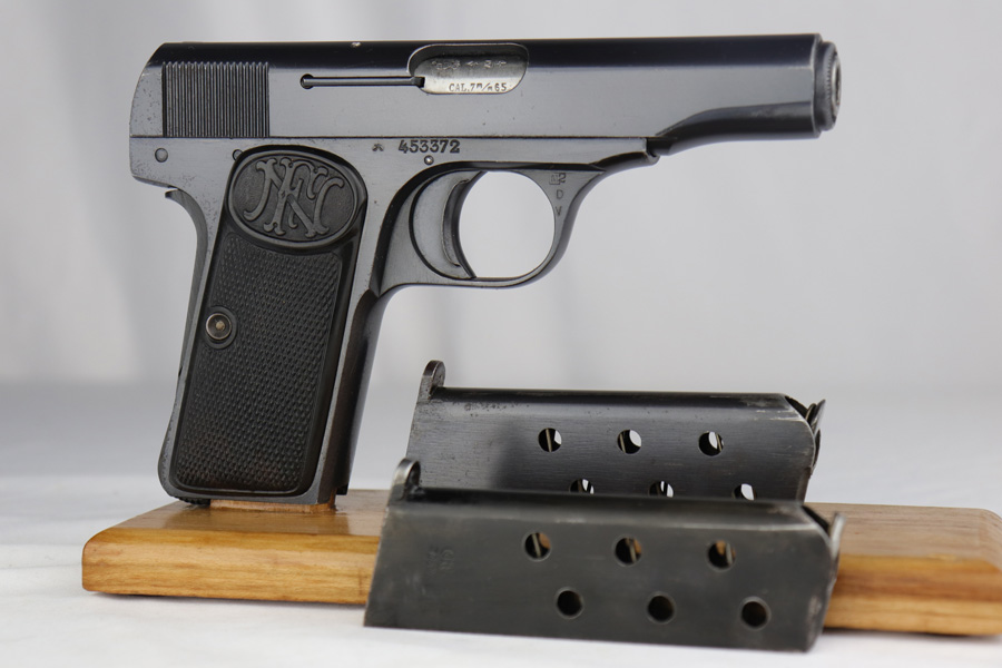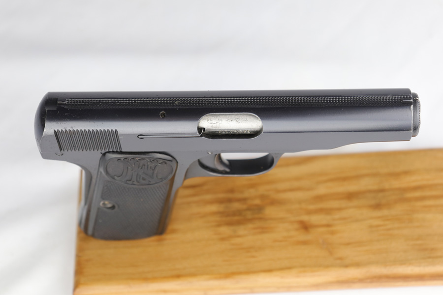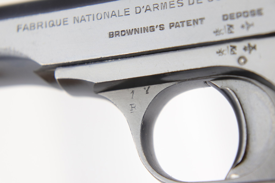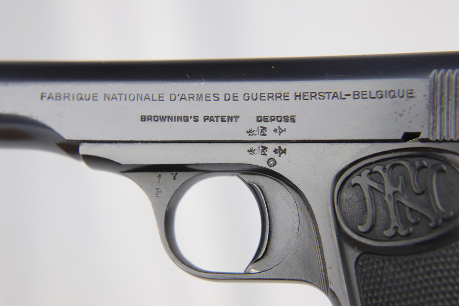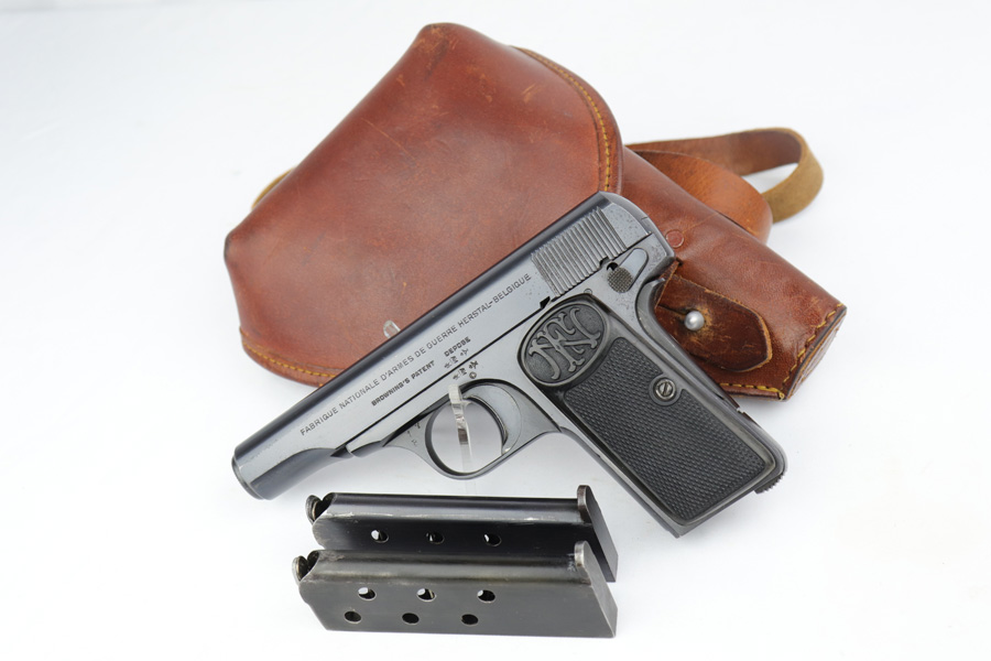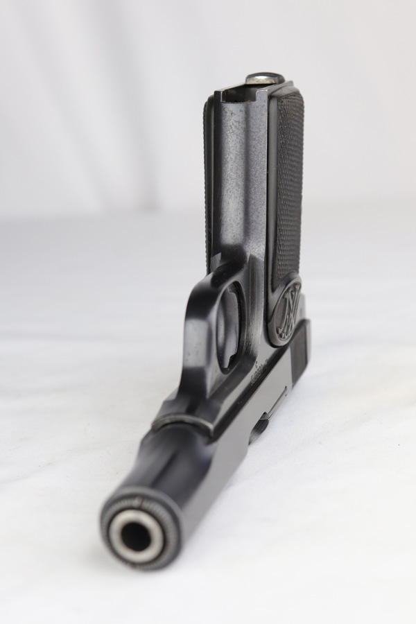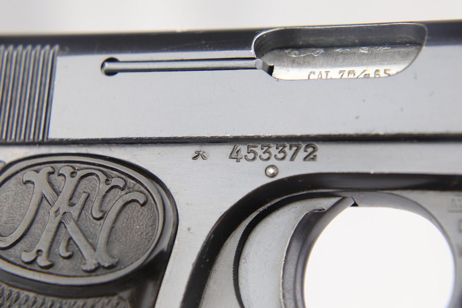 2/26/19 – This is a great example of a scarce Japanese contract FN1910 pistol that was a late 1930s production. It is in very good original condition and retains nearly 99% of its original blue with just a hint of high edge wear and mild spotting/oxidation on the front and rear grip straps. There is absolutely no pitting or rust present anywhere. It is an all matching gun and has excellent bore and grips. It comes with an original Japanese made holster in mint condition, with an original shoulder strap – probably the best one we’ve had in years – with some Japanese kanji stamped under the lid. There is a spare magazine as well. A very desirable, high condition example of a private purchase Japanese handgun – all of these were carried by high ranking officers who had to buy their own sidearms.