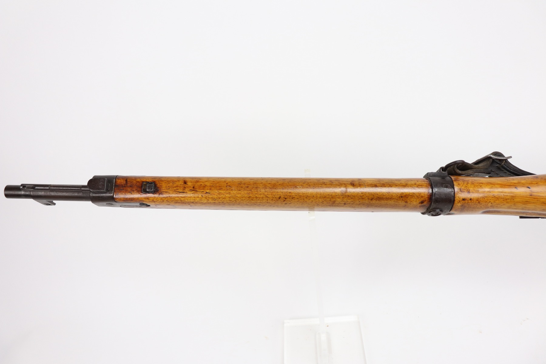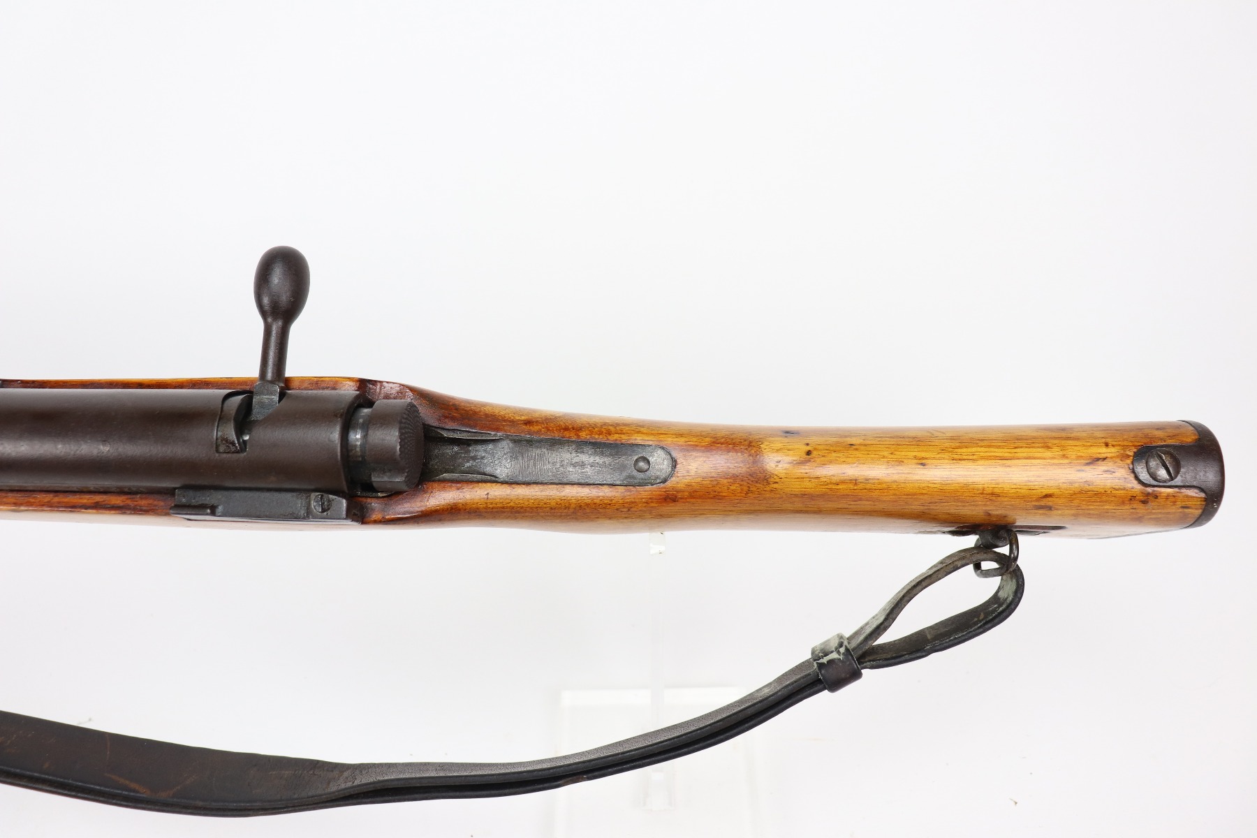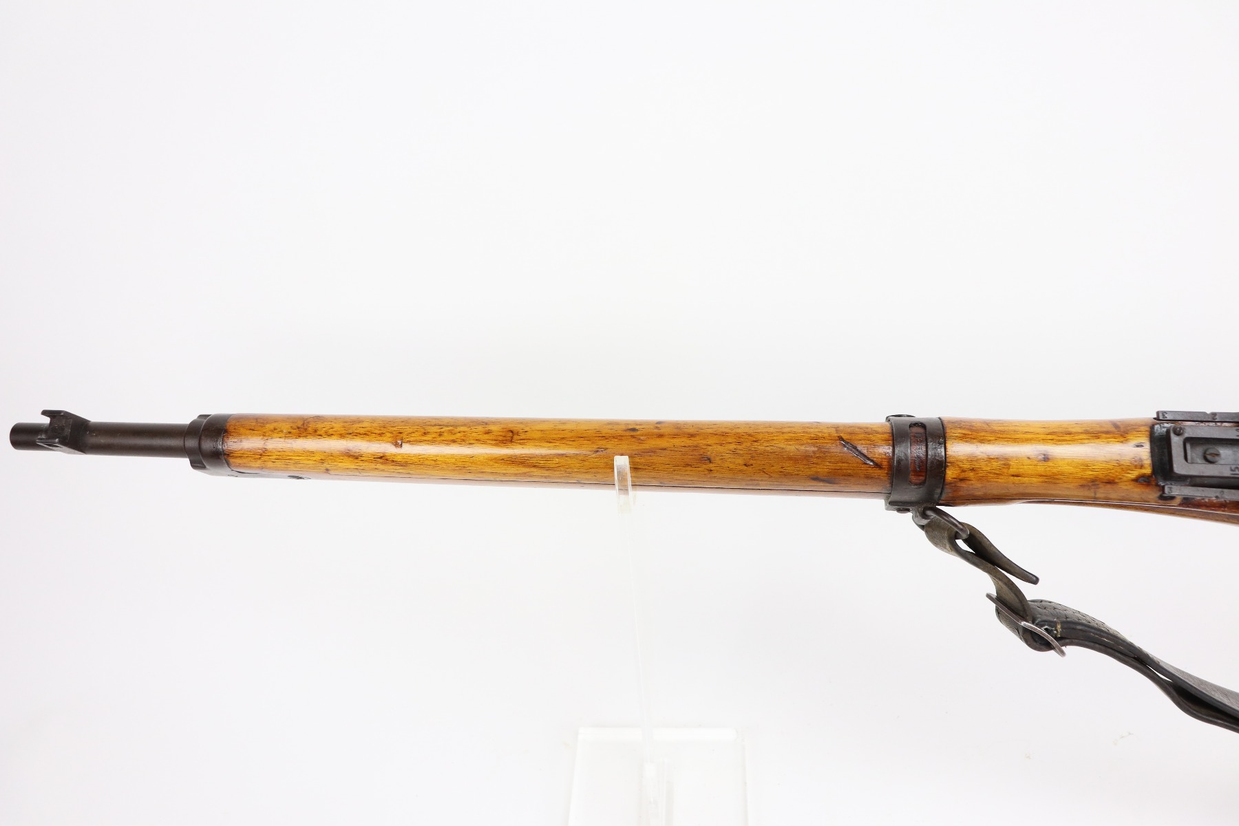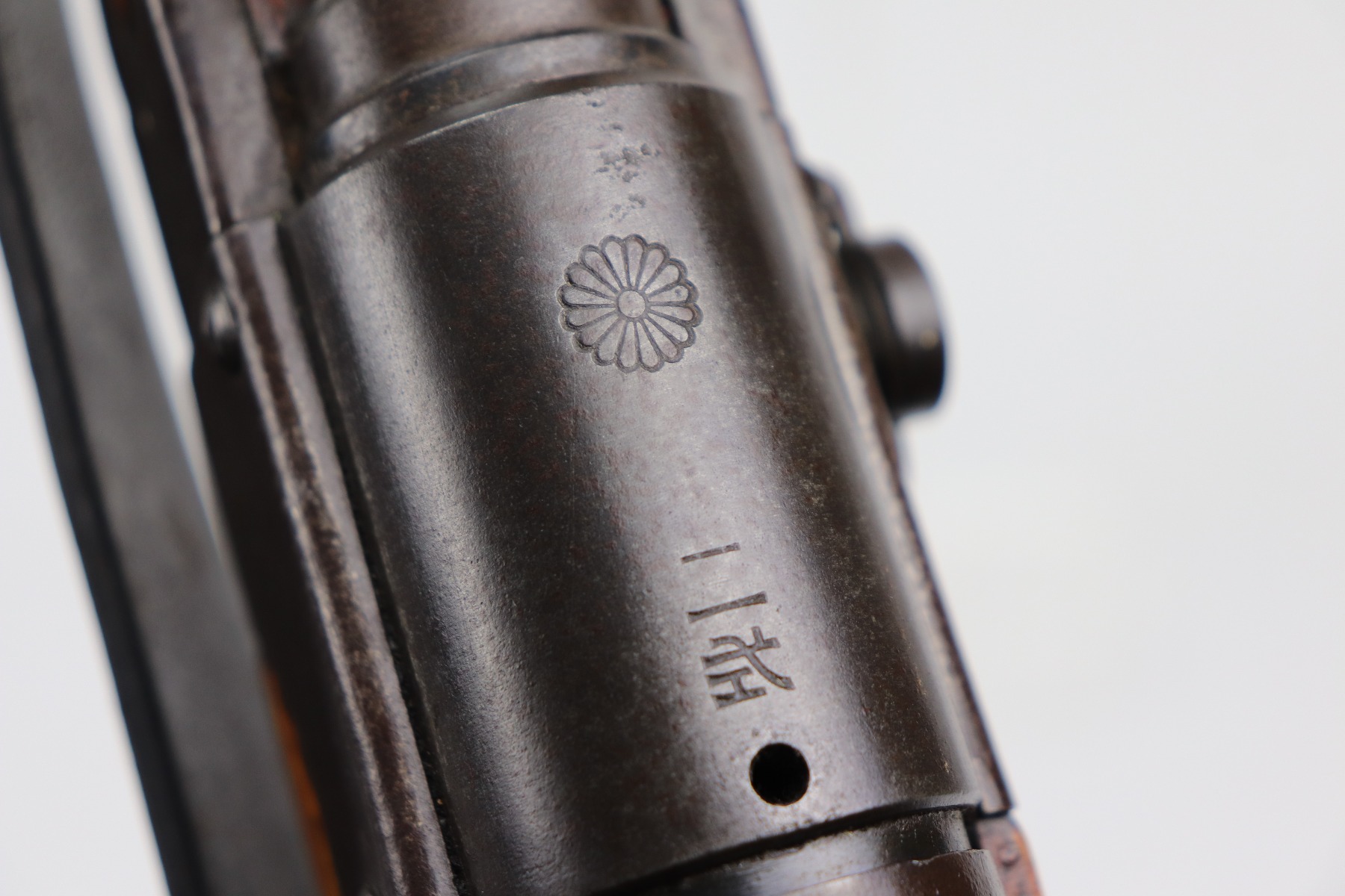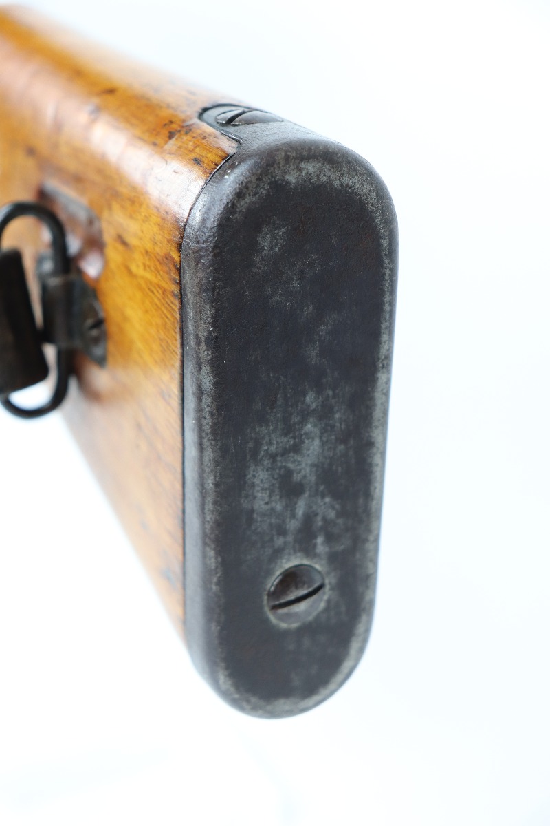 3/26/21 – This is an excellent example of a Type 2 Arisaka Paratrooper Rifle issued to the Japanese paratroopers during WW2. This one was made in the Nagoya Arsenal. It is all correct and has a fully intact mum stamp. It is all matching. However, the parts around the center connection are numbered “431” and “432”. We think this is just a factory error and that the parts are indeed original to this gun. It comes with an original cleaning rod and leather sling. The gun is in excellent condition. There is not much actual finish loss on this gun at all, but there is spotty oxidation and patina throughout. There is a small area of minor pitting near the mum. The stock is excellent, but a thin layer of lacquer was applied. The bore is mint.