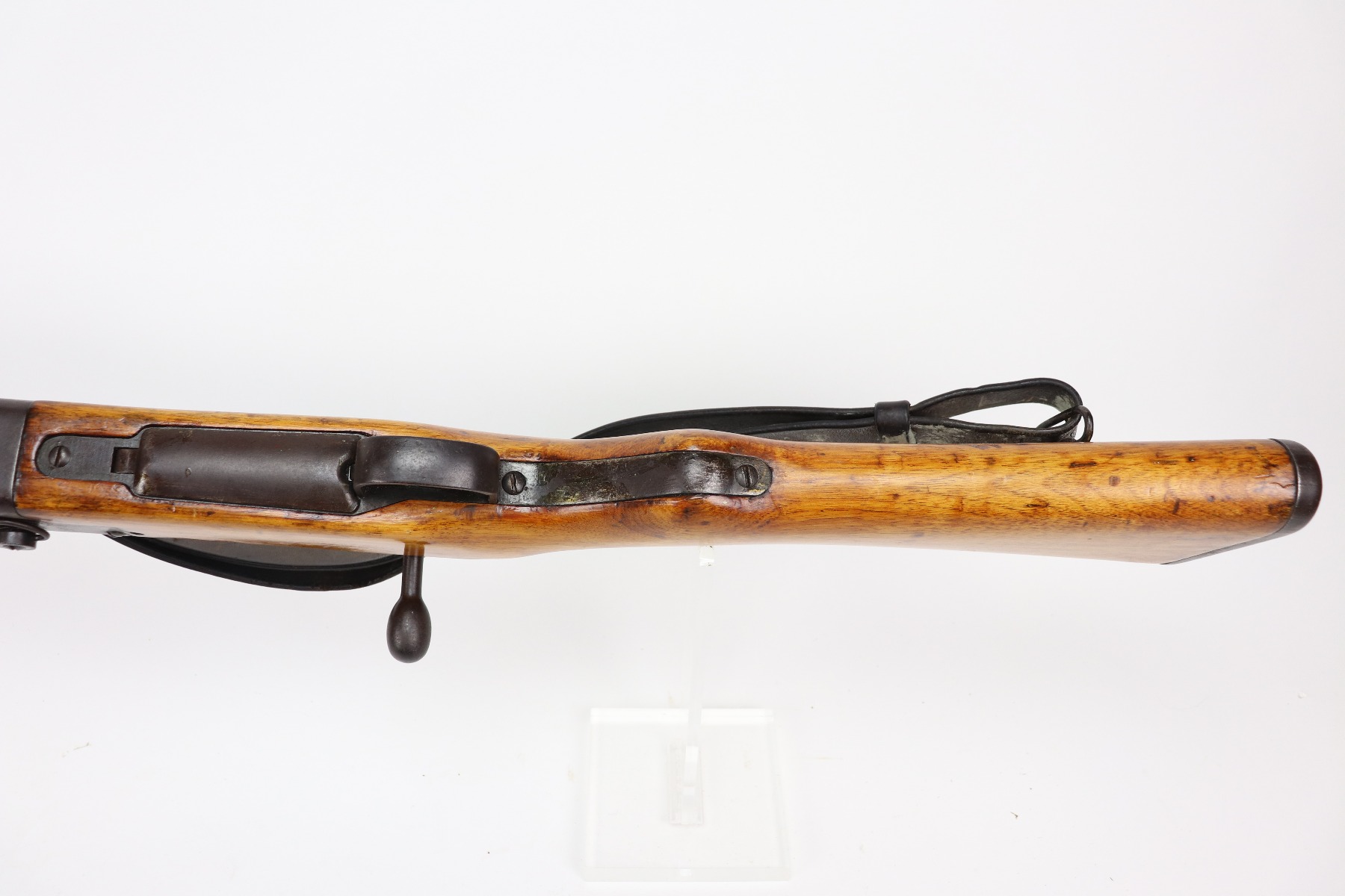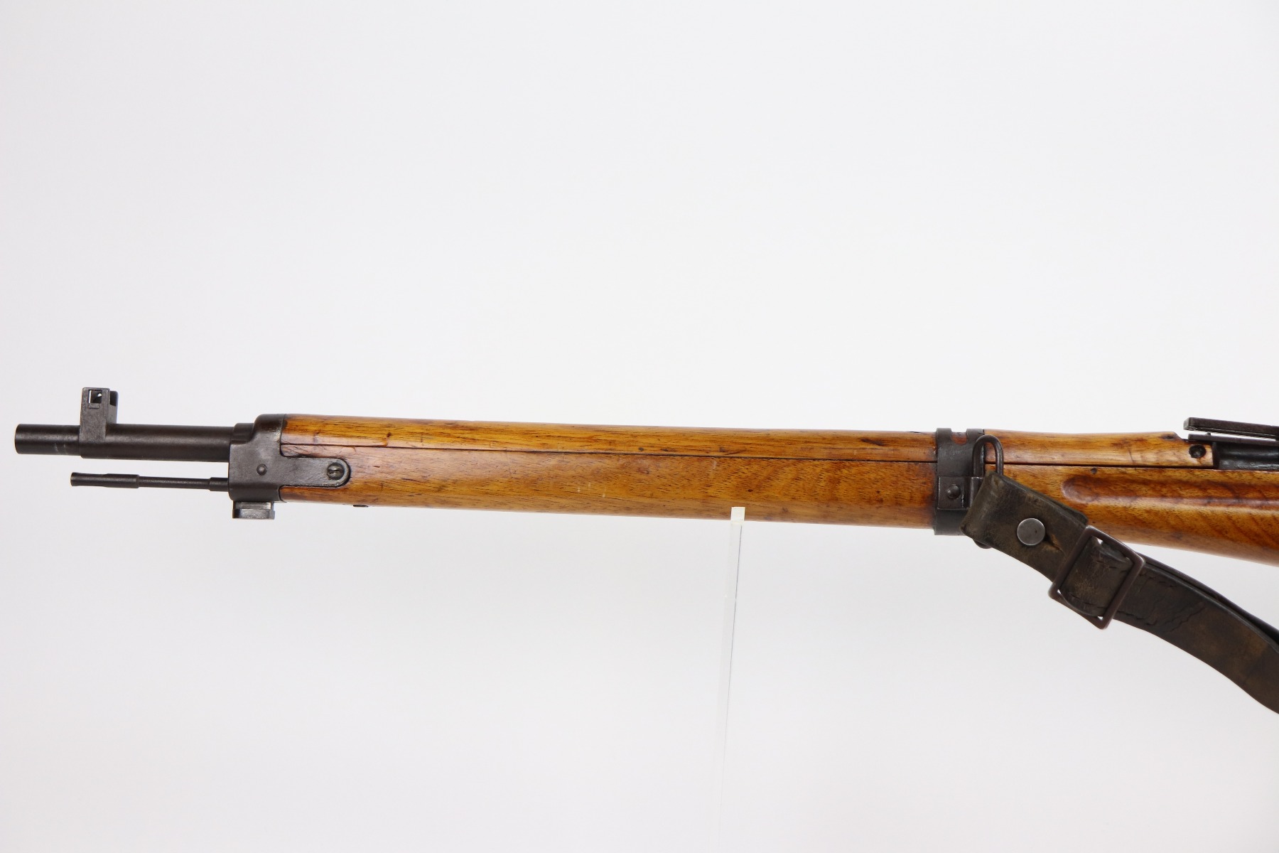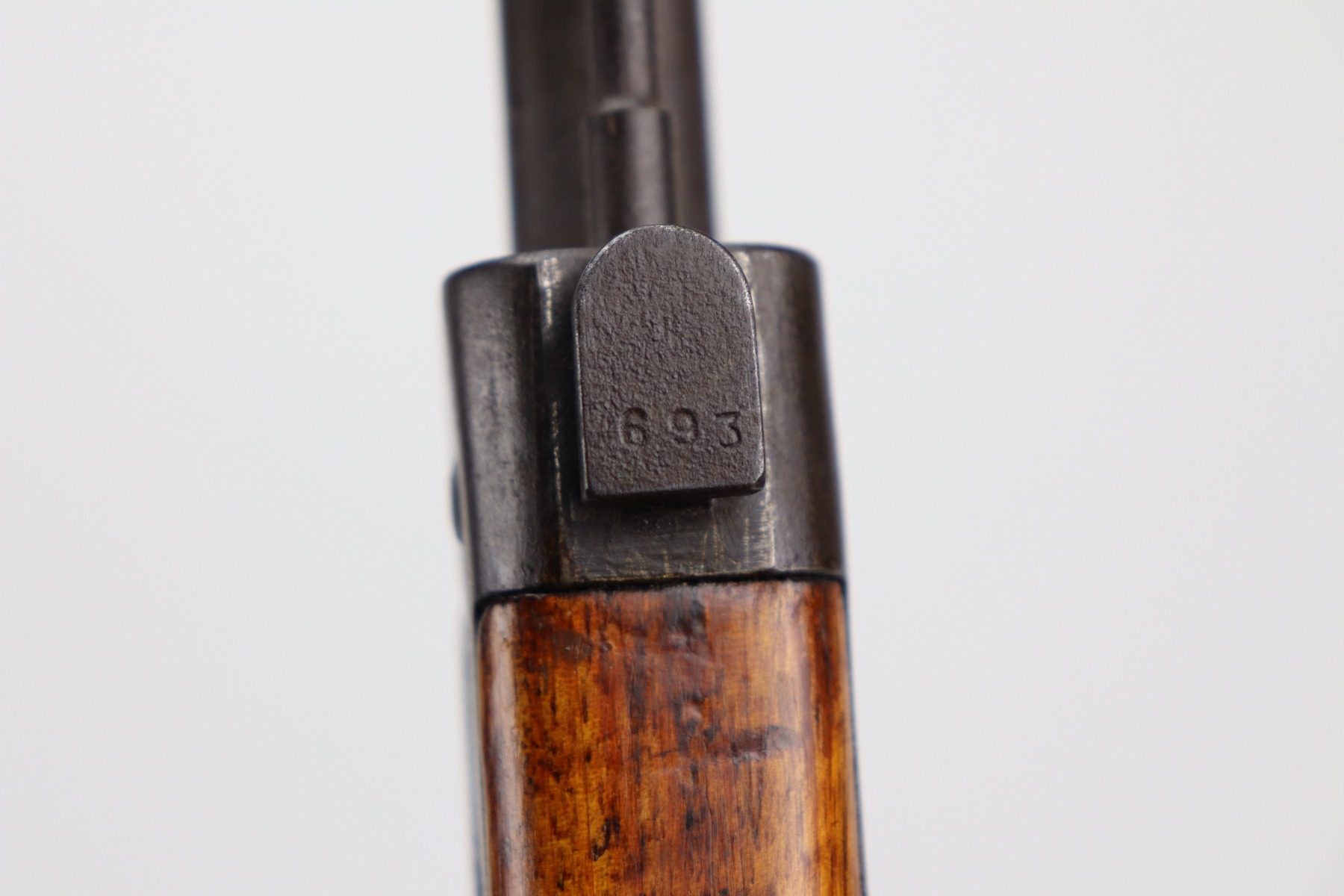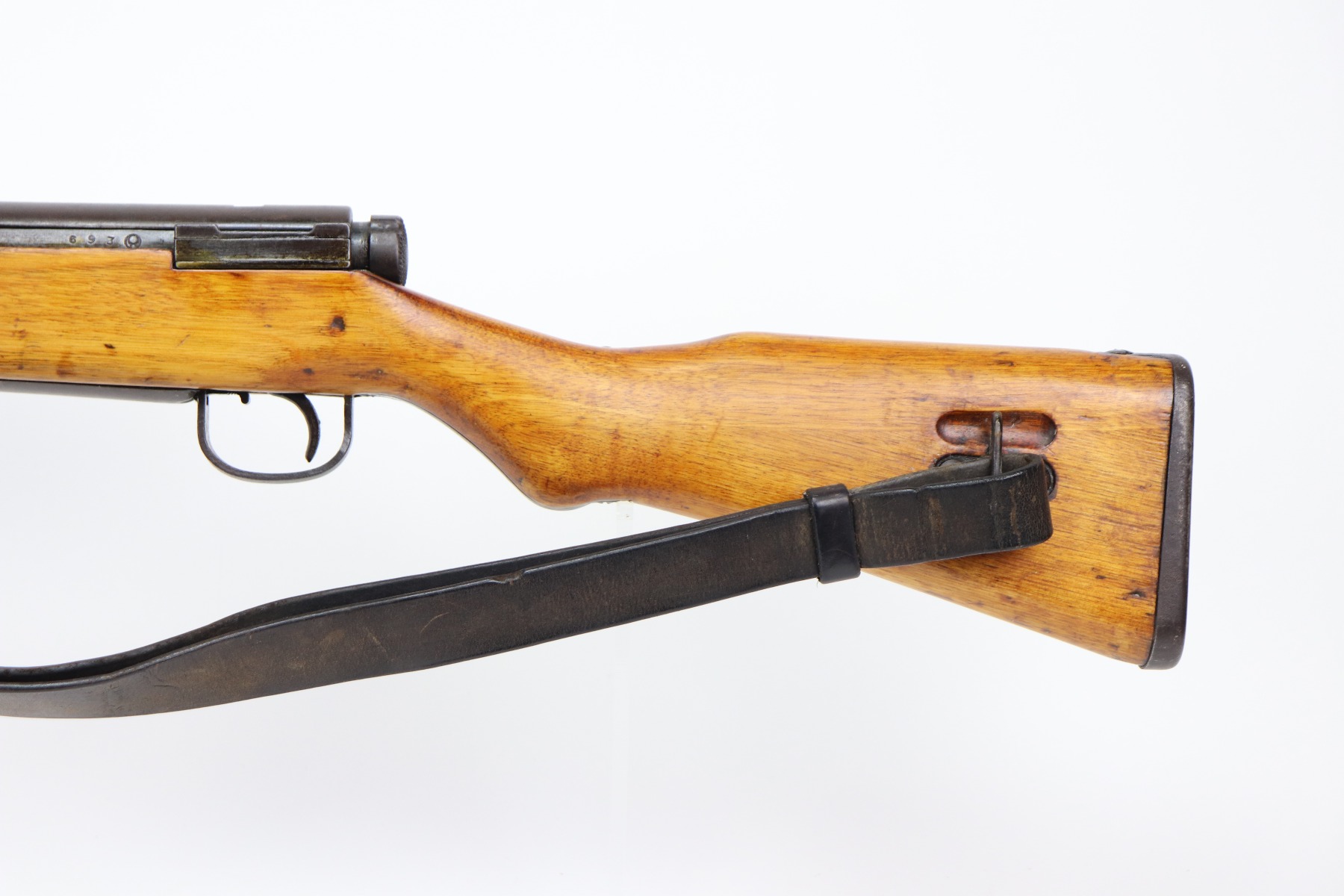 3/26/21 – This is an excellent example of a Type 2 Arisaka Paratrooper Rifle issued to the Japanese paratroopers during WW2. This one was made in the Nagoya Arsenal. It is all correct and has a fully intact mum stamp. It is all matching. However, the parts around the center connection are numbered “431” and “432”. We think this is just a factory error and that the parts are indeed original to this gun. It comes with an original cleaning rod and leather sling. The gun is in excellent condition. There is not much actual finish loss on this gun at all, but there is spotty oxidation and patina throughout. There is a small area of minor pitting near the mum. The stock is excellent, but a thin layer of lacquer was applied. The bore is mint.