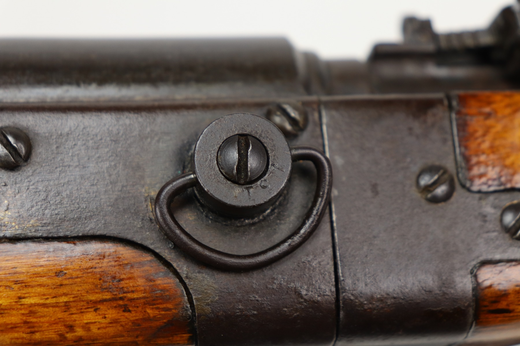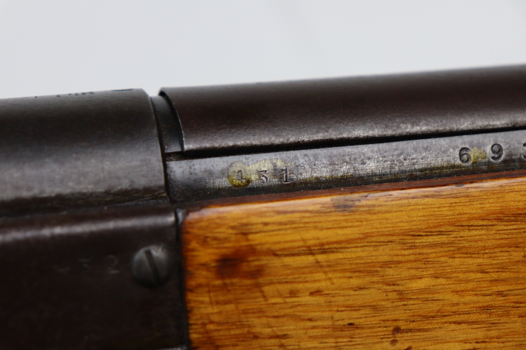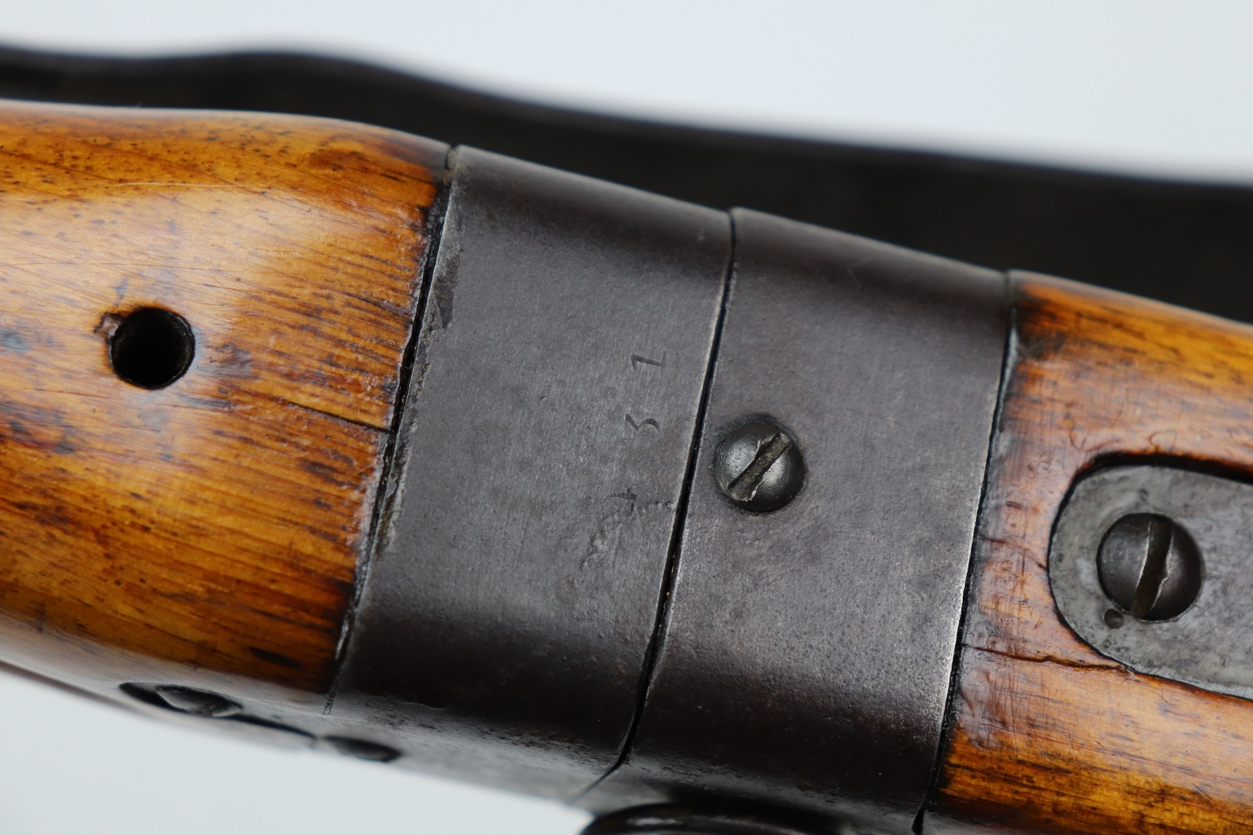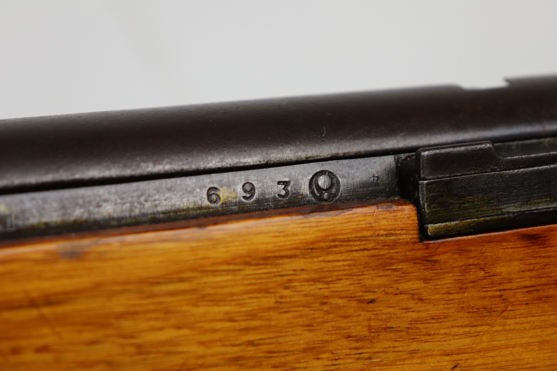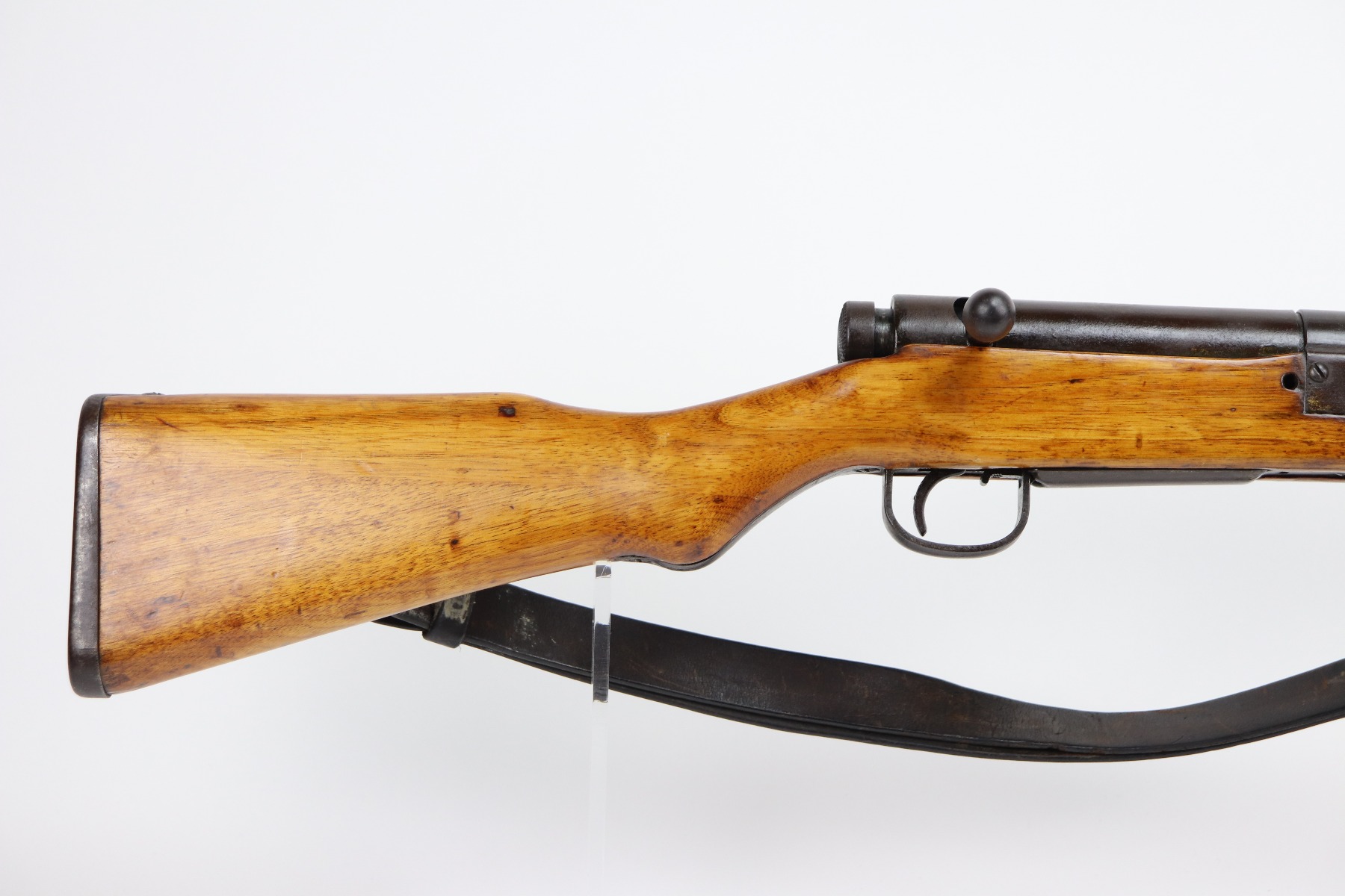 3/26/21 – This is an excellent example of a Type 2 Arisaka Paratrooper Rifle issued to the Japanese paratroopers during WW2. This one was made in the Nagoya Arsenal. It is all correct and has a fully intact mum stamp. It is all matching. However, the parts around the center connection are numbered “431” and “432”. We think this is just a factory error and that the parts are indeed original to this gun. It comes with an original cleaning rod and leather sling. The gun is in excellent condition. There is not much actual finish loss on this gun at all, but there is spotty oxidation and patina throughout. There is a small area of minor pitting near the mum. The stock is excellent, but a thin layer of lacquer was applied. The bore is mint.