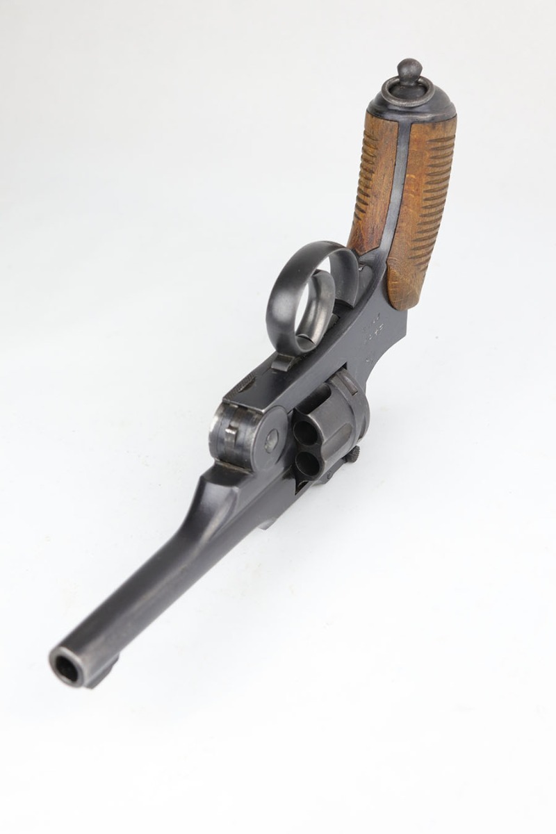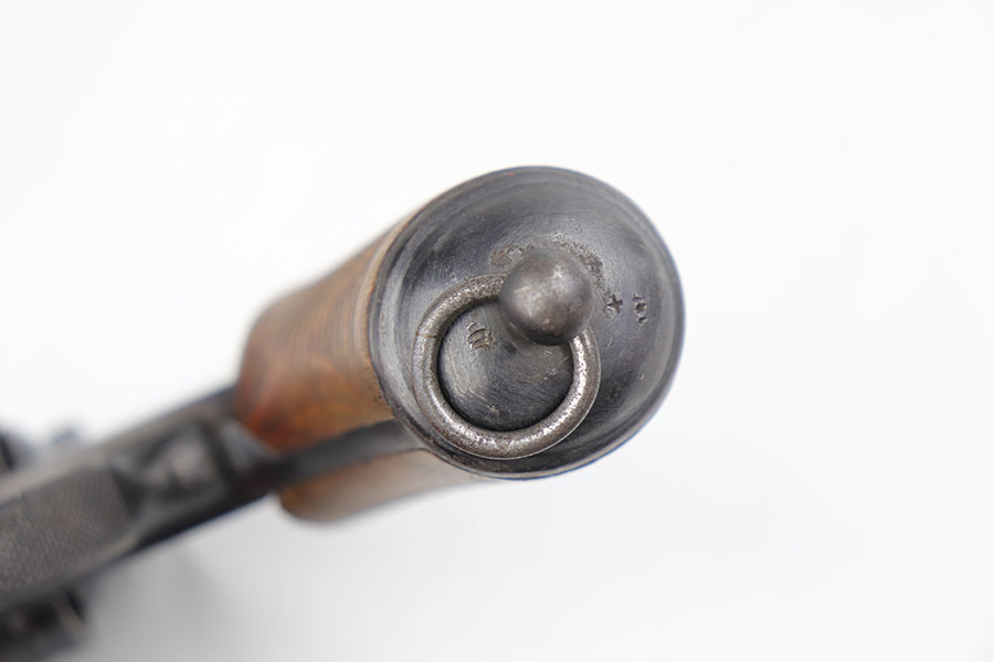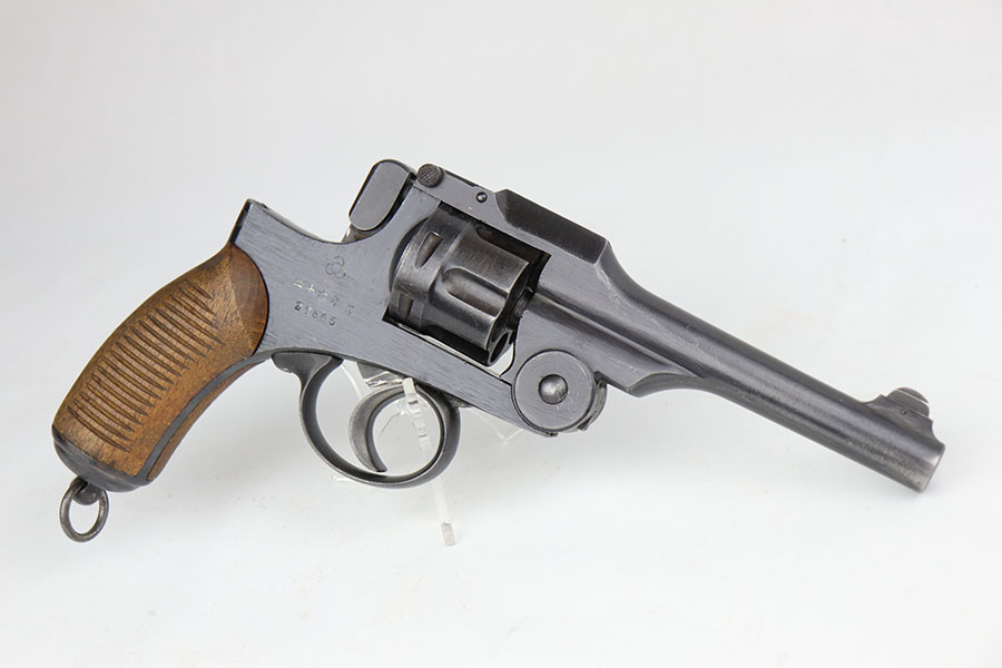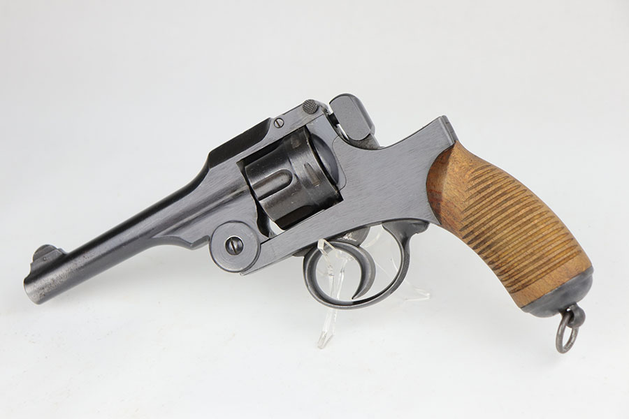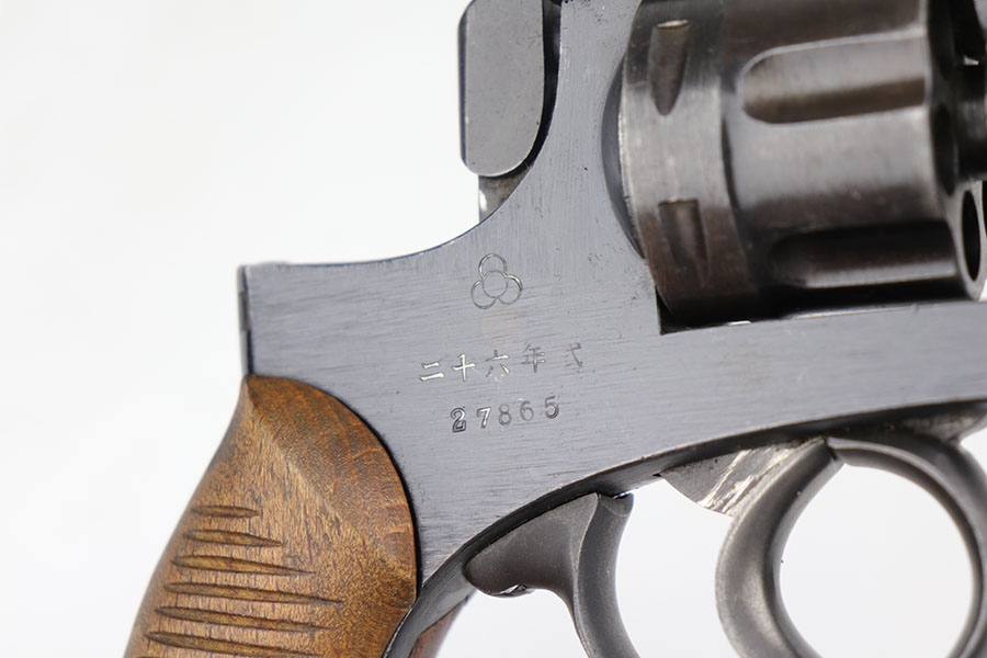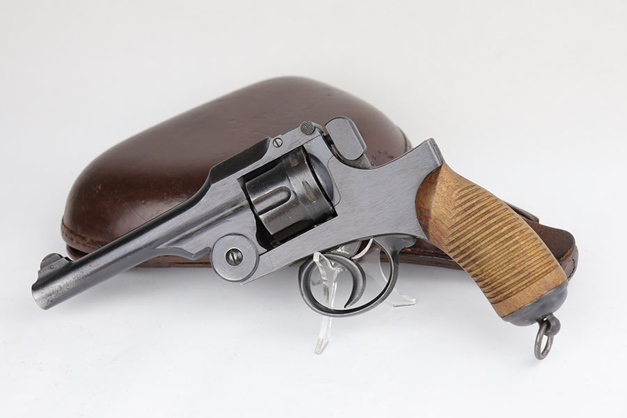5/28/20 – This is a very nice example of a Nambu Type 26 revolver with an original holster in excellent condition. The Type 26 or Model 26 “hammerless” revolver was the first modern revolver adopted by the Imperial Japanese Army. It was developed at the Koishikawa Arsenal and is named for its year of adoption in the Japanese dating system (the 26th year of the reign of the Meiji emperor, i.e., 1893). The revolver saw action in conflicts including the Russo-Japanese War, World War I and World War II. This particular revolver has about 95% bluing with all the wear on either side of the barrel. The bore is mint, and grips are excellent. Holster leather is in fantastic shape with just a few scuffs here or there. Some Kanji proofs are inside the top flap.