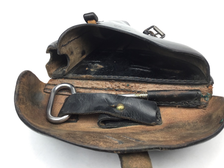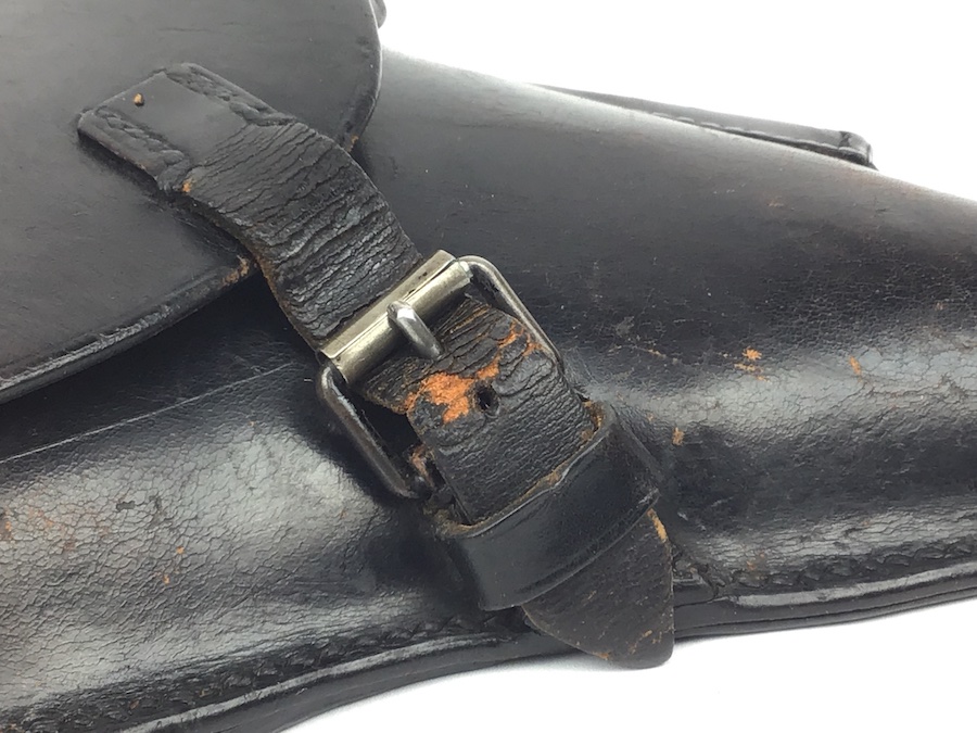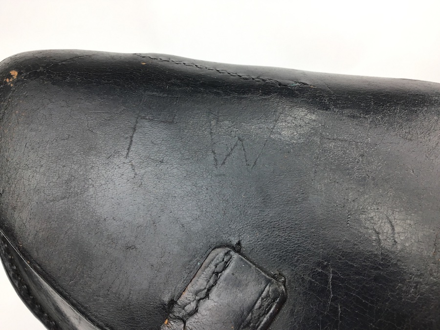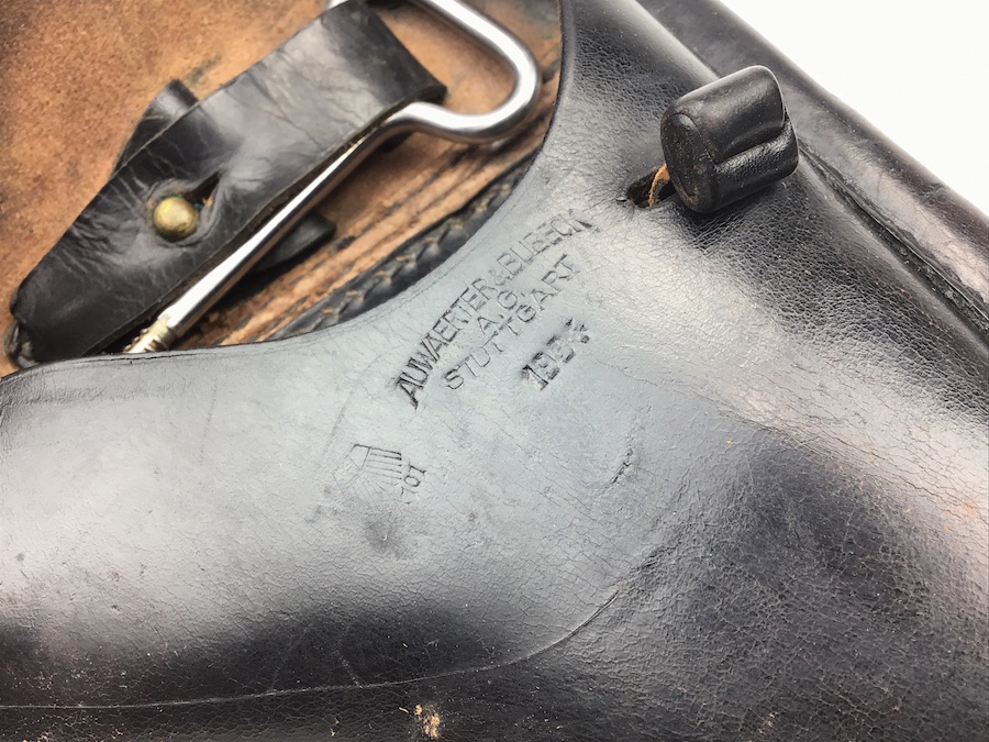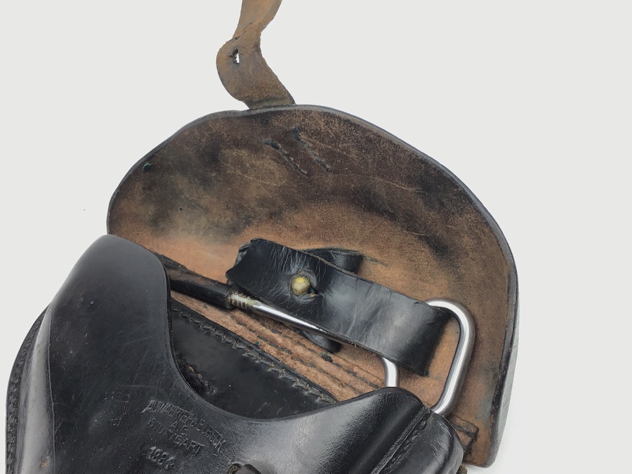10/27/20 – Excellent and original 1934 k date Luger holster and original cleaning rod. The black leather is firm and in excellent condition. Some wear cracking on the closure strap but it is secure. Maker stamped “Auwaerter & Bubeck” with a 1934 date and an early droop wing waffen stamp. All stitching is intact and tight. Clean interior and secure lift strap. The letters “PWR” are very faintly etched into the closure flap. Still, a very nice piece.