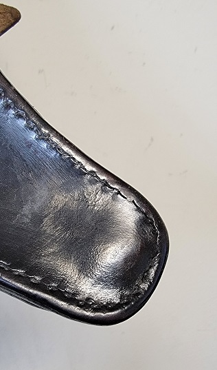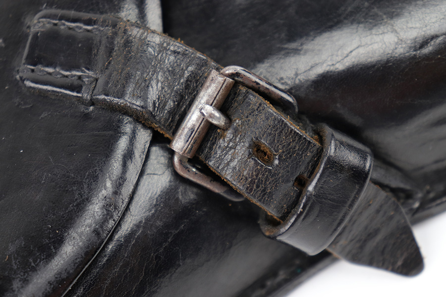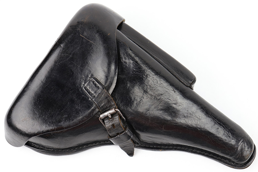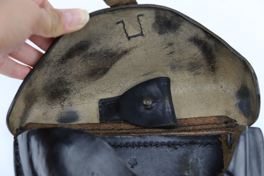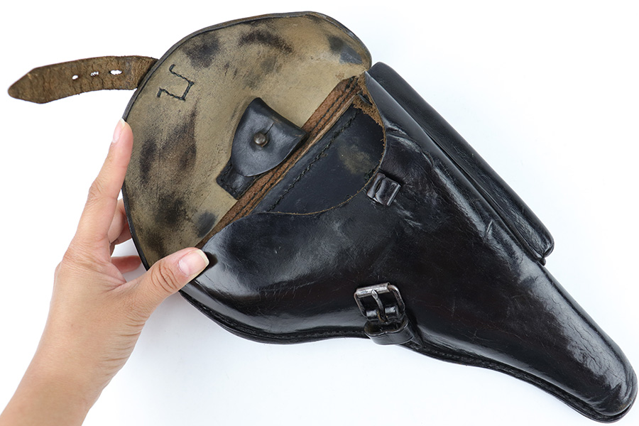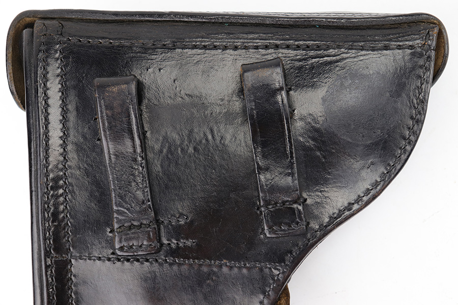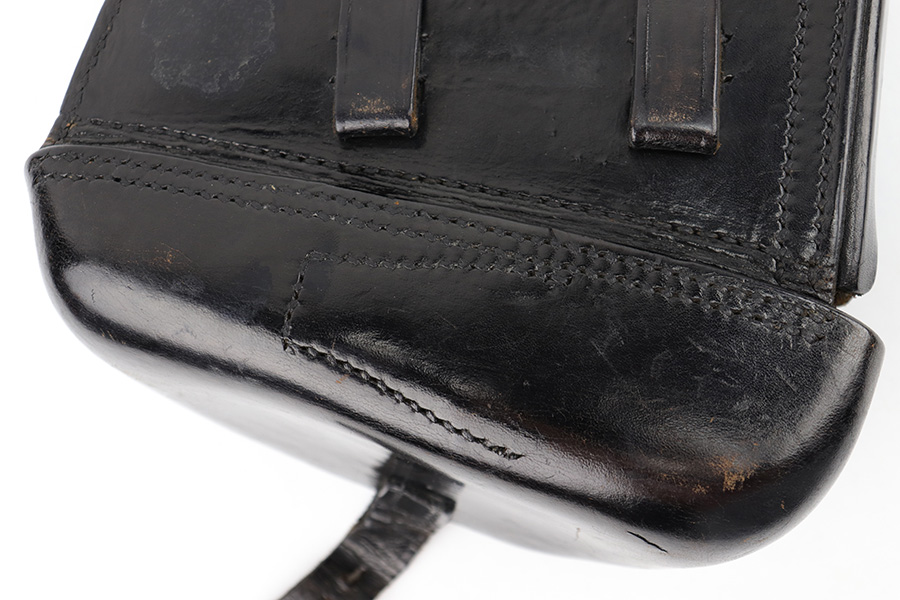 6/21/23 – This is an original Krieghoff Luger holster in excellent overall condition. The holster is WW2 era production with all black leather and stitching. The interior leather is stamped with a Krieghoff Eagle/2 proof stamp. There are no other markings. The leather exterior has some mild wrinkling and there is scuffing near the toe. Normal pliability and light use wear. The back leather has some residue from an added circular patch or sticker of some kind. The stitching is all tight, original and intact except for 2-3 stitches that are loose at the back-toe of leather. An excellent overall, all original example.