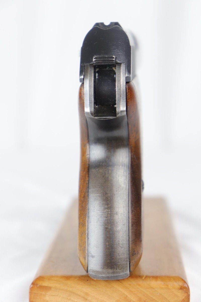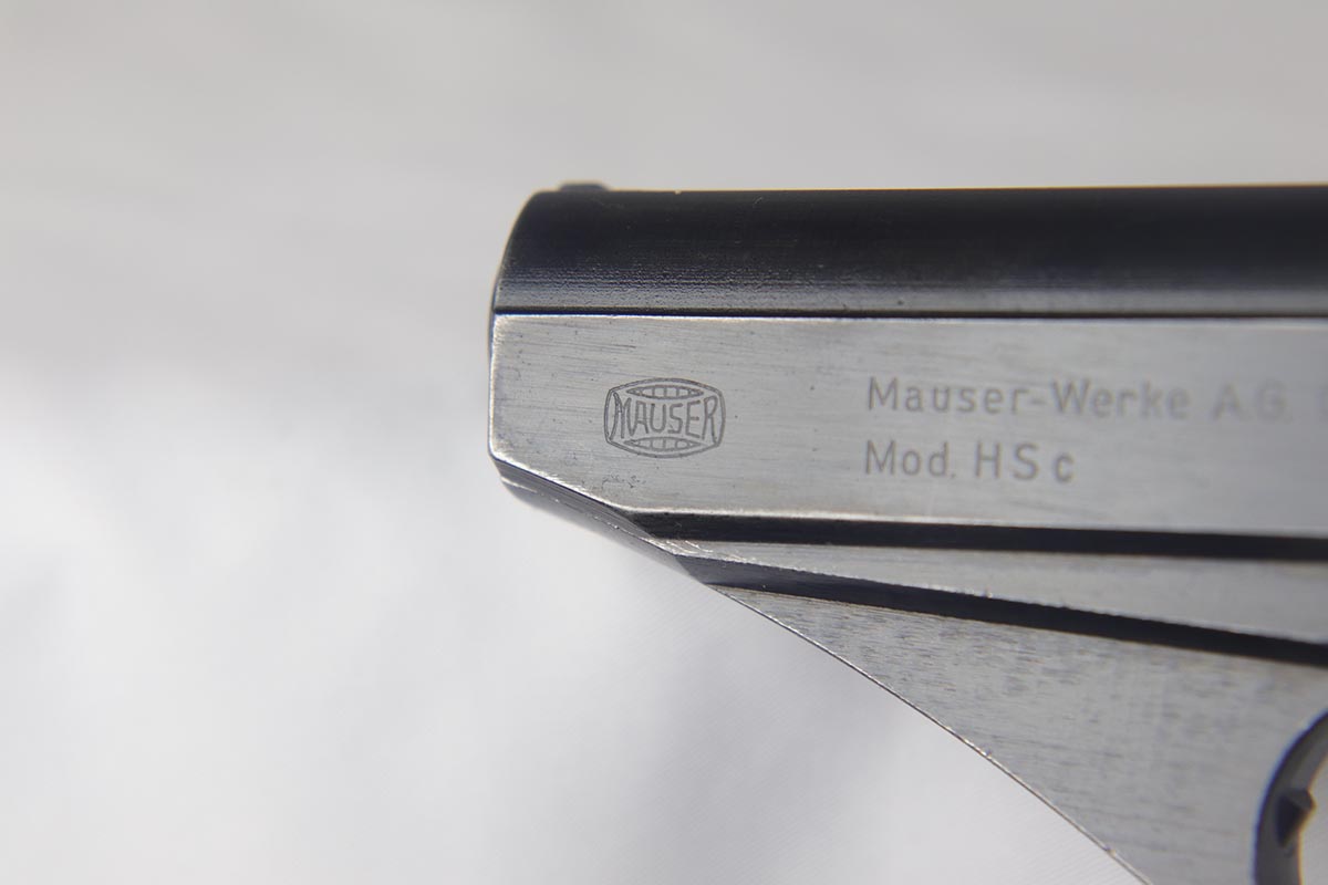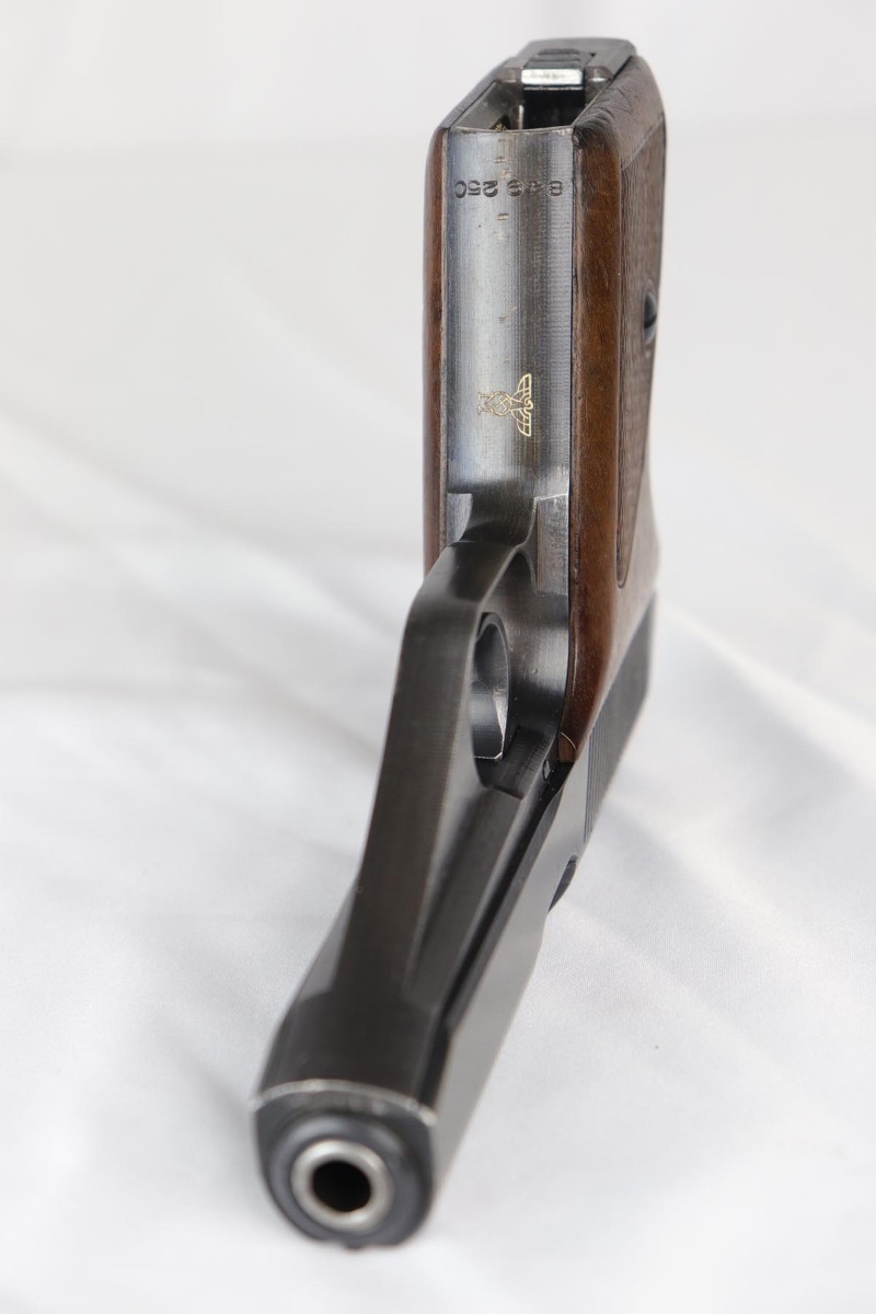 9/10/18 – This is an excellent example of a scarce Mauser HSc that was manufactured and issued to the German Navy in 1943. There were only 7,000 of this second variation pistol made, with Navy marking on the front strap. The original finish would be near-mint if not for the minor thinning of the back strap. Excellent original grips and blank magazine. Bore is shiny with strong rifling.