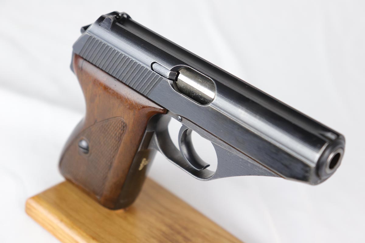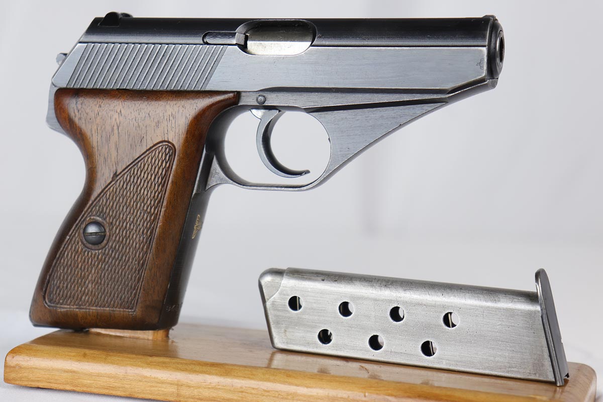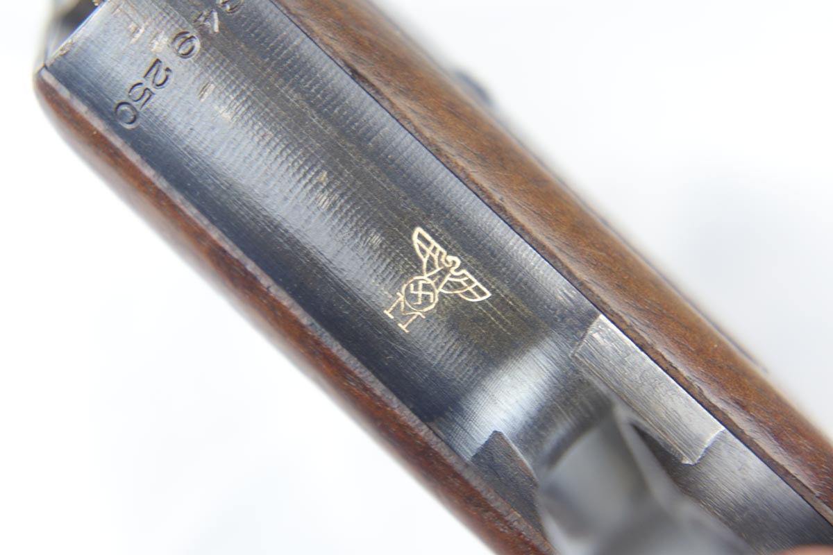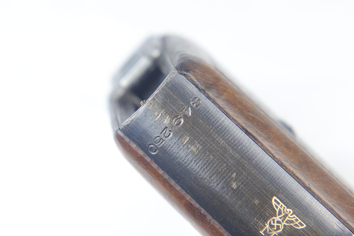 9/10/18 – This is an excellent example of a scarce Mauser HSc that was manufactured and issued to the German Navy in 1943. There were only 7,000 of this second variation pistol made, with Navy marking on the front strap. The original finish would be near-mint if not for the minor thinning of the back strap. Excellent original grips and blank magazine. Bore is shiny with strong rifling.
