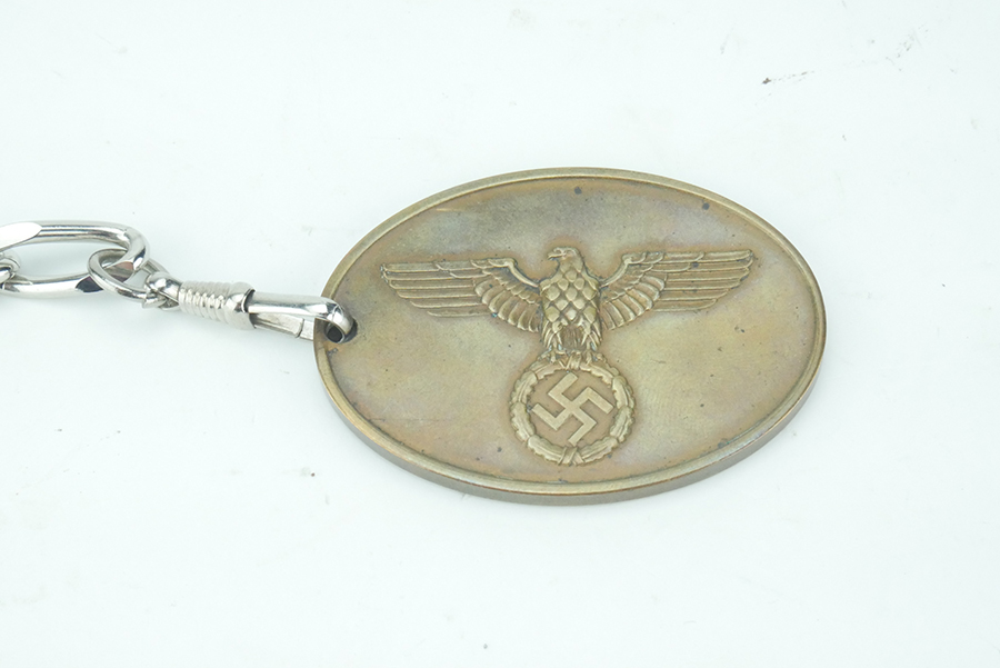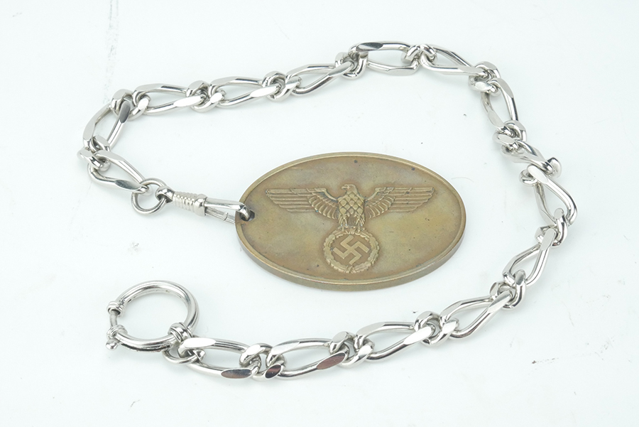 8/12/24 – This is an excellent German Kripo badge warrant disc. These were used by the criminal police for surprise inspections and would act as the equivalent of a search warrant for the officer carrying this disc. The badge is numbered 11761, and in excellent overall condition. Minimal surface wear and aging. While the disc is original, it appears it was cleaned with coin cleaner at some point, which caused (minor) visible color streaking. Comes with reproduction chain.