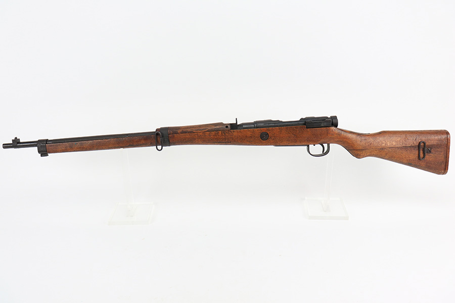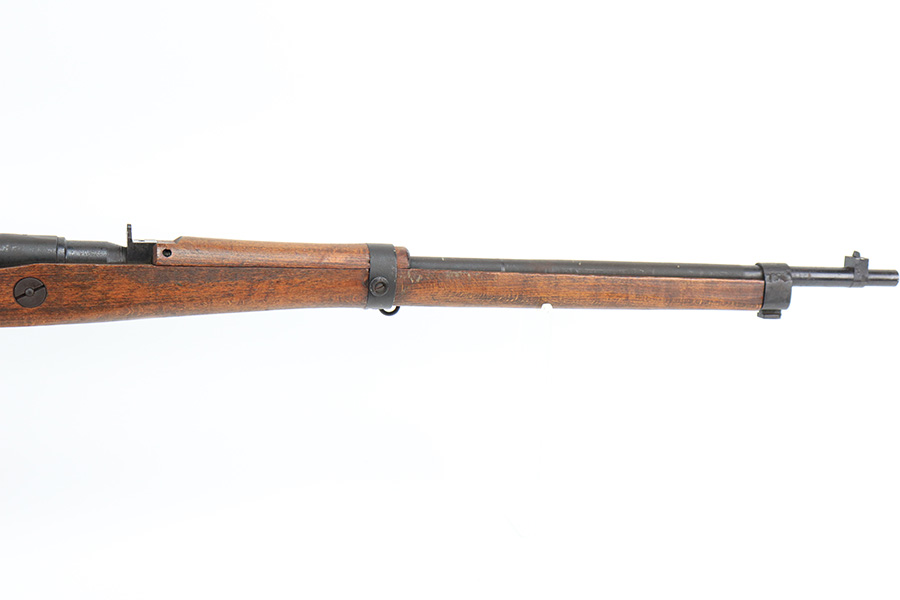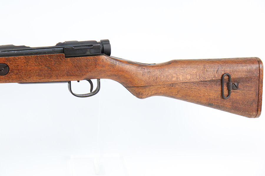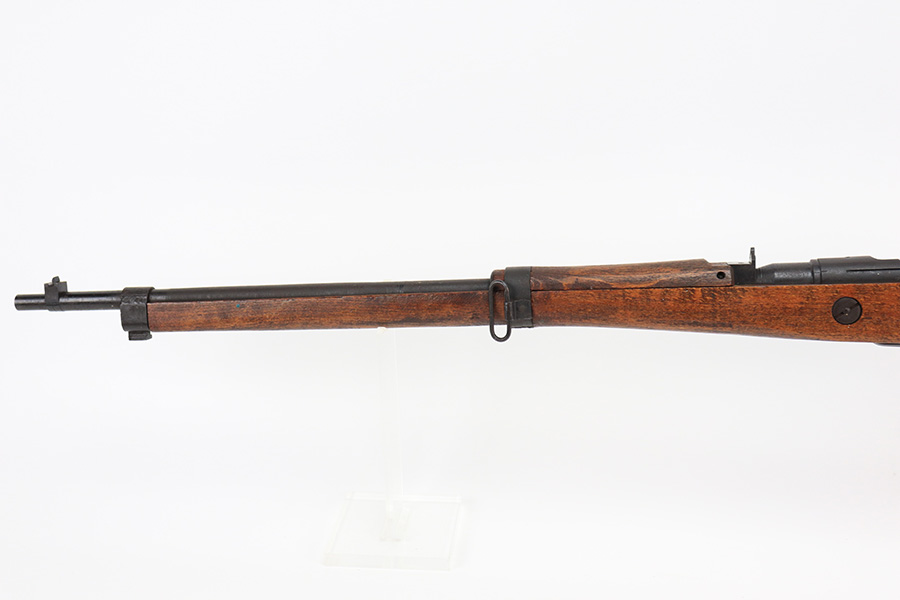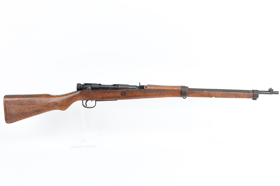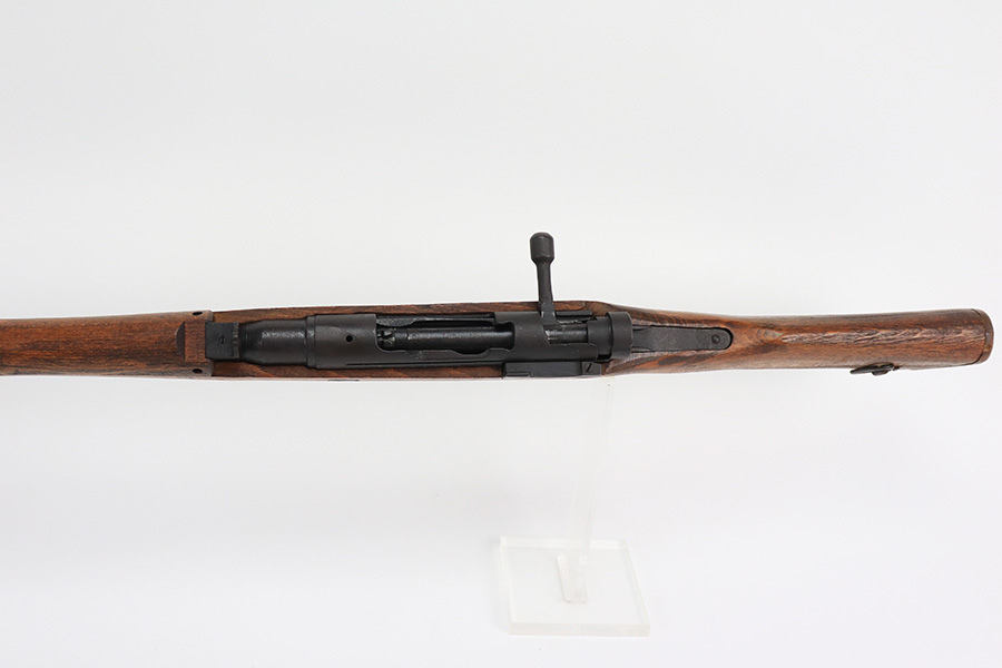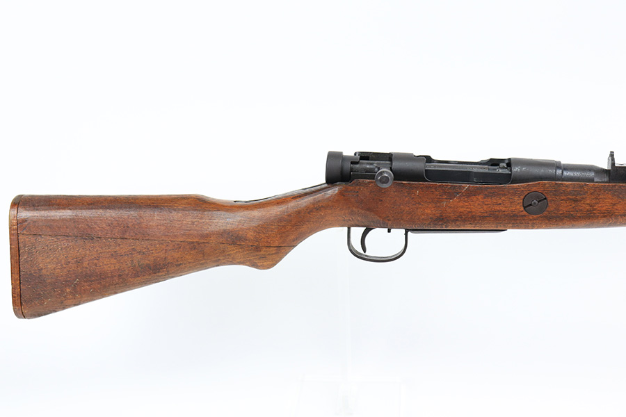 6/7/22 – This is an excellent example of a “last-ditch” Arisaka Type 99 rifle issued to the Japanese military at the very end of WW2. It is all matching and has the proper late war features such as crude bolt handle, peep rear sight, wood butt plate, and rough machining throughout. The imperial mum stamp on the receiver has been ground. There is very little actual finish loss, but there are tiny dots of oxidation and light brown patina throughout. Excellent stock. The foregrip is a little loose and wiggles a little bit. Mint bore.