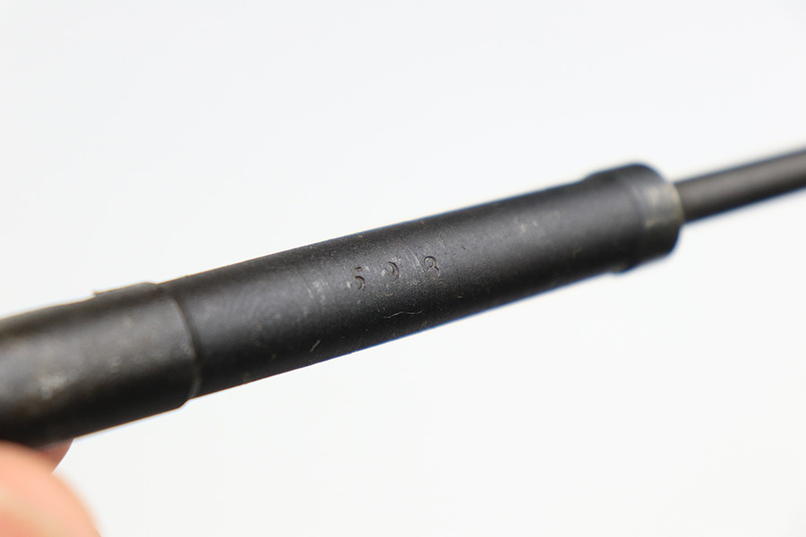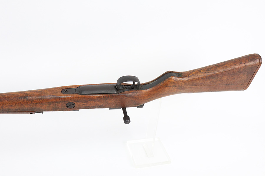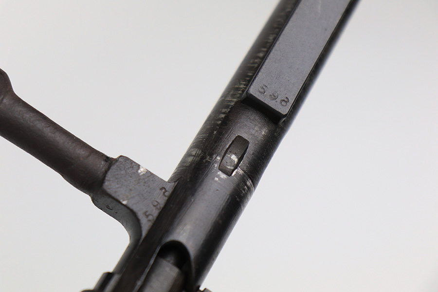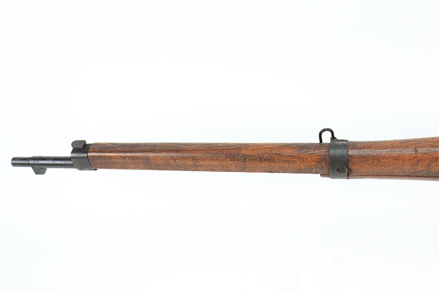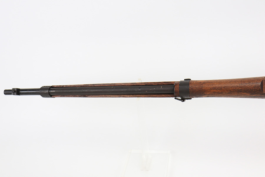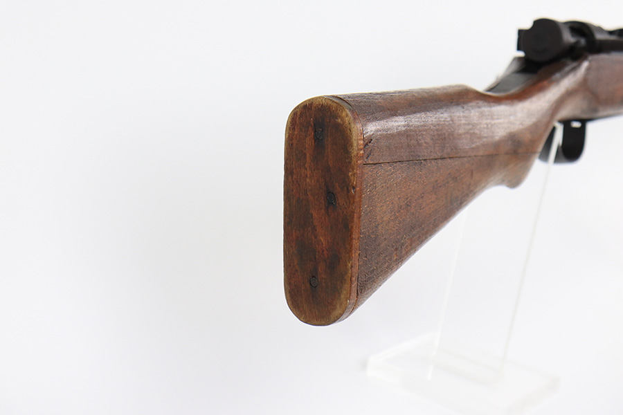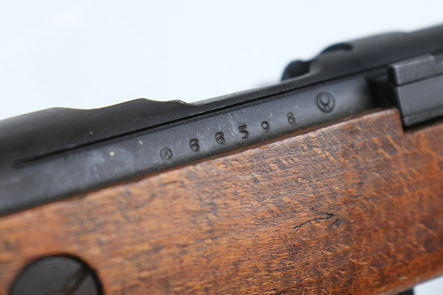 6/7/22 – This is an excellent example of a “last-ditch” Arisaka Type 99 rifle issued to the Japanese military at the very end of WW2. It is all matching and has the proper late war features such as crude bolt handle, peep rear sight, wood butt plate, and rough machining throughout. The imperial mum stamp on the receiver has been ground. There is very little actual finish loss, but there are tiny dots of oxidation and light brown patina throughout. Excellent stock. The foregrip is a little loose and wiggles a little bit. Mint bore.