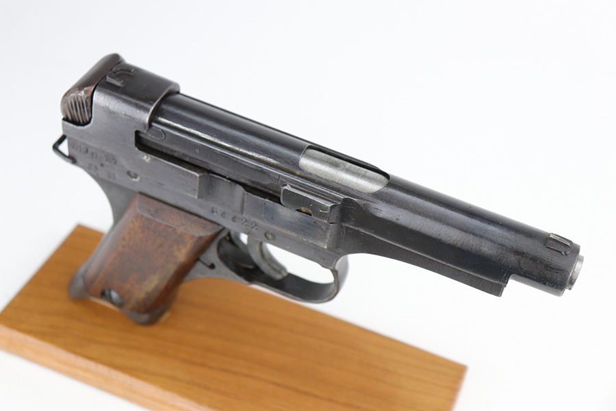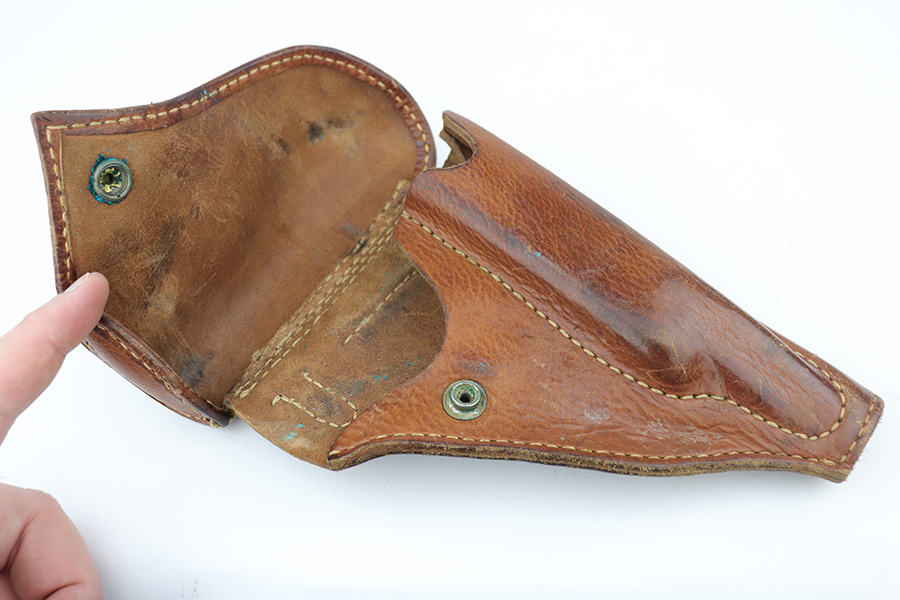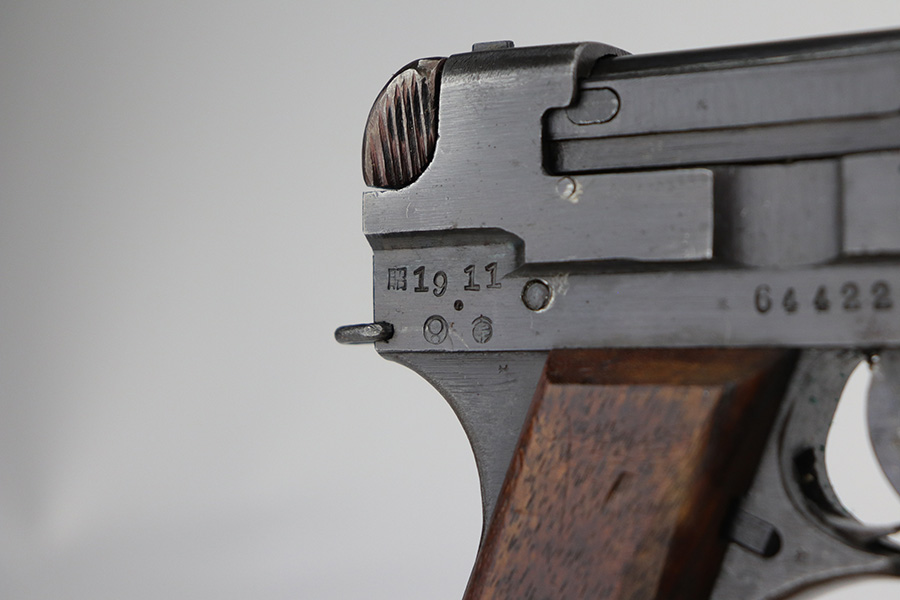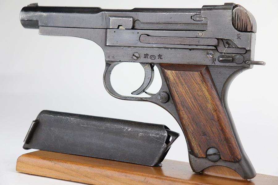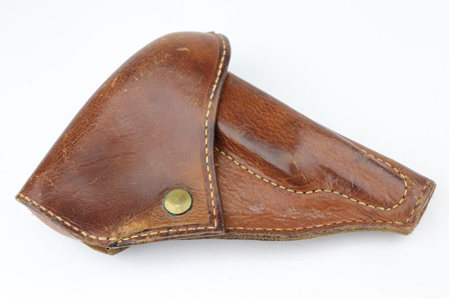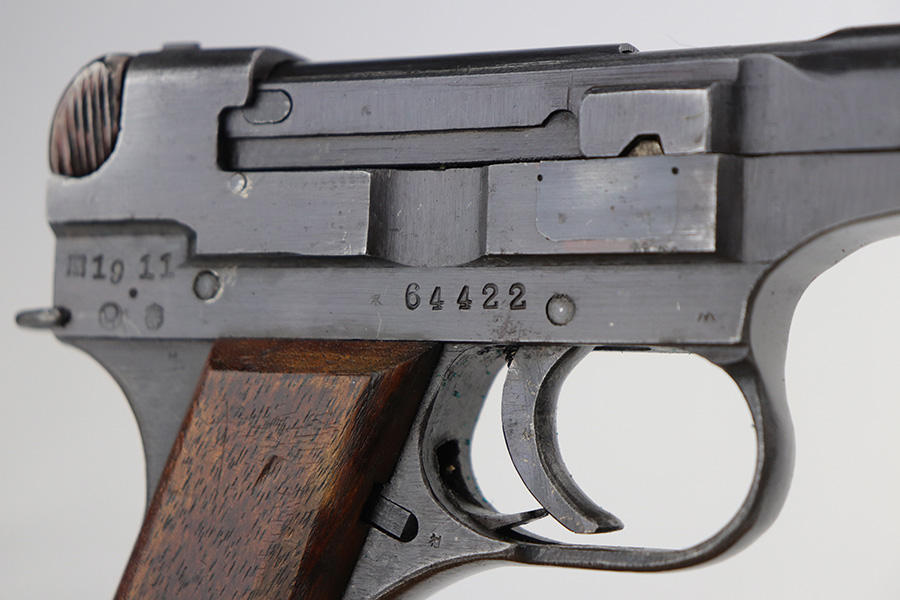 9/24/21 – This is an excellent example of a late-war Nambu Type 94 rig issued to the Japanese military in November of 1944. The gun is all matching and has the proper Japanese proofs. It comes with an excellent leather holster, one original matching magazine, and a period-correct mismatched spare magazine. The gun also comes with excellent un-numbered late-war slab-side wood grips. It has retained about 96% of its original finish. There are hints of wear around the high edges, minor wear around the muzzle, and some minor thinning on the front strap. Some spotty oxidation on the front strap as well. Minty bore.