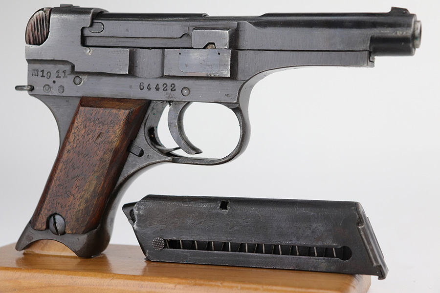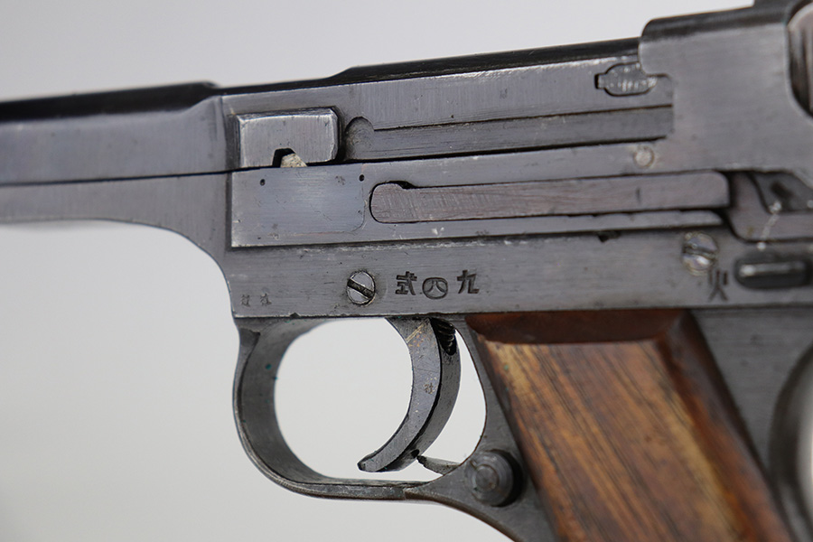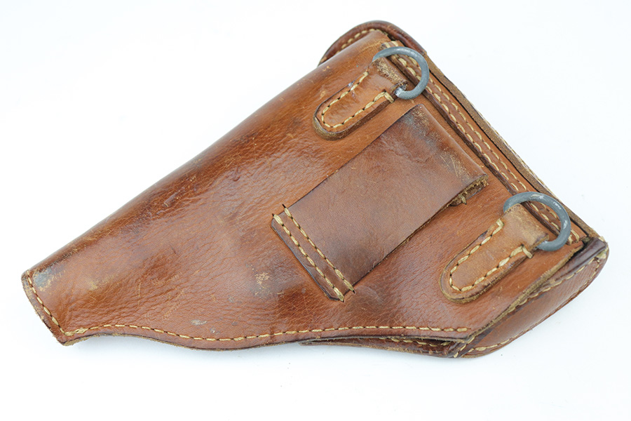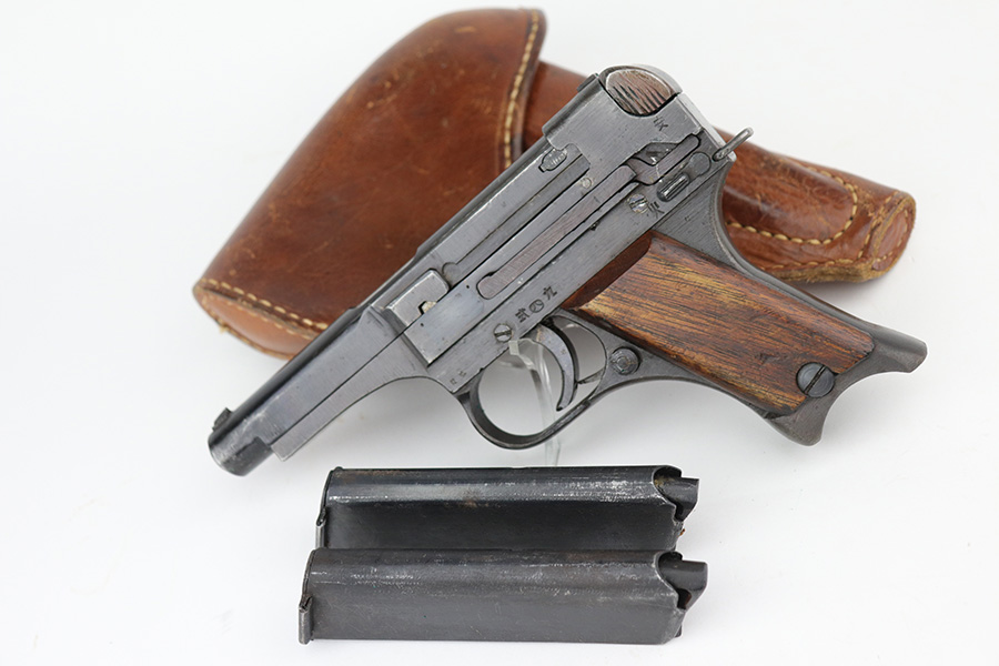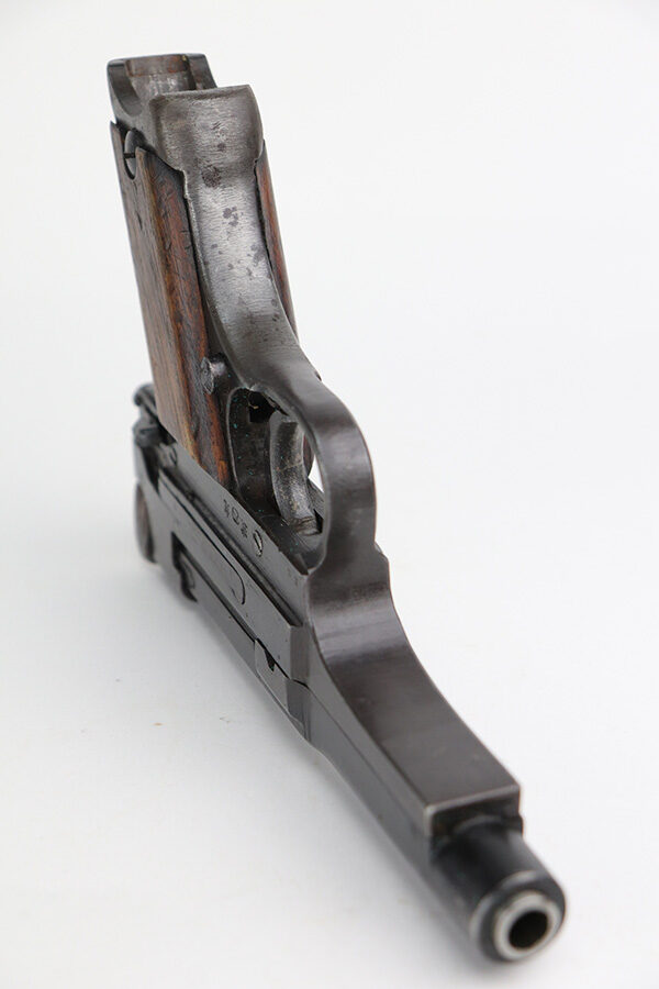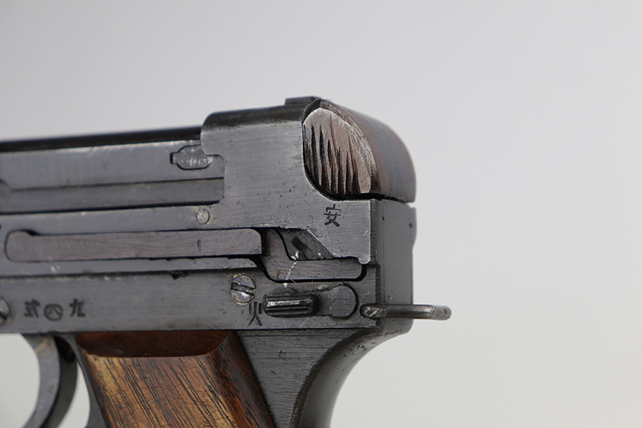 9/24/21 – This is an excellent example of a late-war Nambu Type 94 rig issued to the Japanese military in November of 1944. The gun is all matching and has the proper Japanese proofs. It comes with an excellent leather holster, one original matching magazine, and a period-correct mismatched spare magazine. The gun also comes with excellent un-numbered late-war slab-side wood grips. It has retained about 96% of its original finish. There are hints of wear around the high edges, minor wear around the muzzle, and some minor thinning on the front strap. Some spotty oxidation on the front strap as well. Minty bore.