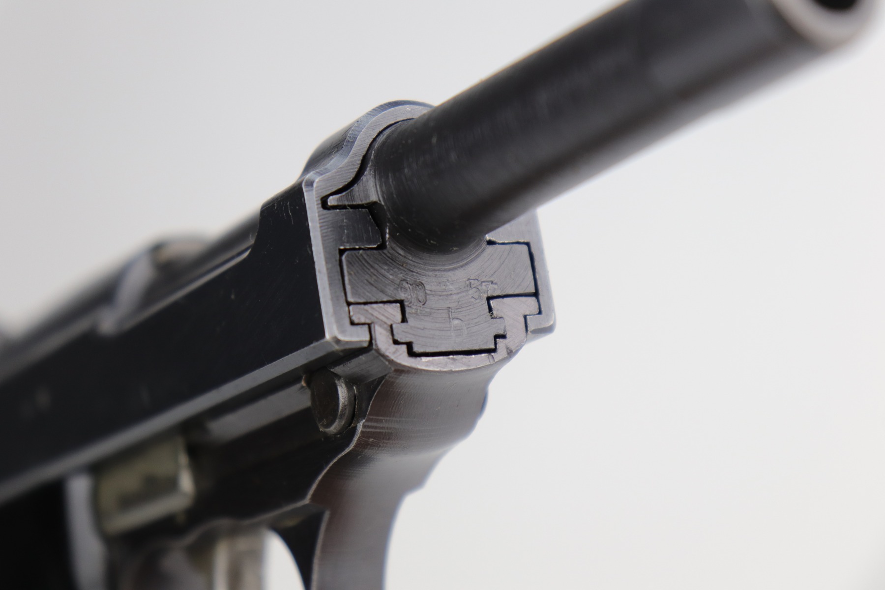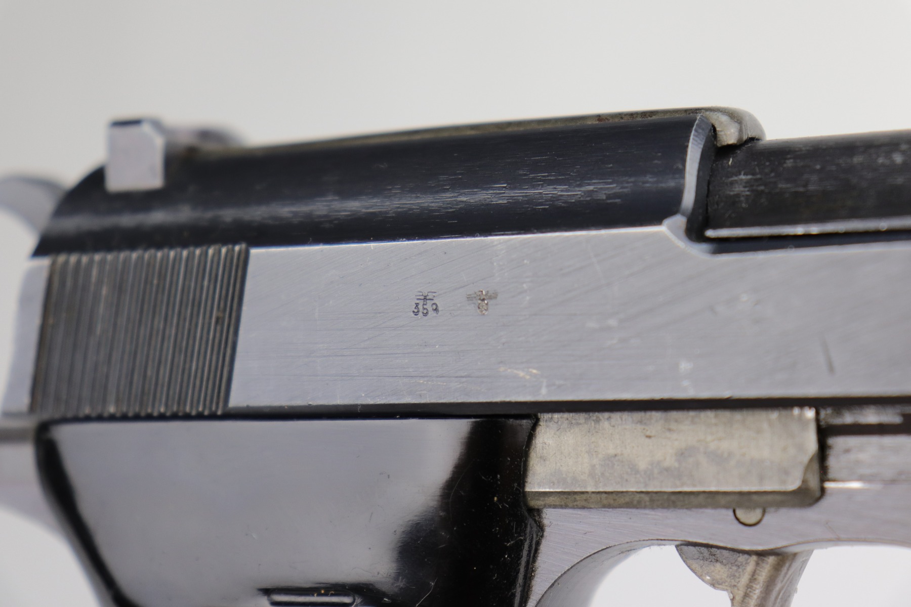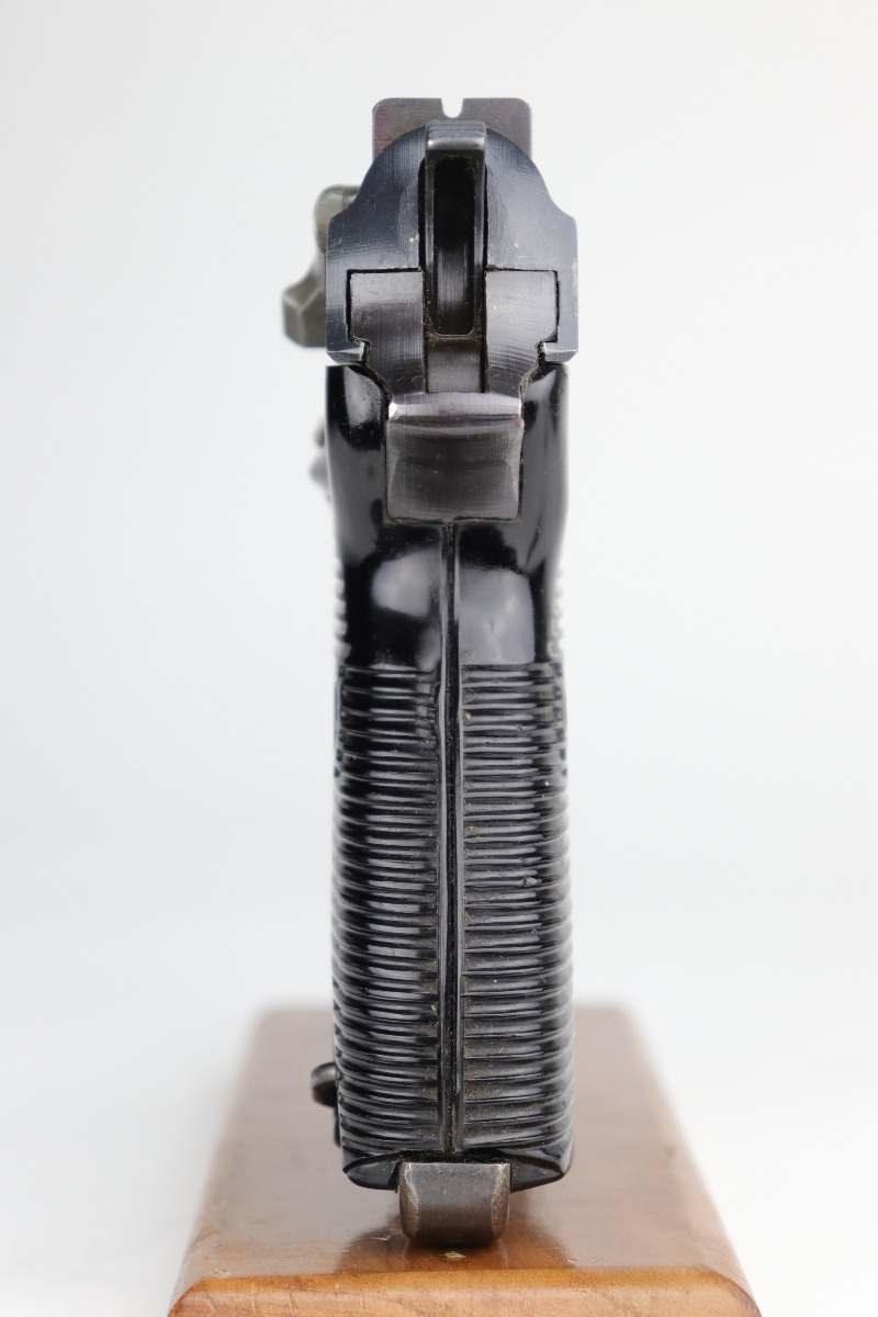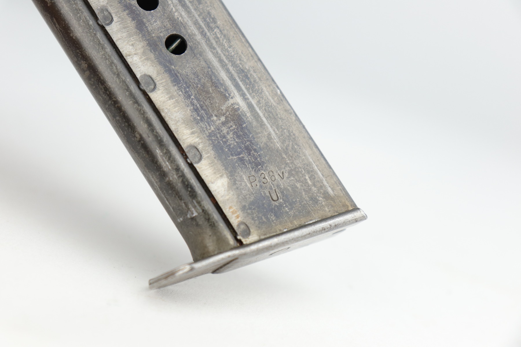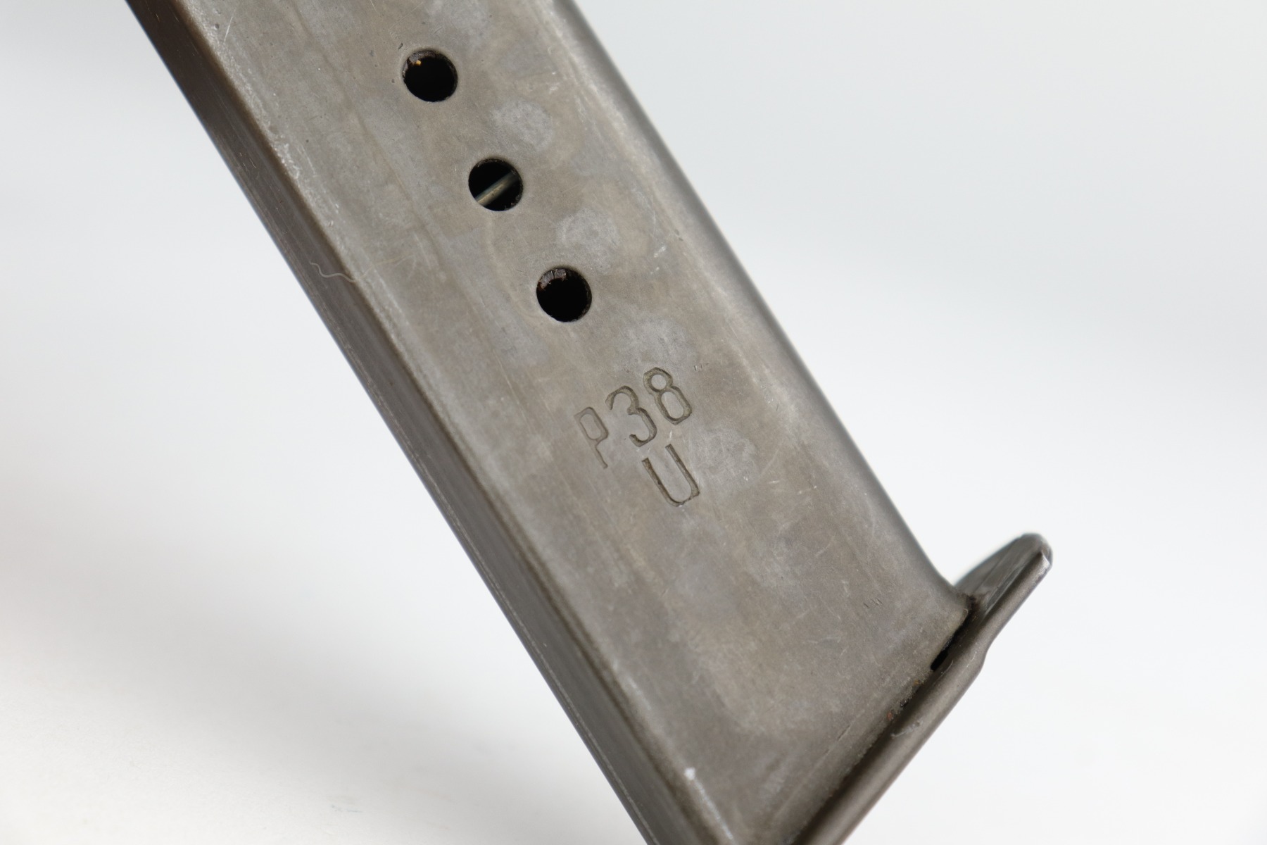 9/25/20 – This is an excellent example of a late-war Walther P.38 Rig manufactured for the Nazi military in 1945. It is all matching, has the “AC 45” Walther factory code, and has only two military acceptance proofs. Some of the small parts have a phosphate finish, typical for this variation. This particular gun has a Czech fnh barrel. The rig comes with a generic leather holster (no date or proofs) and two magazines. Both of the magazines are “U” marked, but one has a rare phosphate finish. The gun is in excellent condition, retaining about 98% of its original finish. There is very minor muzzle wear, light thinning on the front strap, and minor wear on the barrel through the ejection port. Excellent original grips. The bore is excellent – shiny with strong rifling. The gun is fully functional, including the de-cocker.